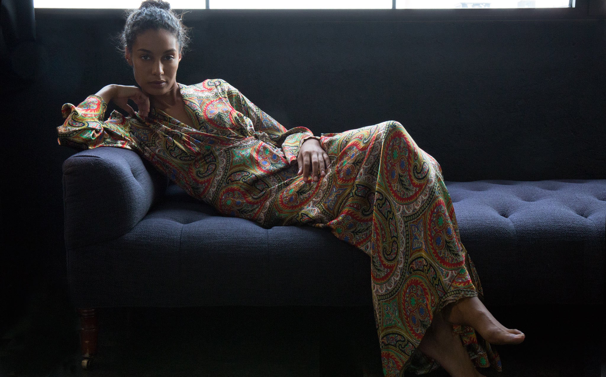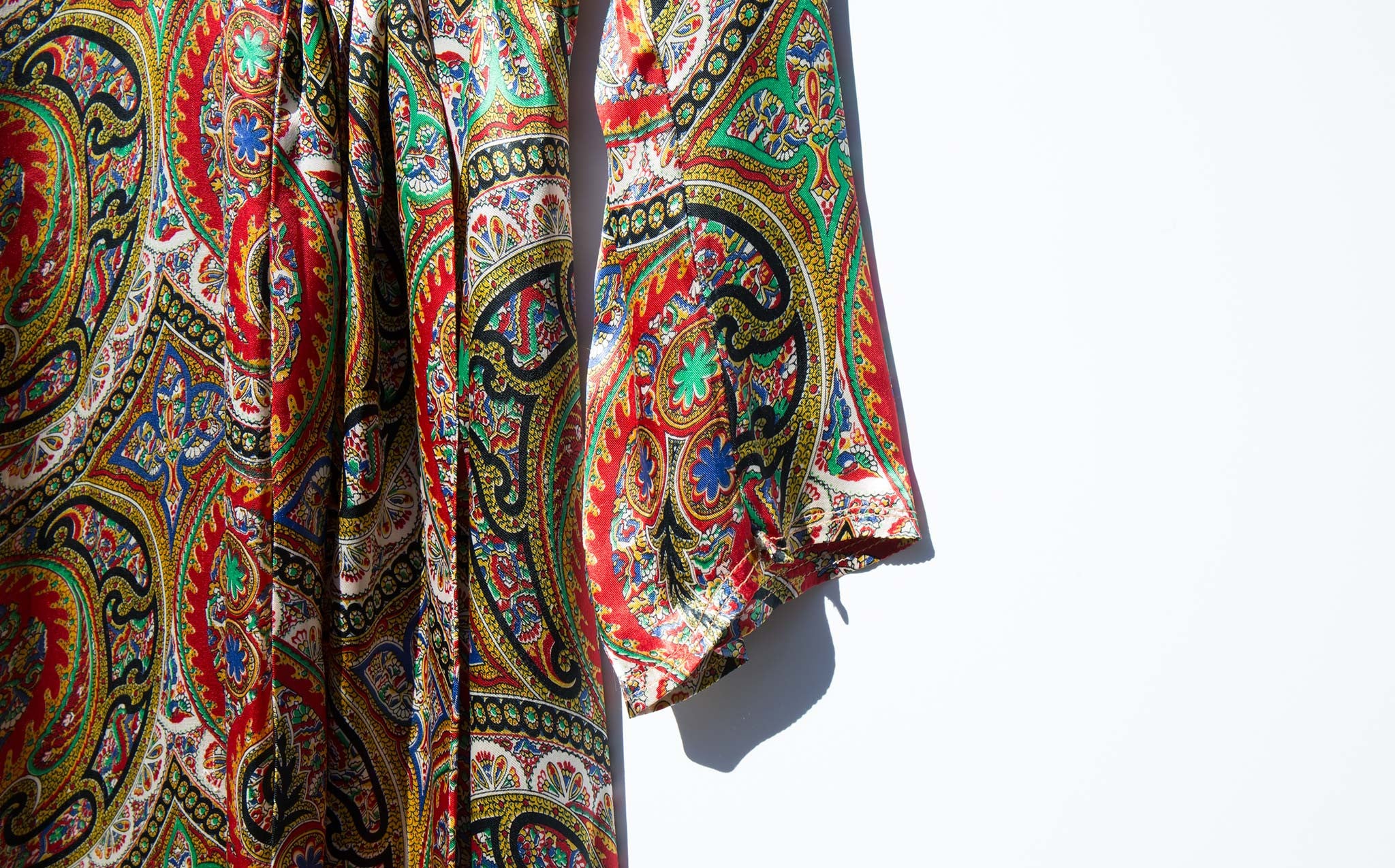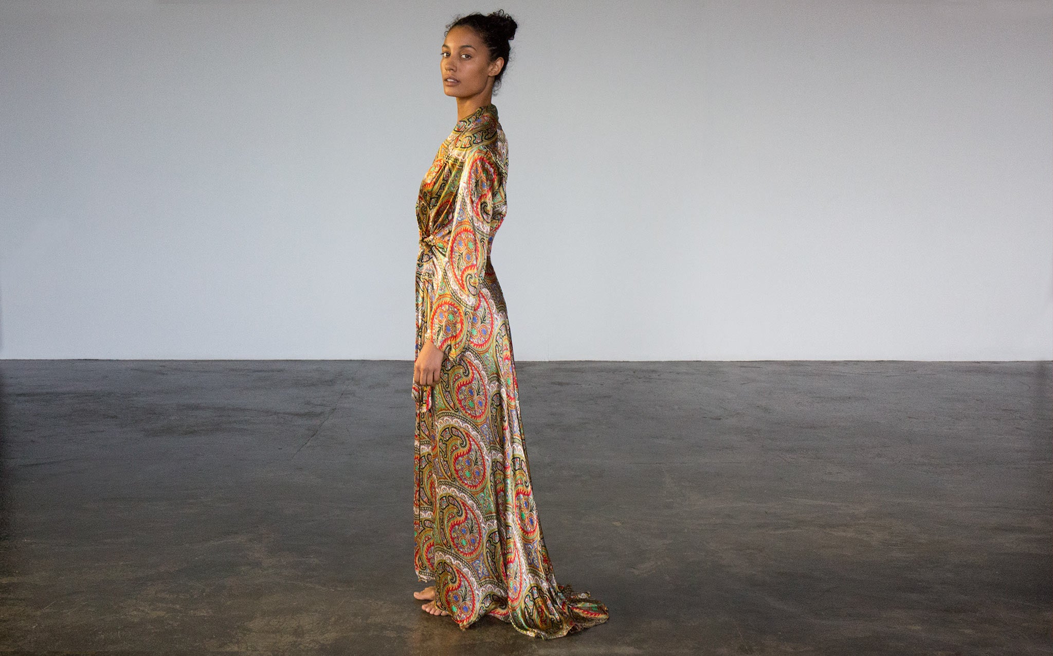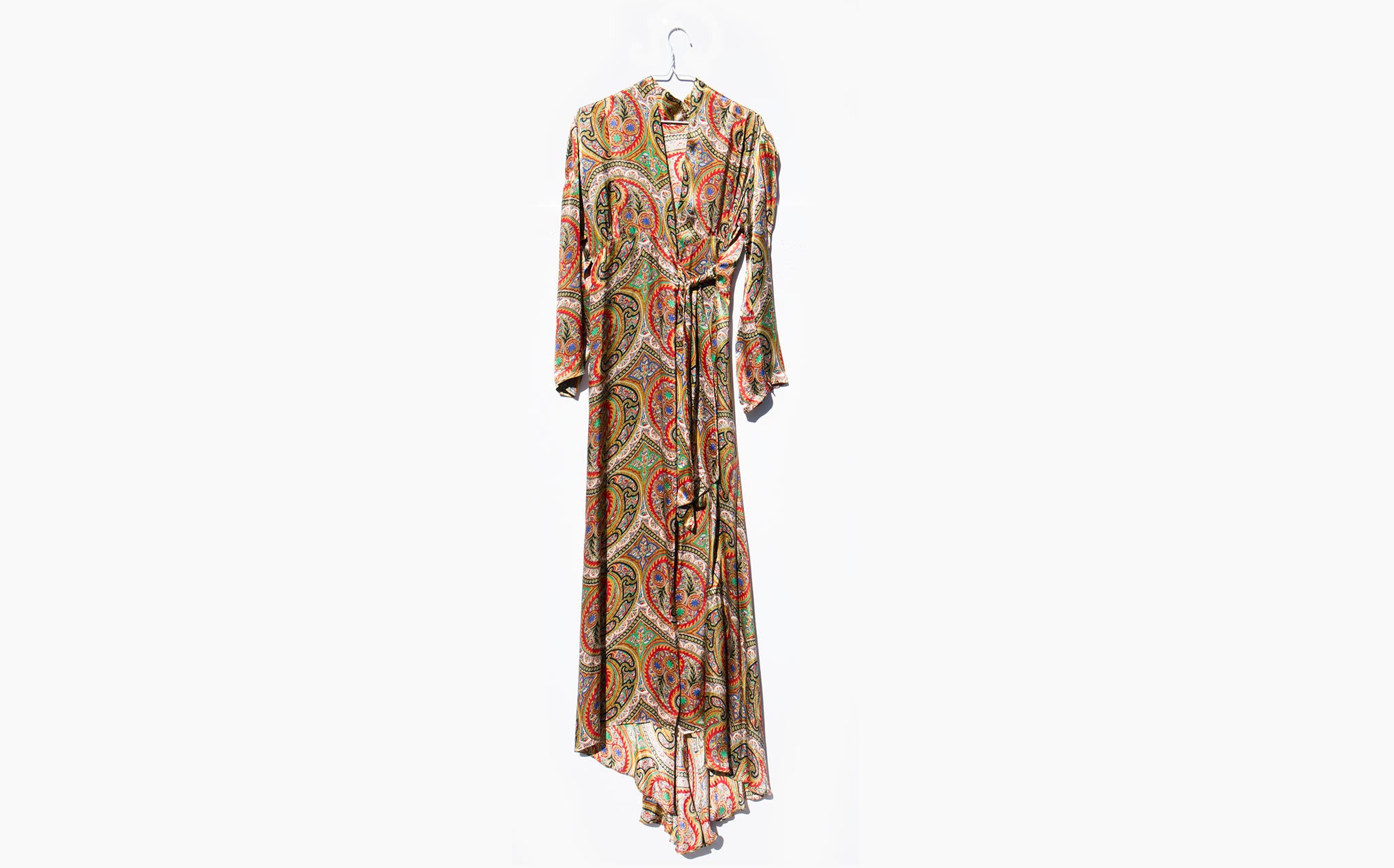 Vintage, sleek satin evening robe, epitomizing glamorous femininity and bygone era loungewear. Incredible and compelling with a bold paisley print and slight train at the back.