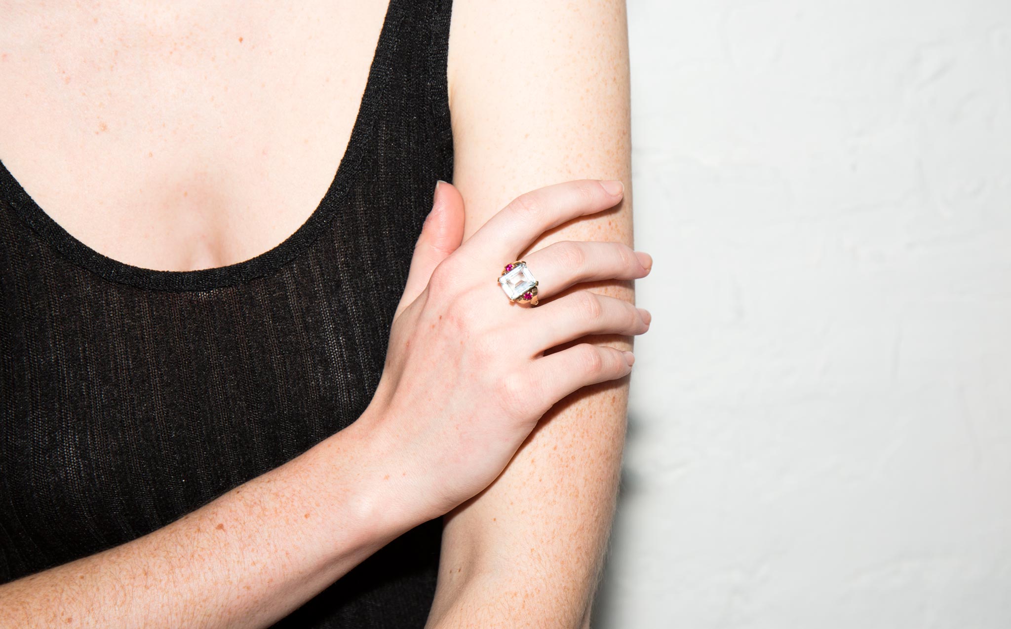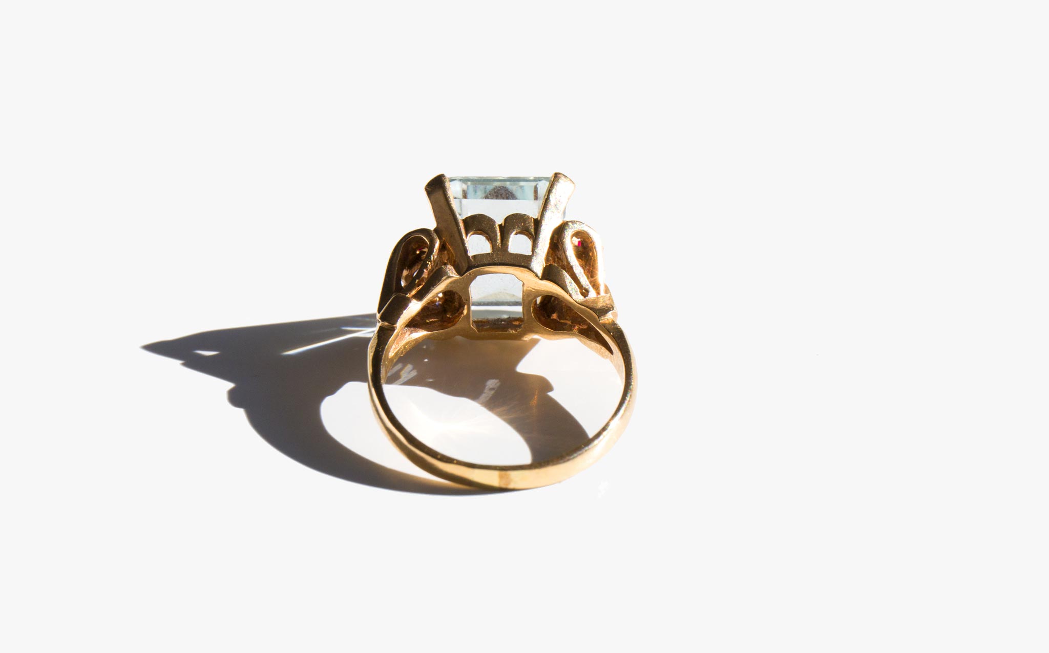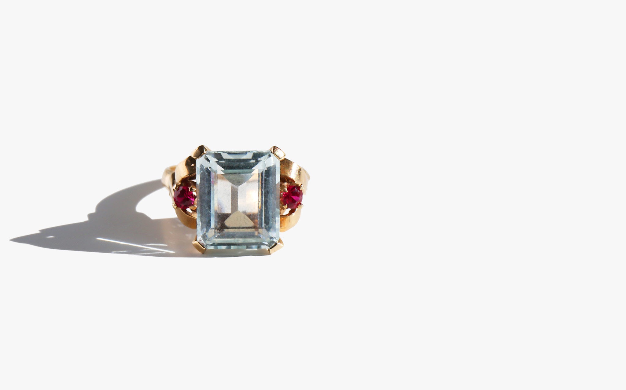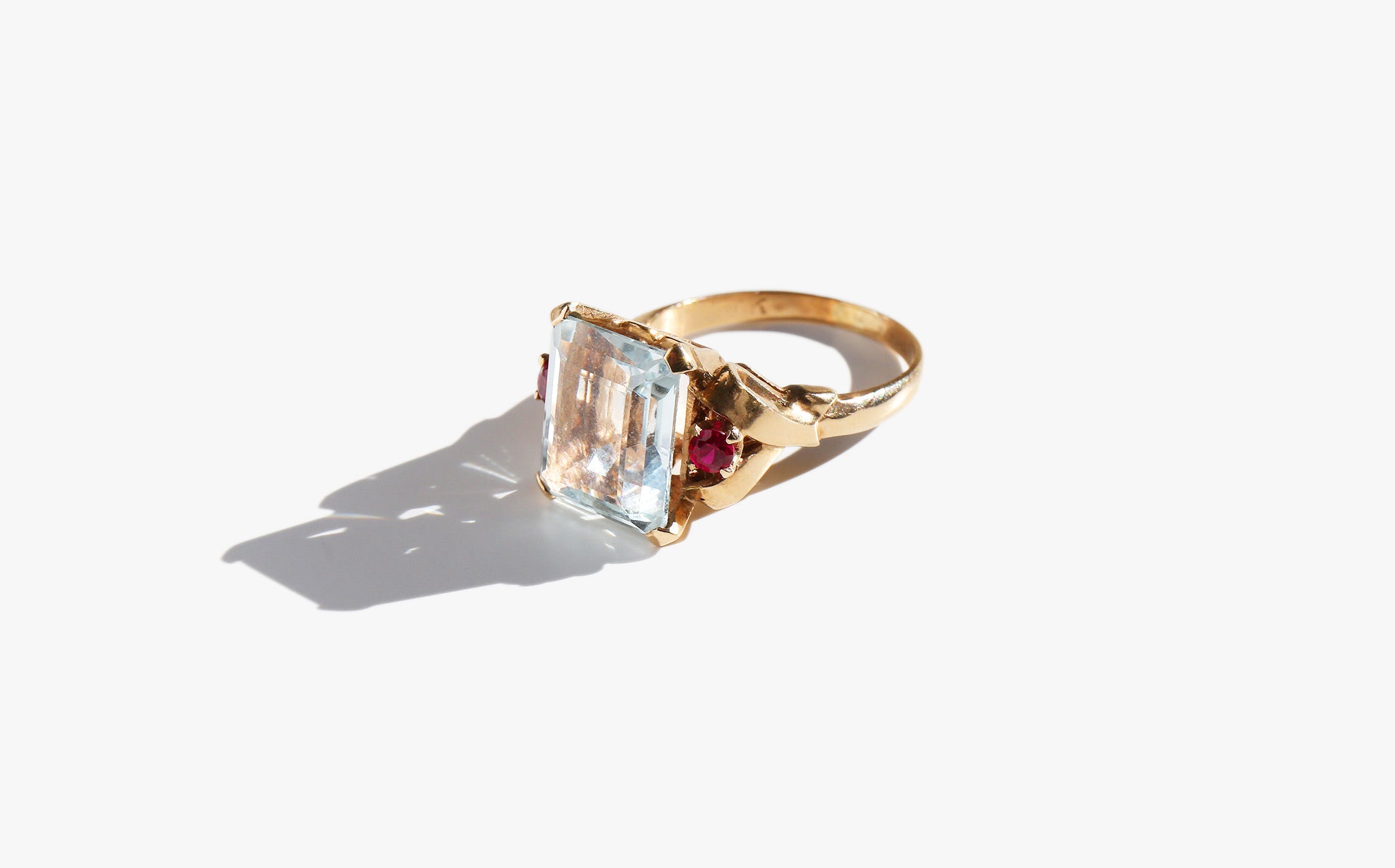 Brilliant and beautifully clear large ice blue aquamarine stone flanked with petite rubies in an ornate 14k gold setting.