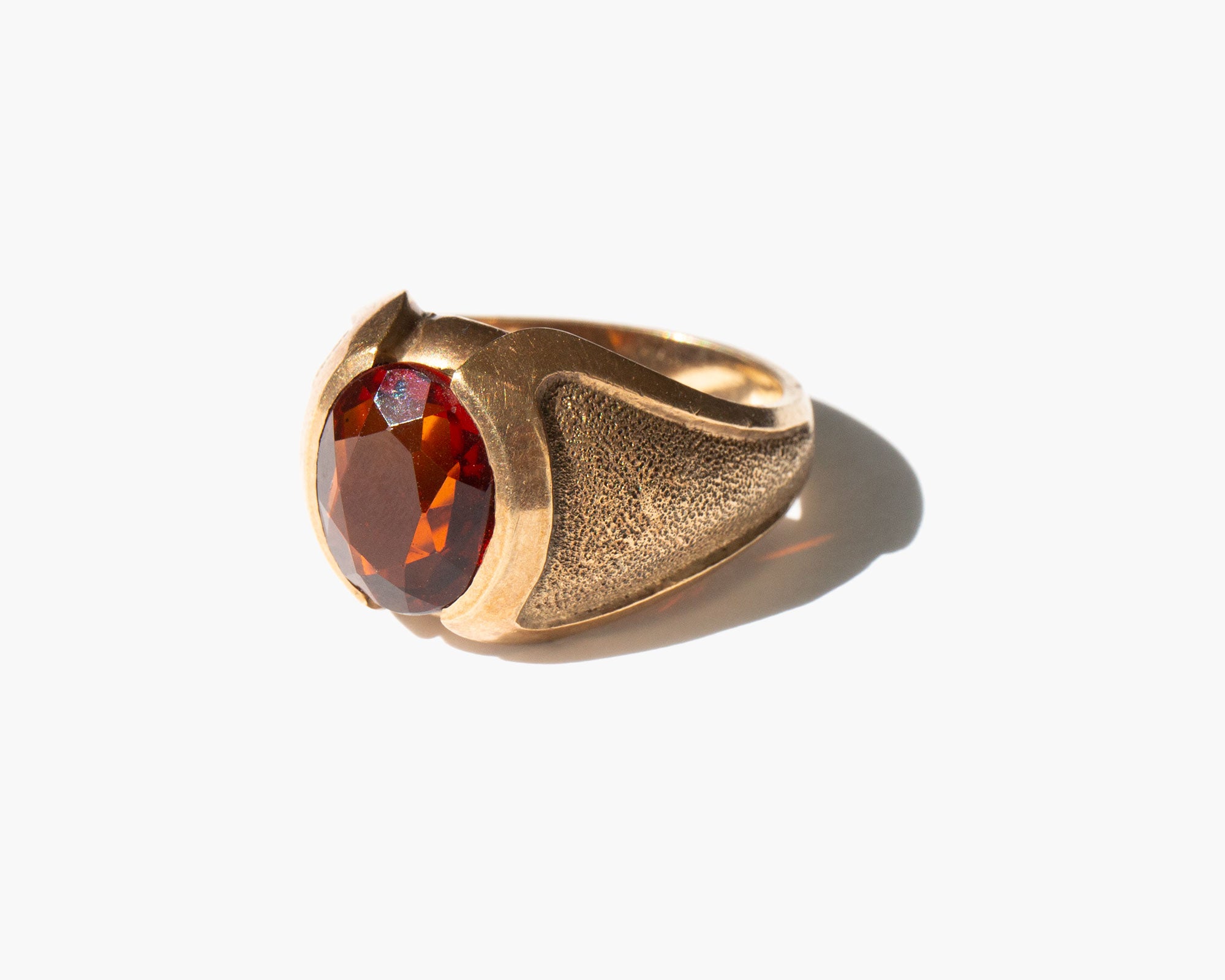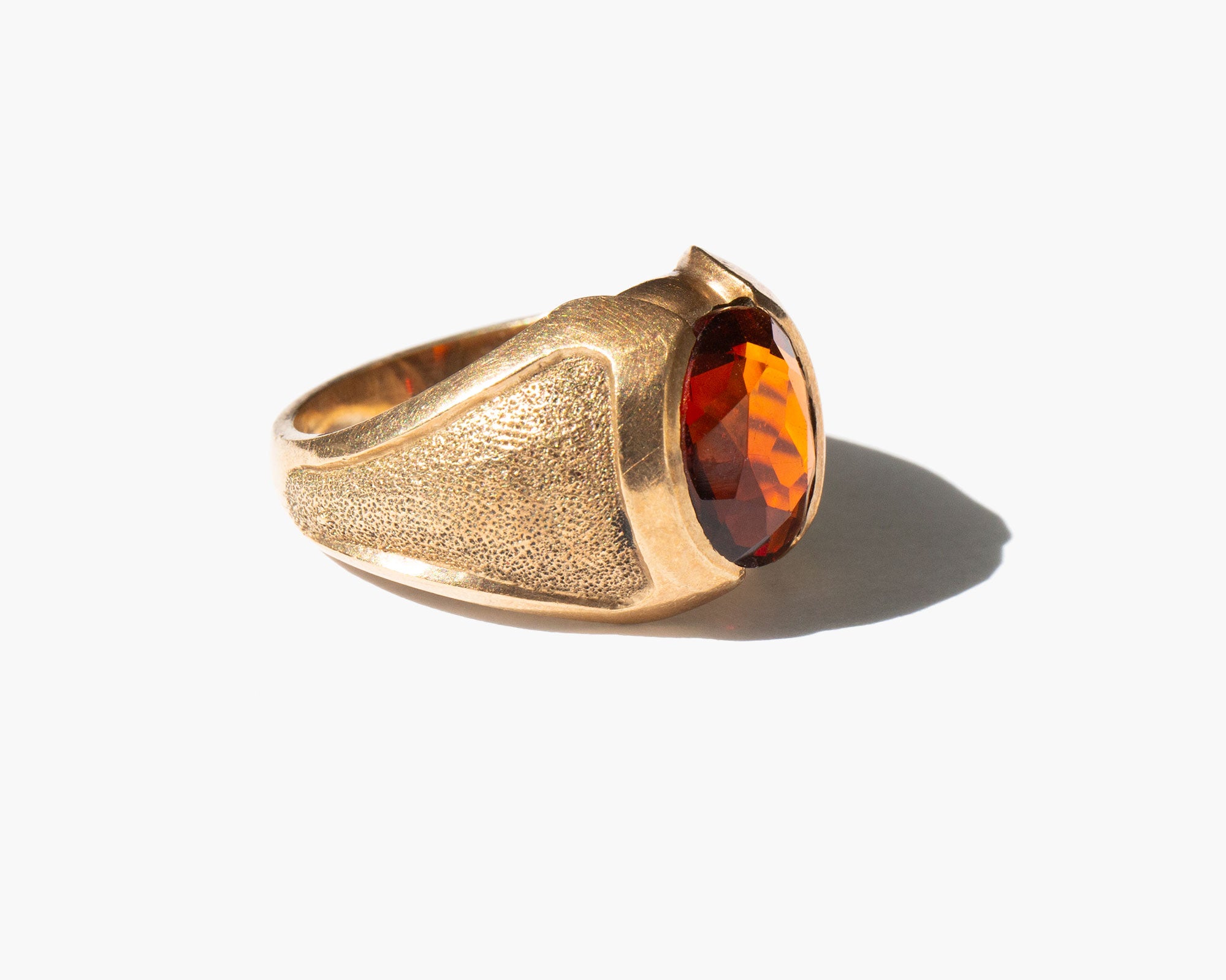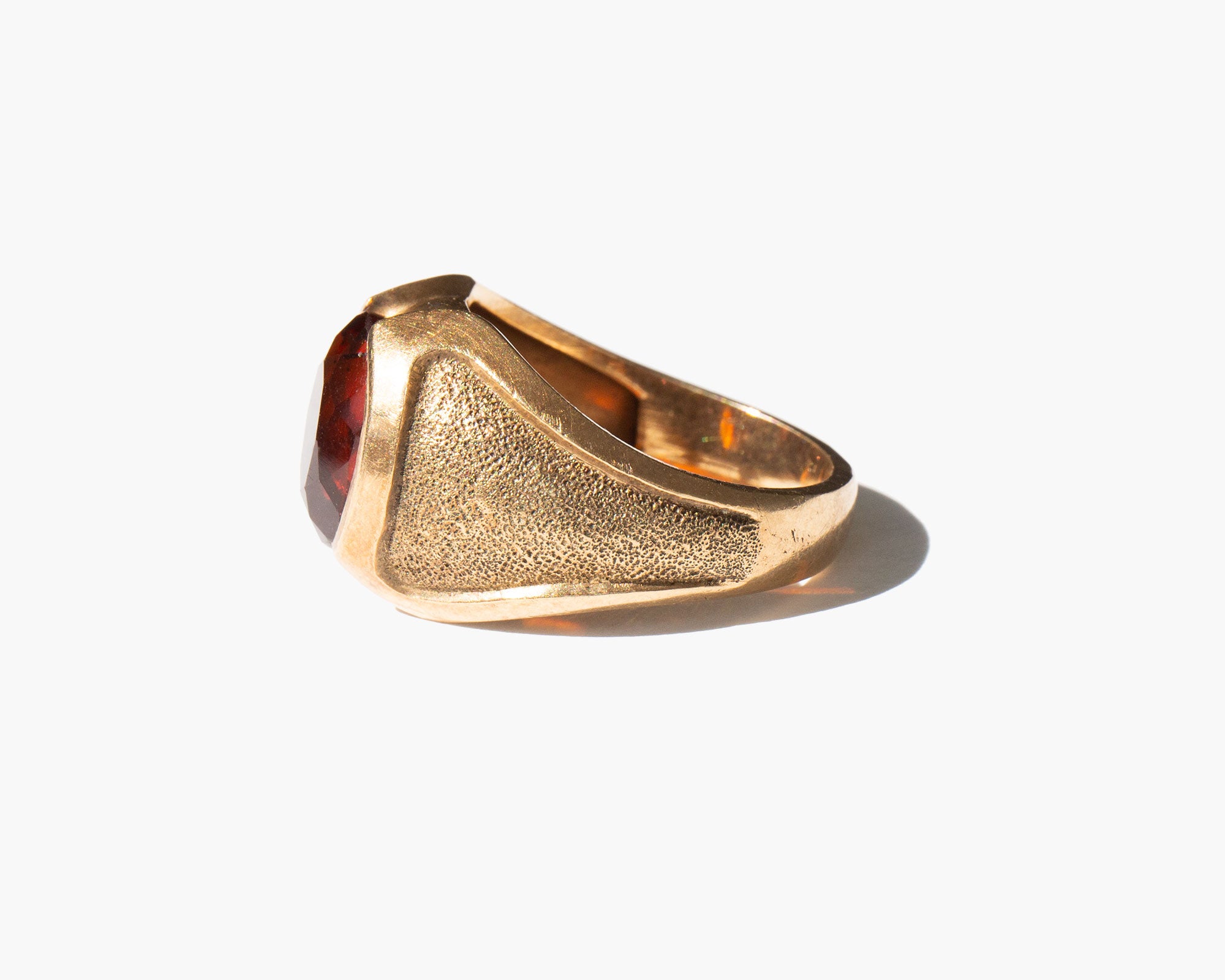Signet style 10k gold and garnet ring. A popular amulet of the middle ages, the garnet was thought to guard against evil spirits in the night and was a stone used for general protection against malevolent spiritual forces, that would guide the wearer through darkness, and even protect from poisoning. In more modern times the garnet is often gifted between friends and loved ones for protection before a period of extended separation.