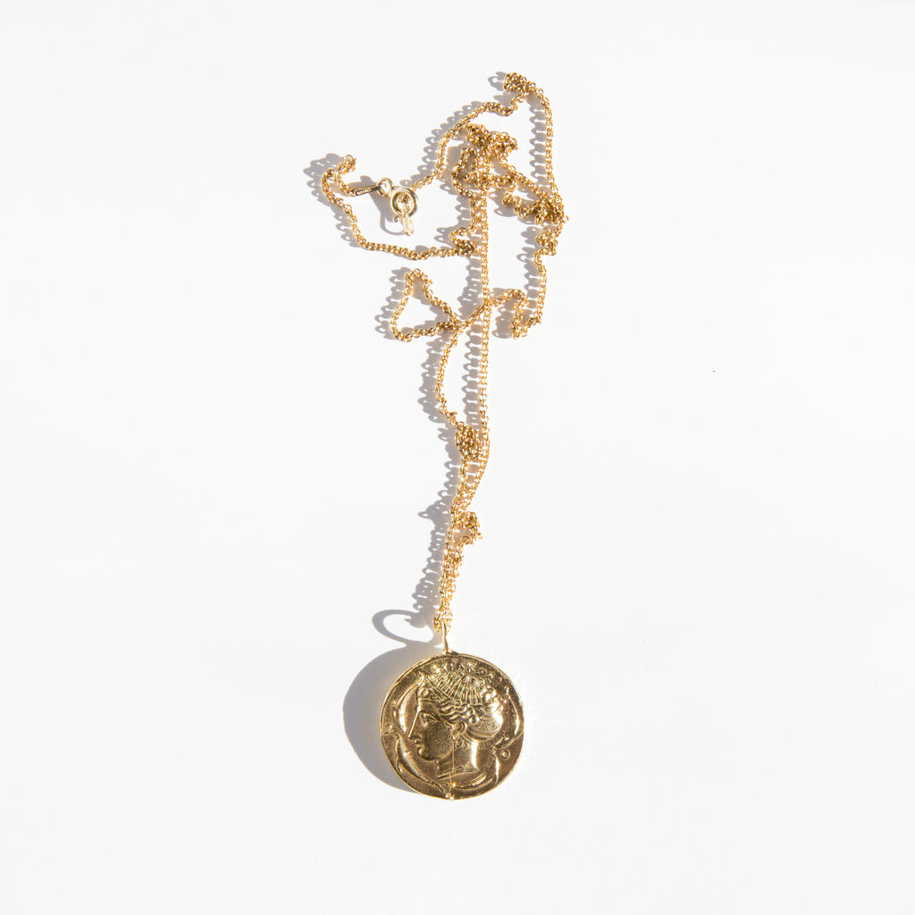 From the Pamela Card Late Antiquity Collection, handmade, 24 K gold plated sterling silver coin pendant depicting Aphrodite, the ancient Greek goddess of love, beauty and pleasure. The visage is encircled with dolphins, symbols of romance that were often associated with her.