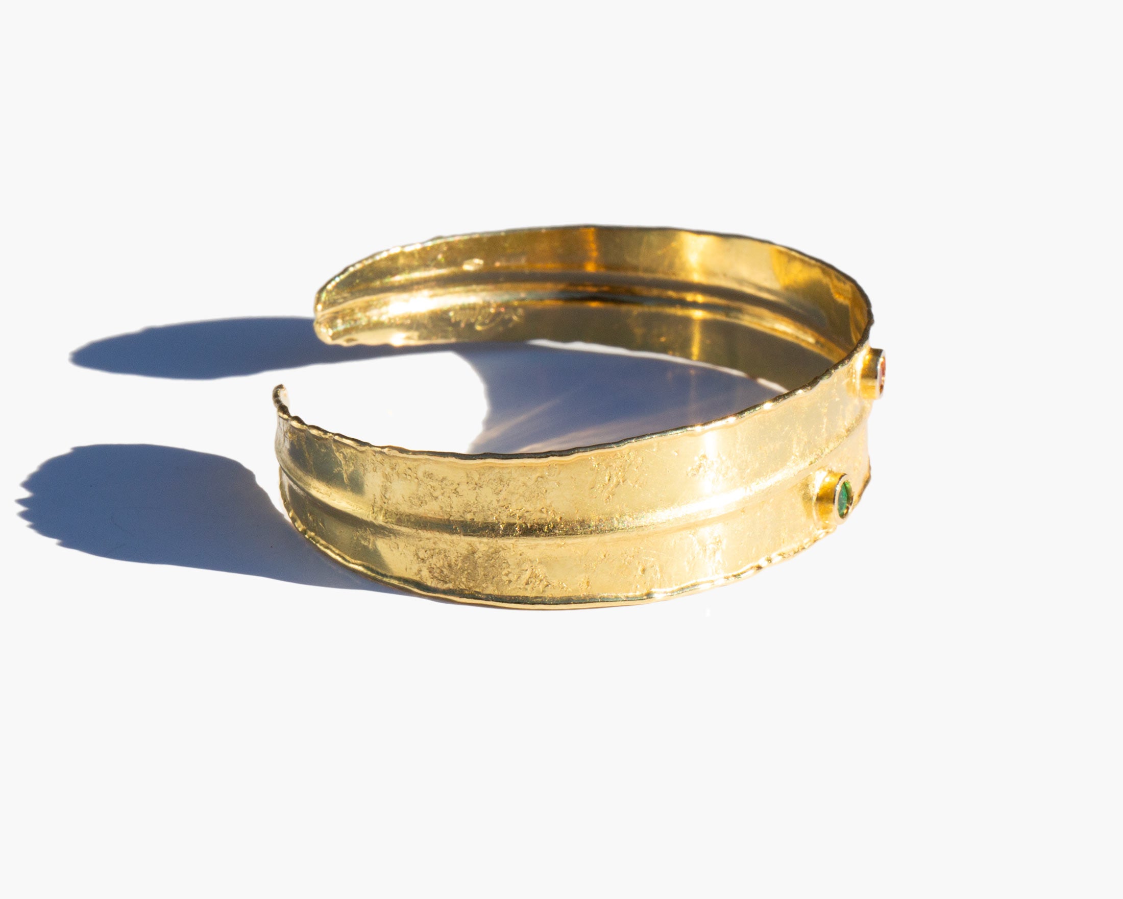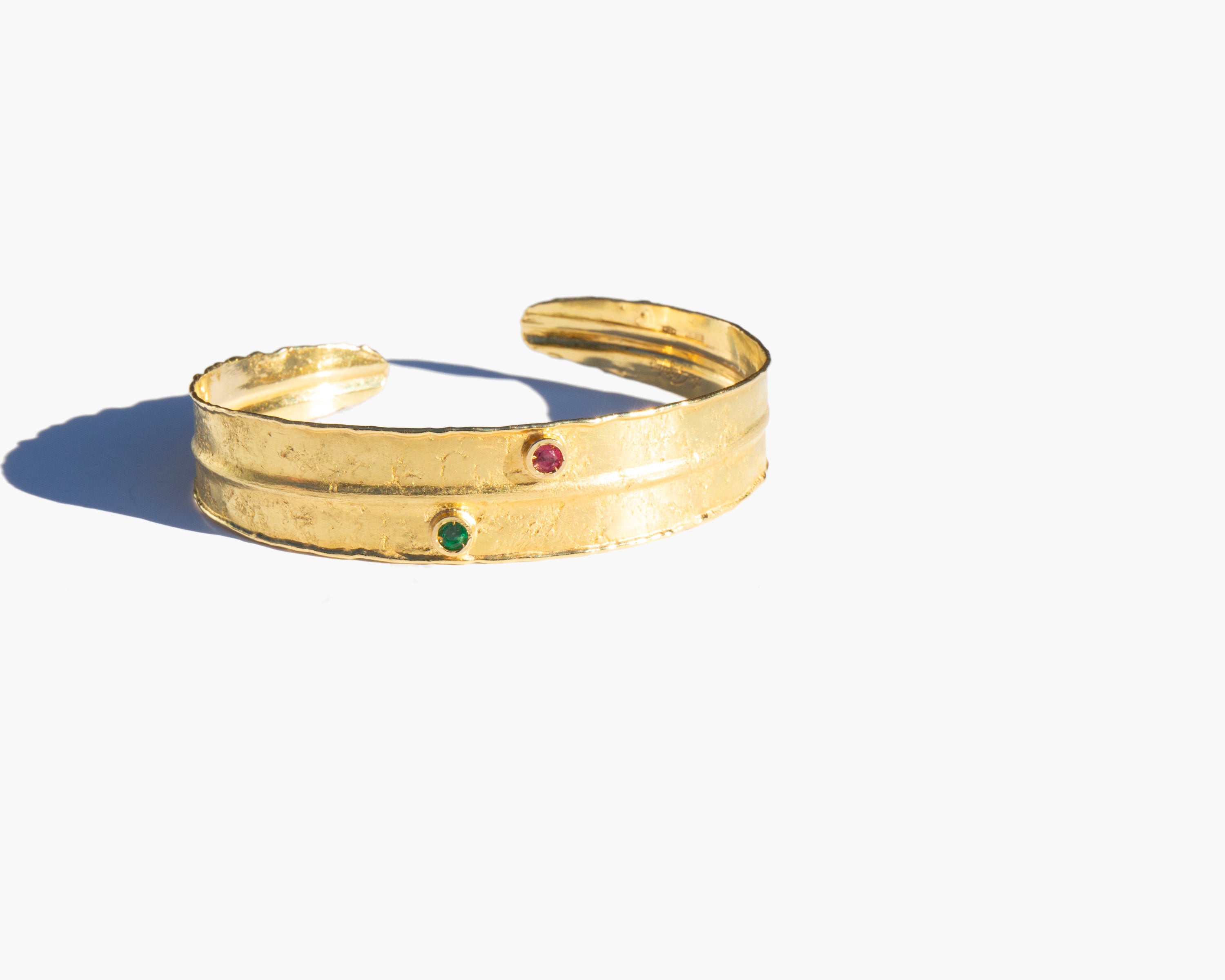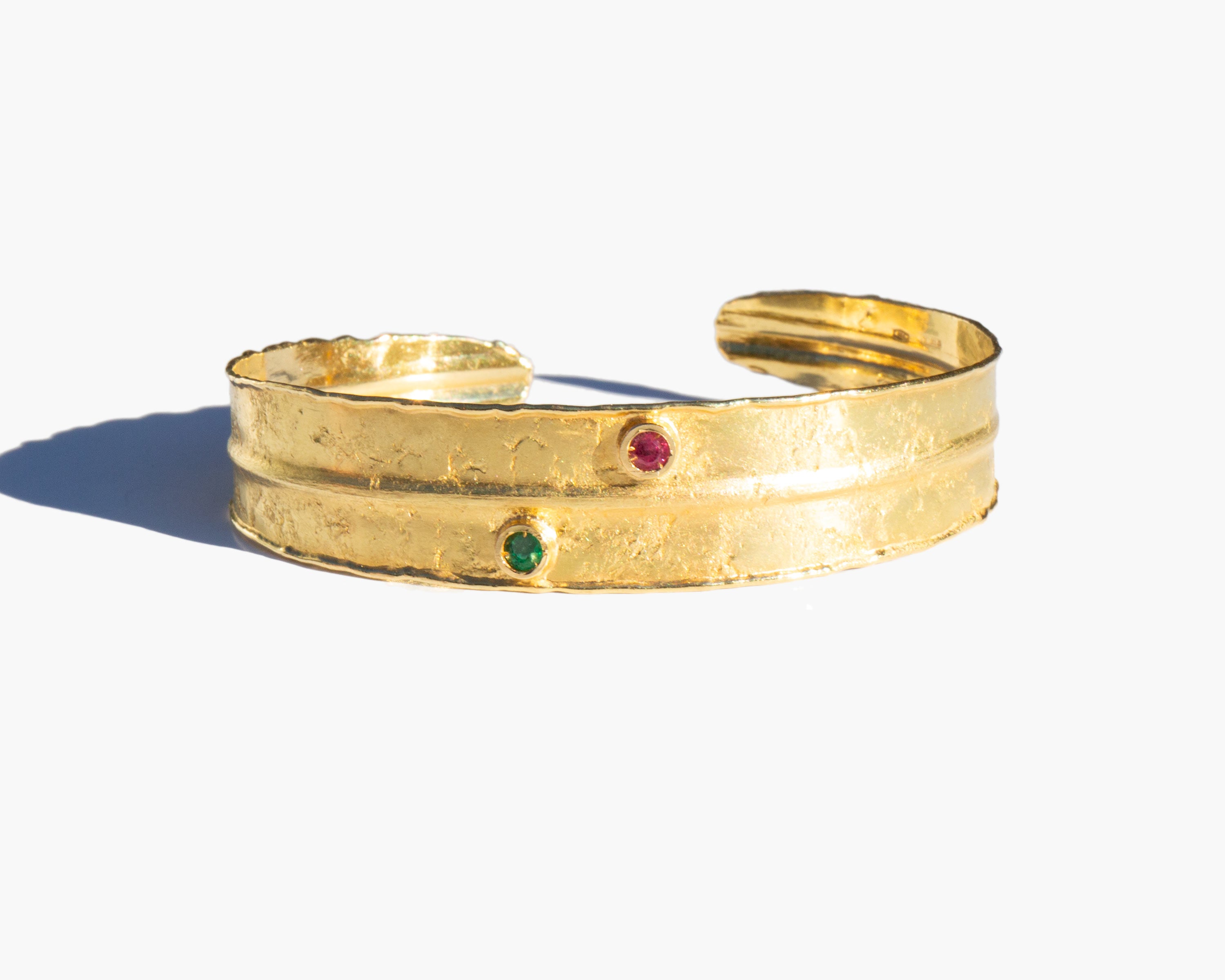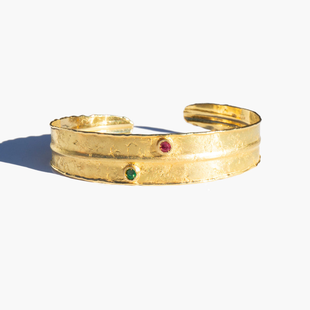 Hammered 14k gold cuff bracelet with a small ruby and a small emerald accent.