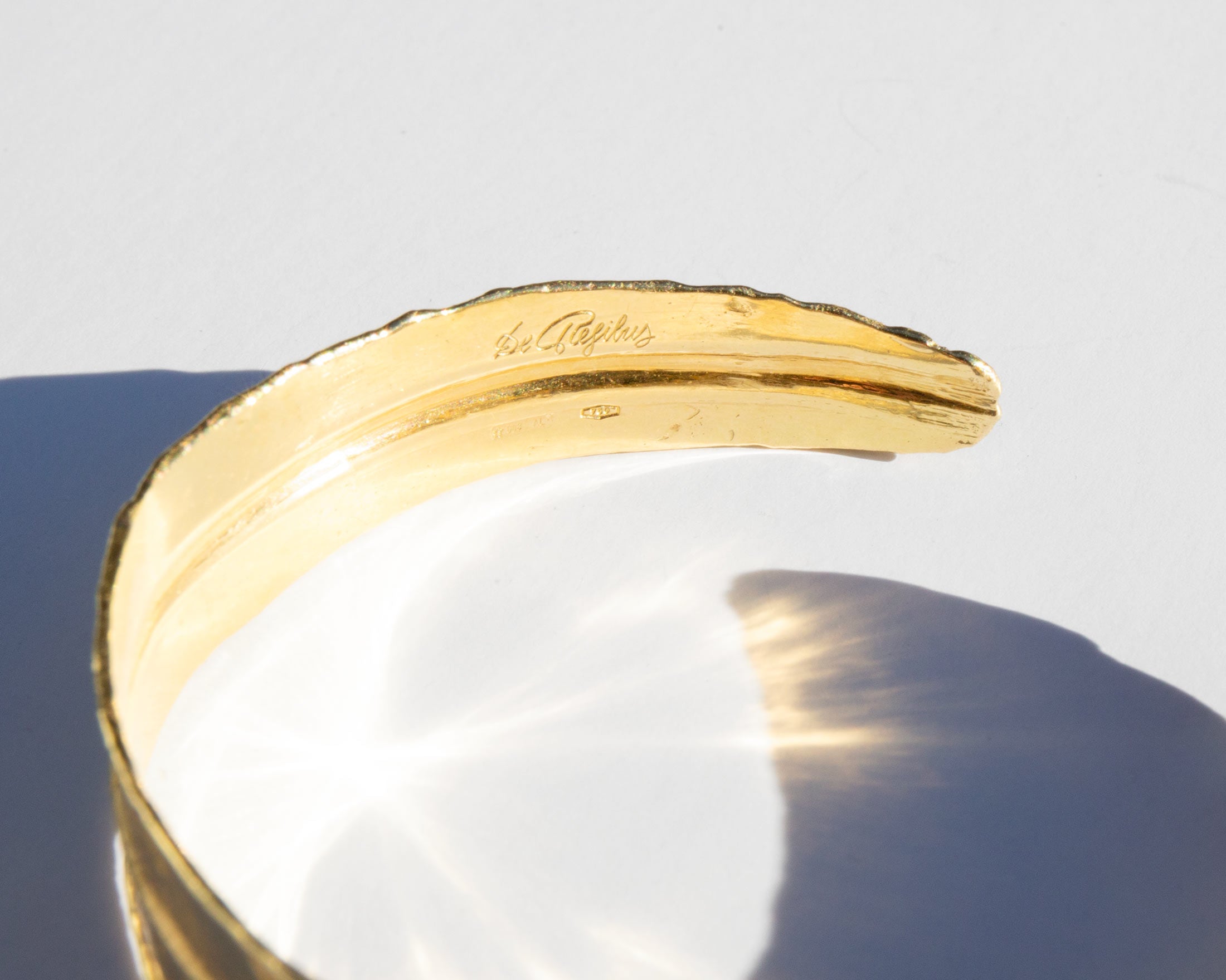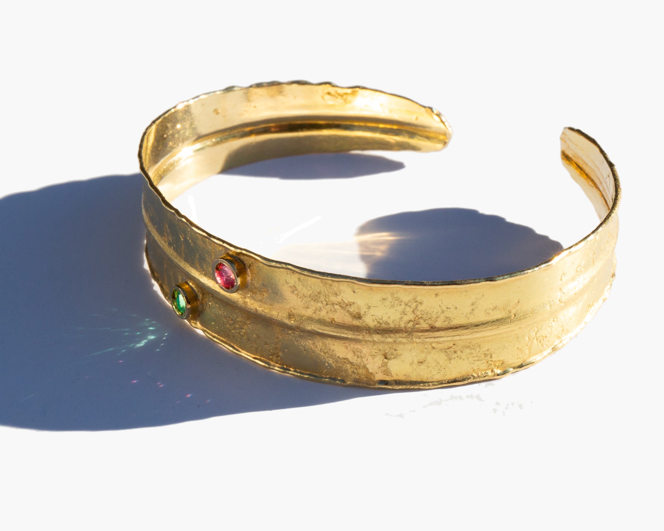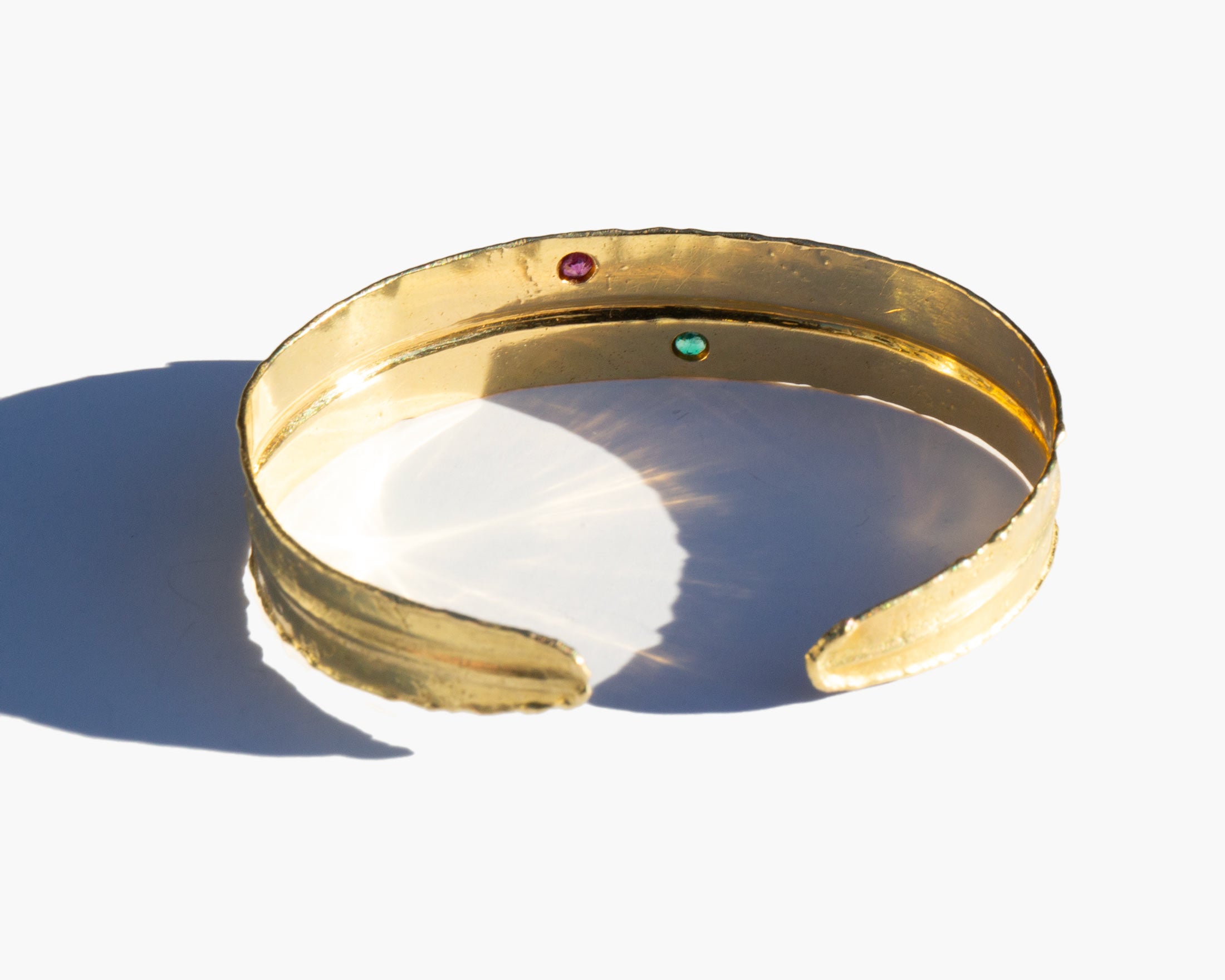 Hammered 14k gold cuff bracelet with a small ruby and a small emerald accent.