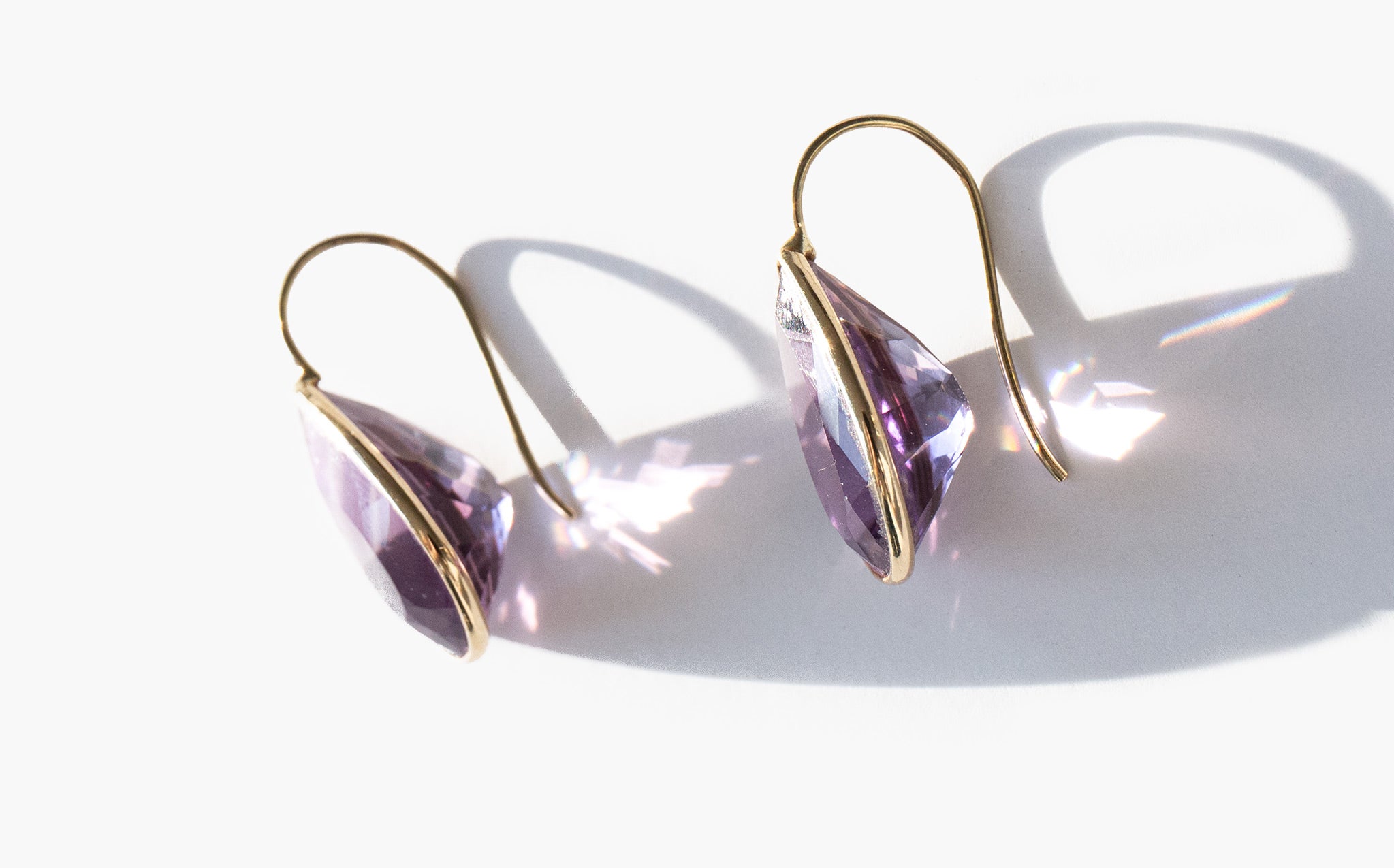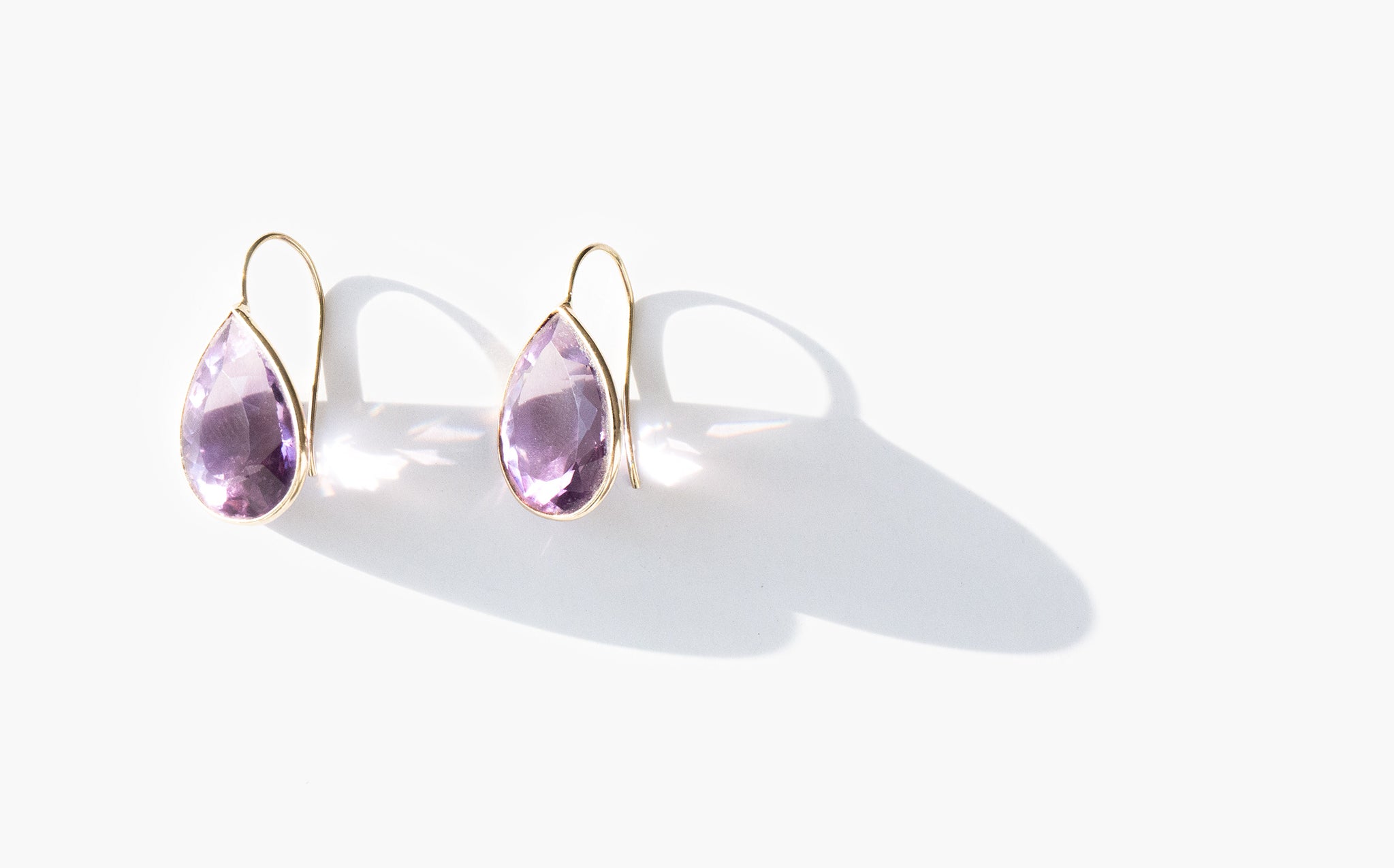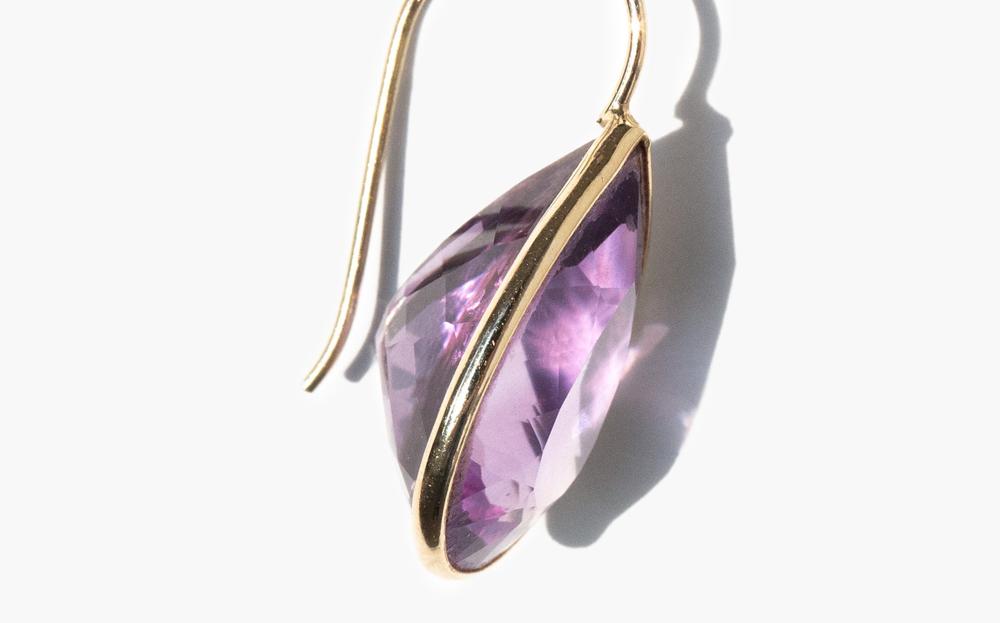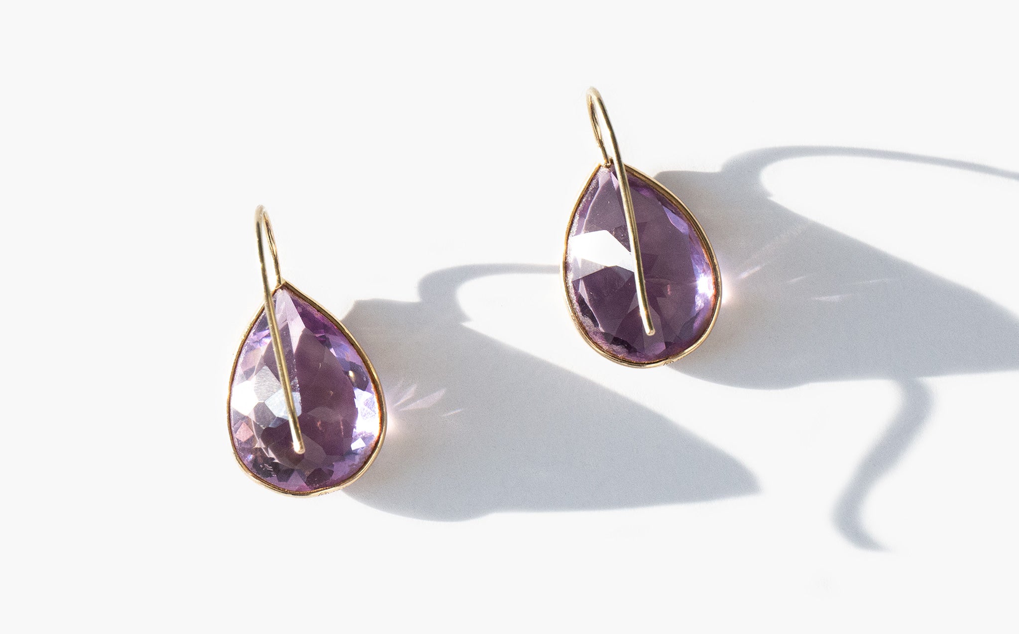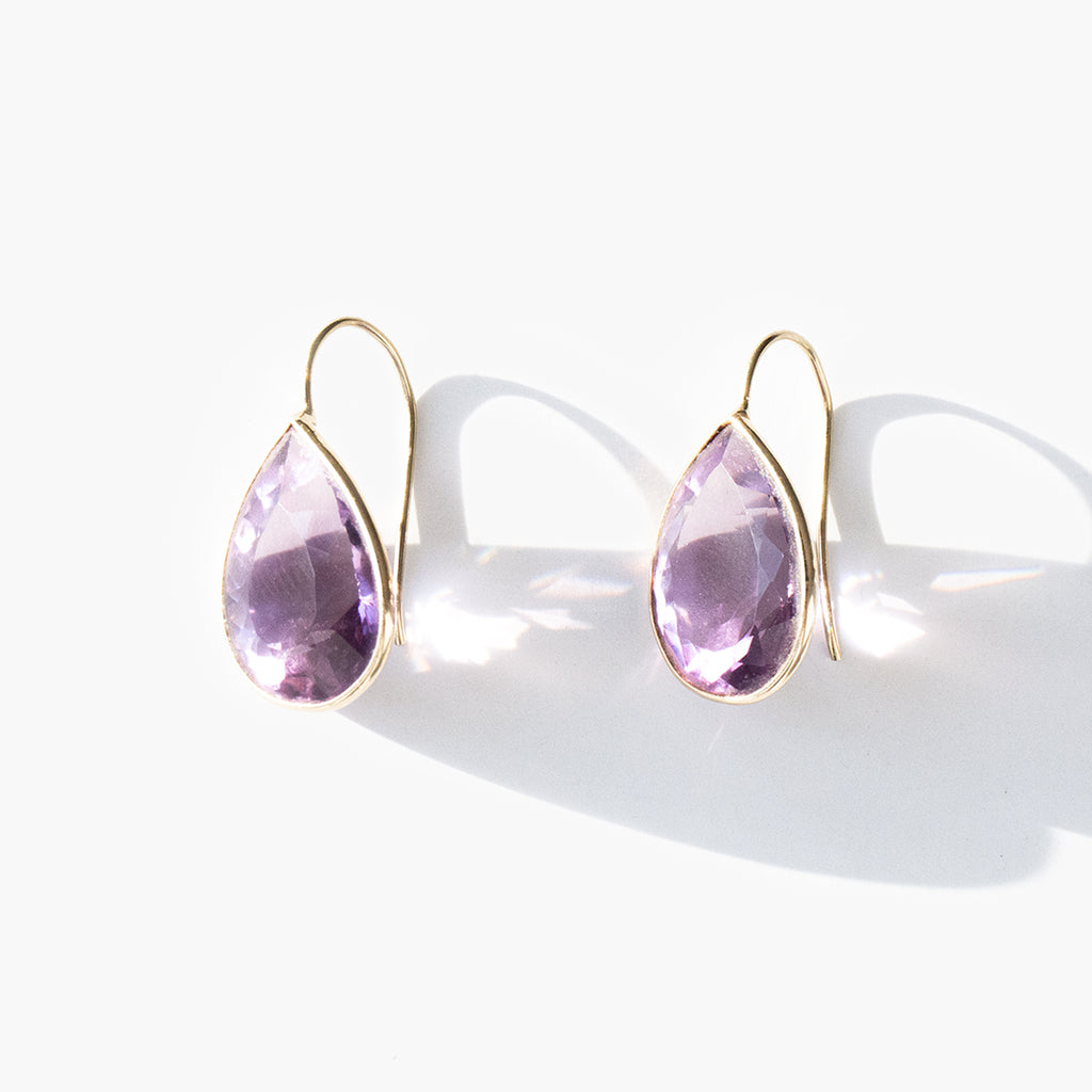 Elegant 14k gold teardrop earrings with large faceted amethysts. Amethyst has been known throughout the centuries as a symbol of purity and spirituality, an amulet of protection against evil, and as a talisman of success and wealth.