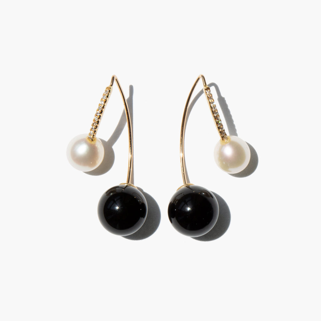 Sculptural 14k gold, onyx, and freshwater pearl earrings studded with small sparkling diamonds.