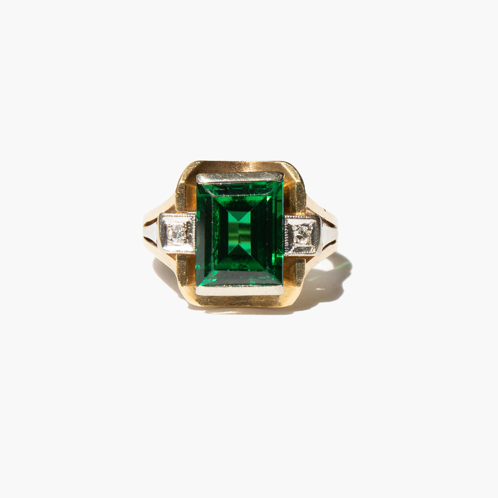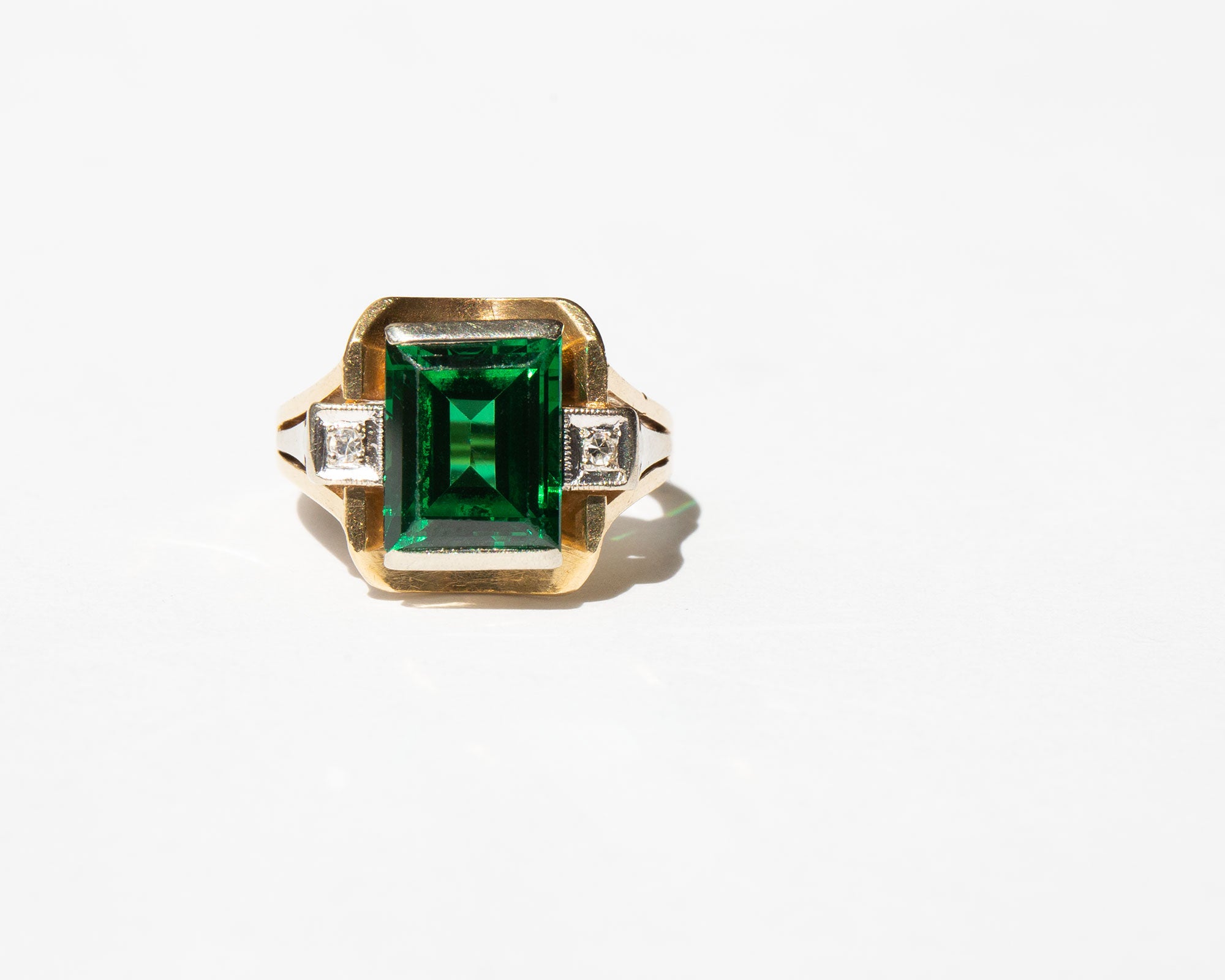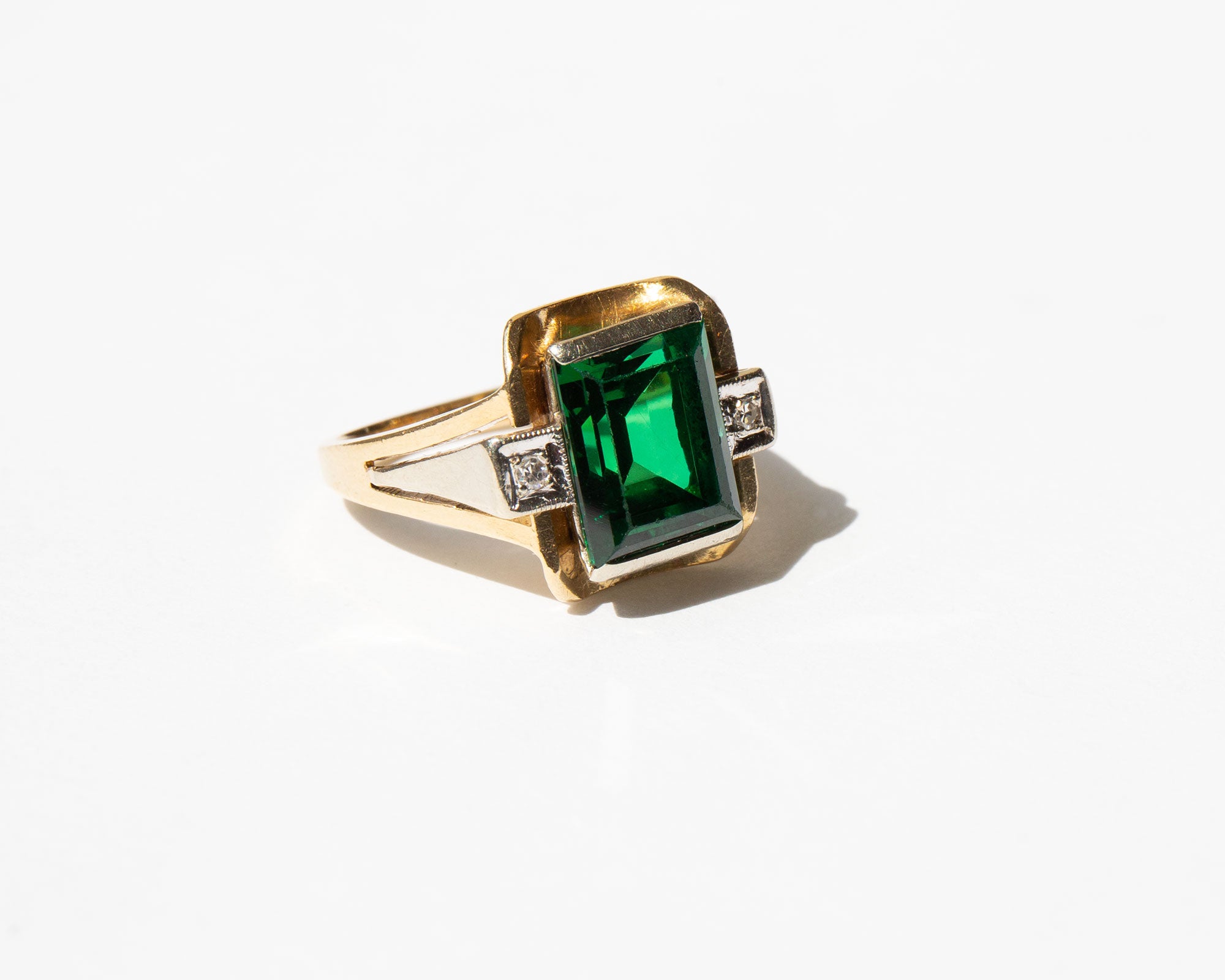 Dazzling 1940's two-tone 14k gold setting with a synthetic green spinel flanked with small diamonds.
