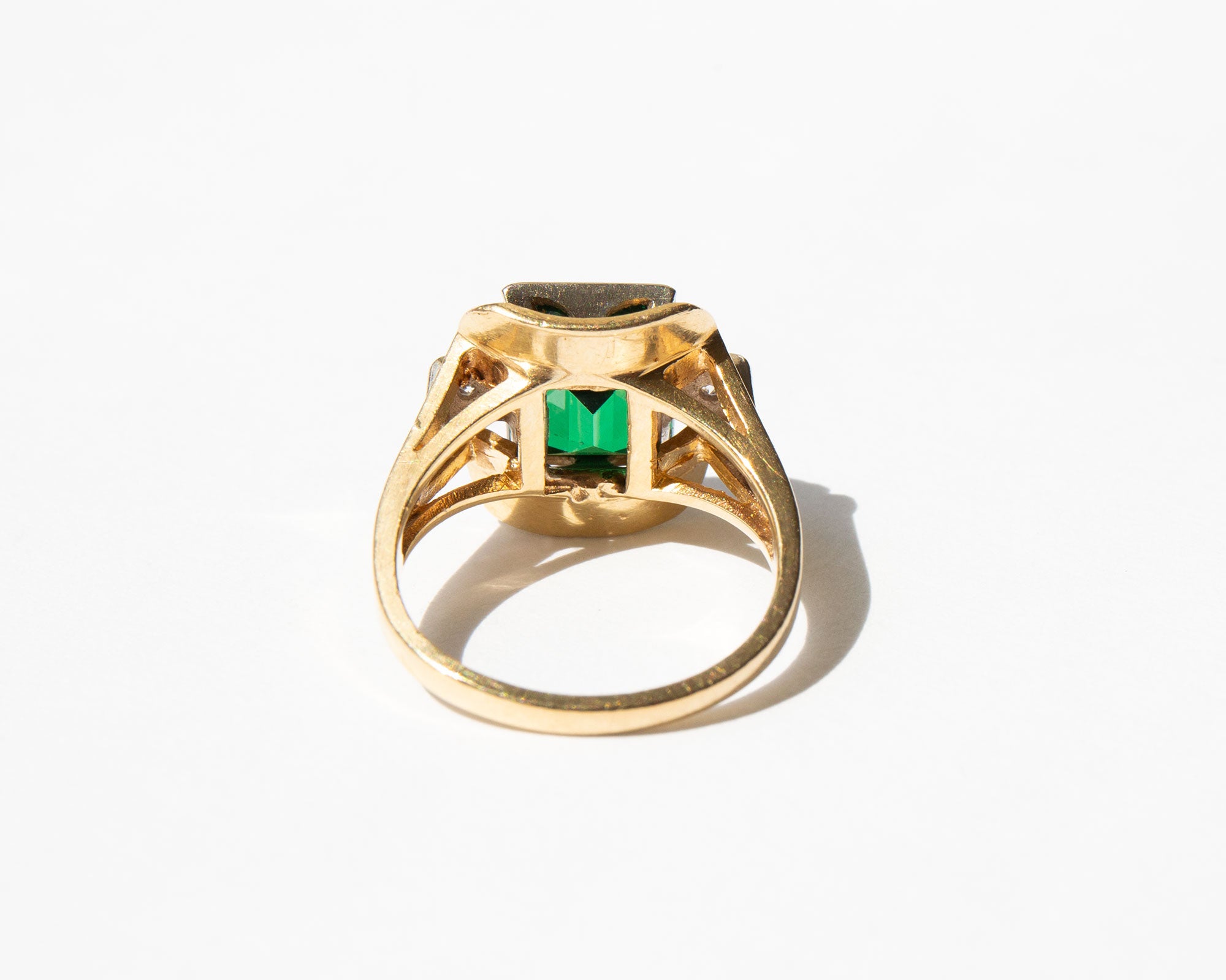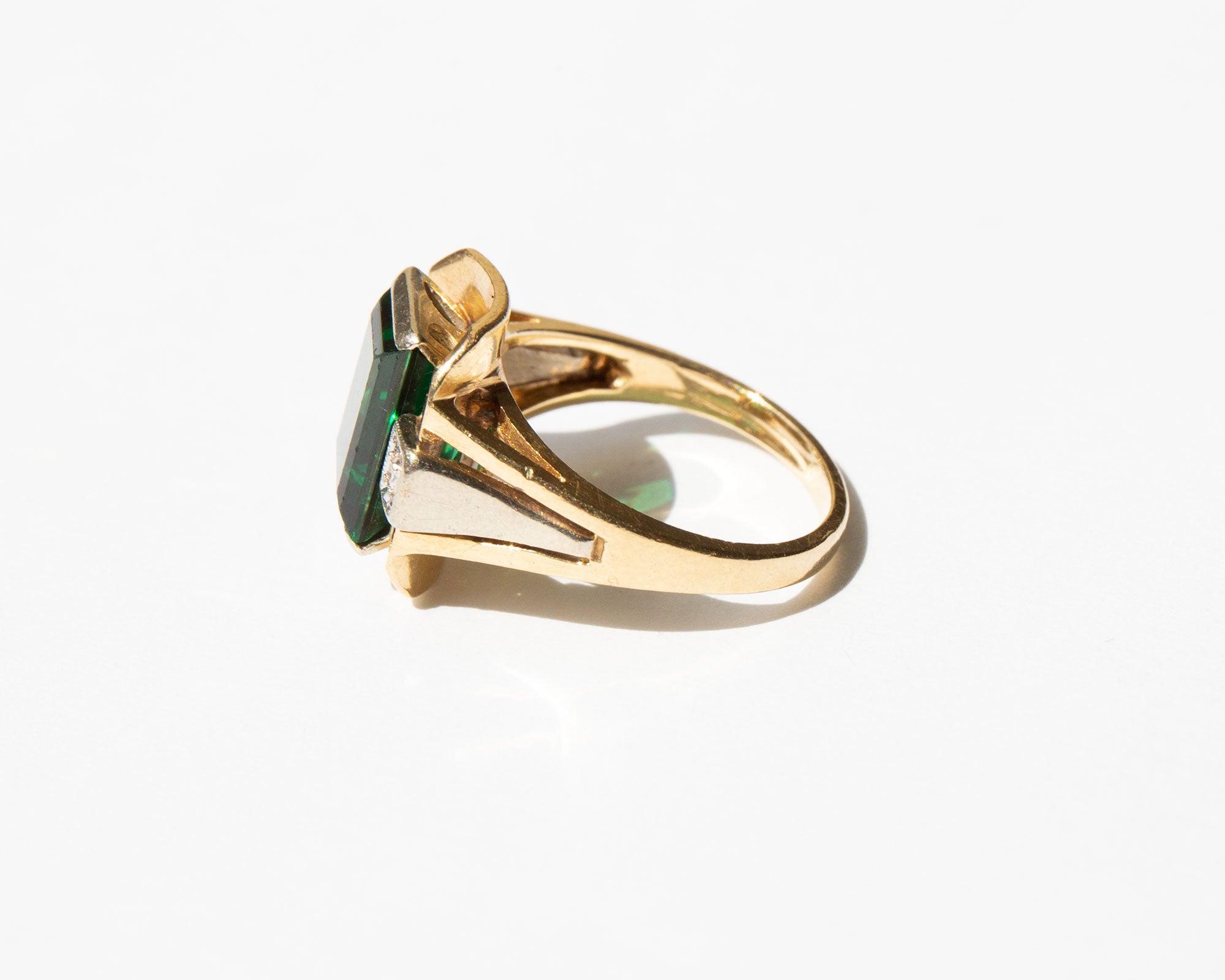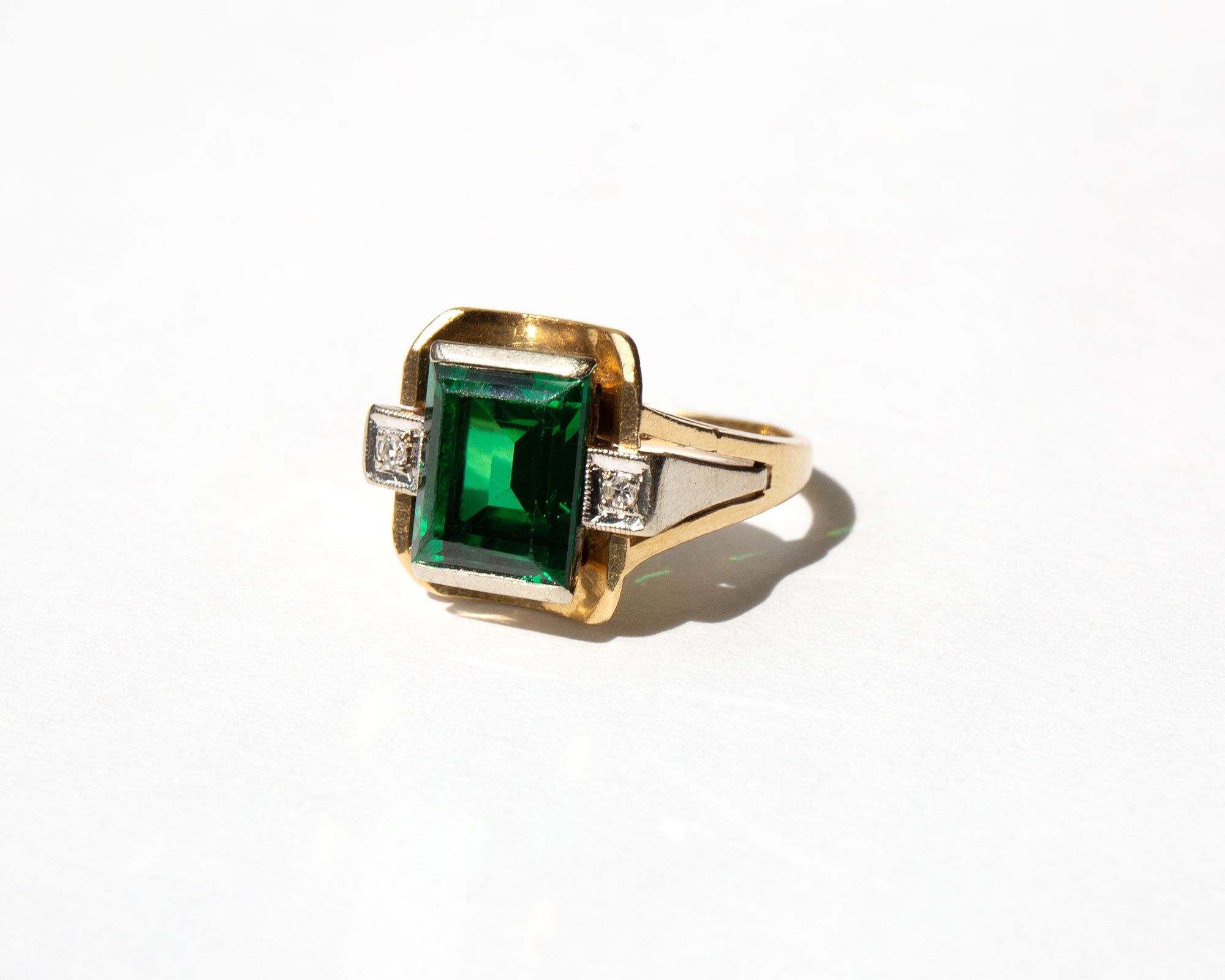 Dazzling 1940's two-tone 14k gold setting with a synthetic green spinel flanked with small diamonds.