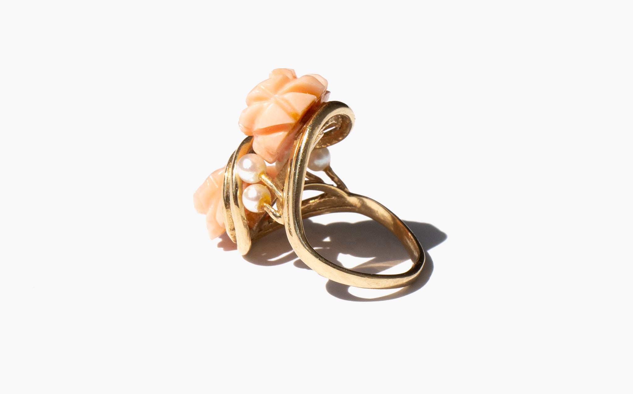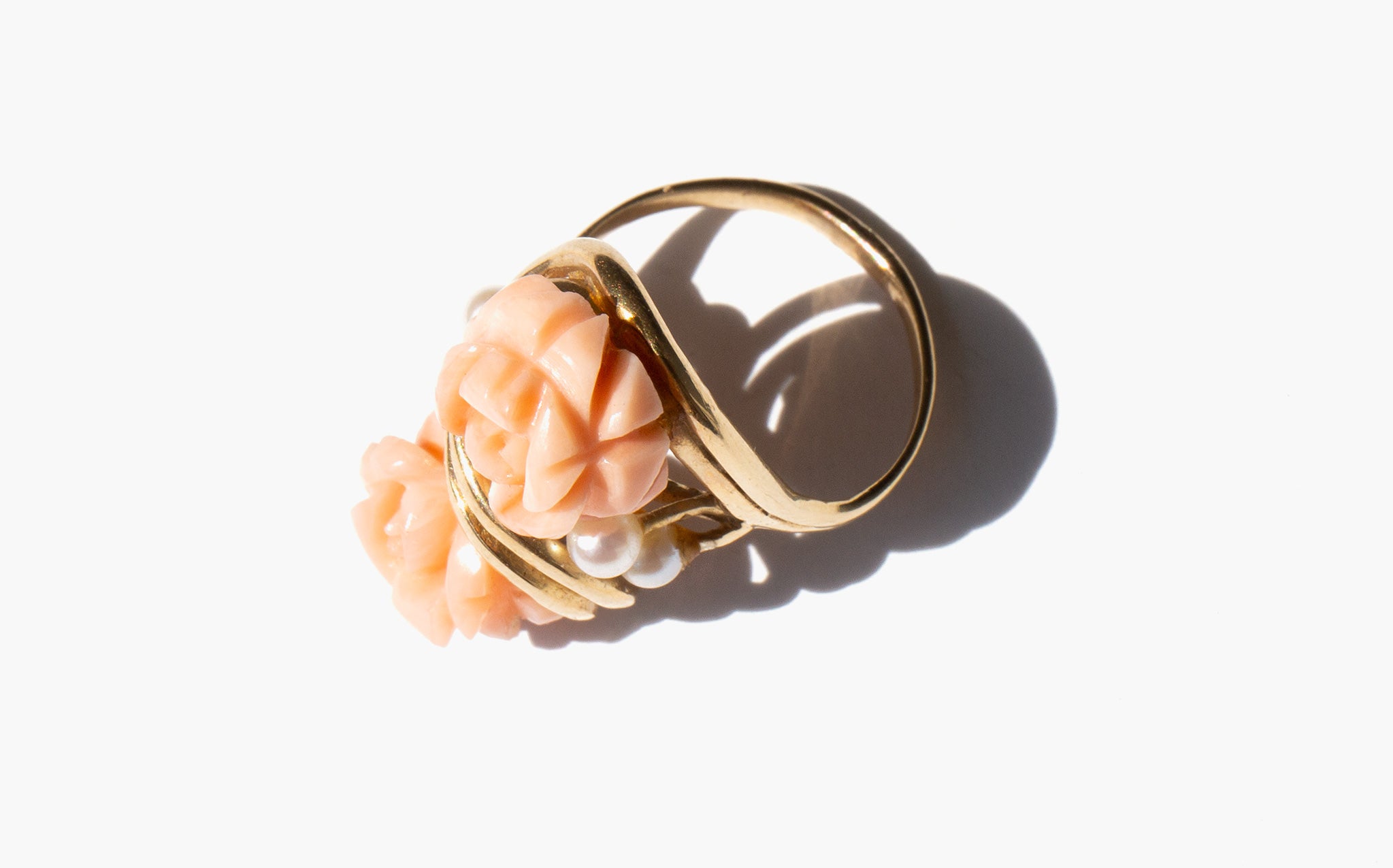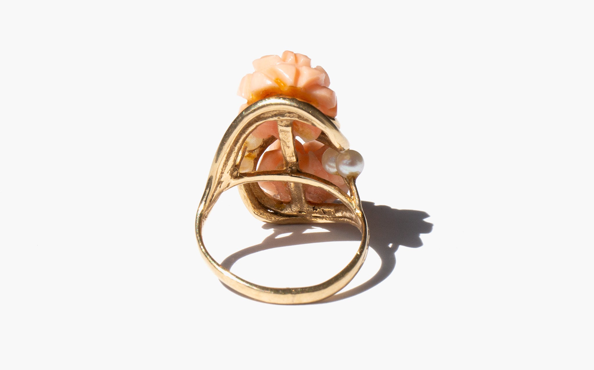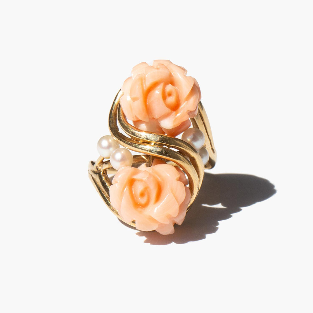 Carved coral rose ring accented with seed pearls and set in 14k gold.