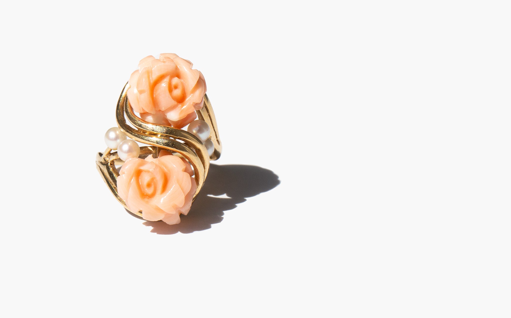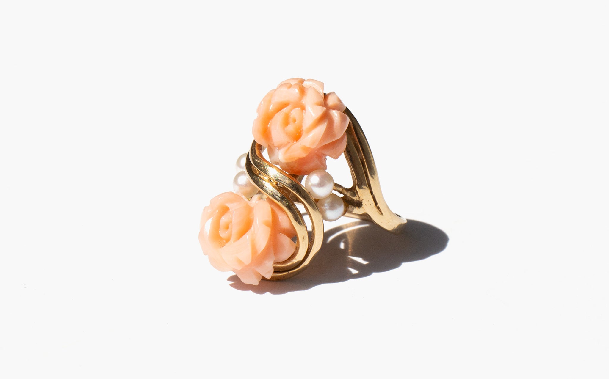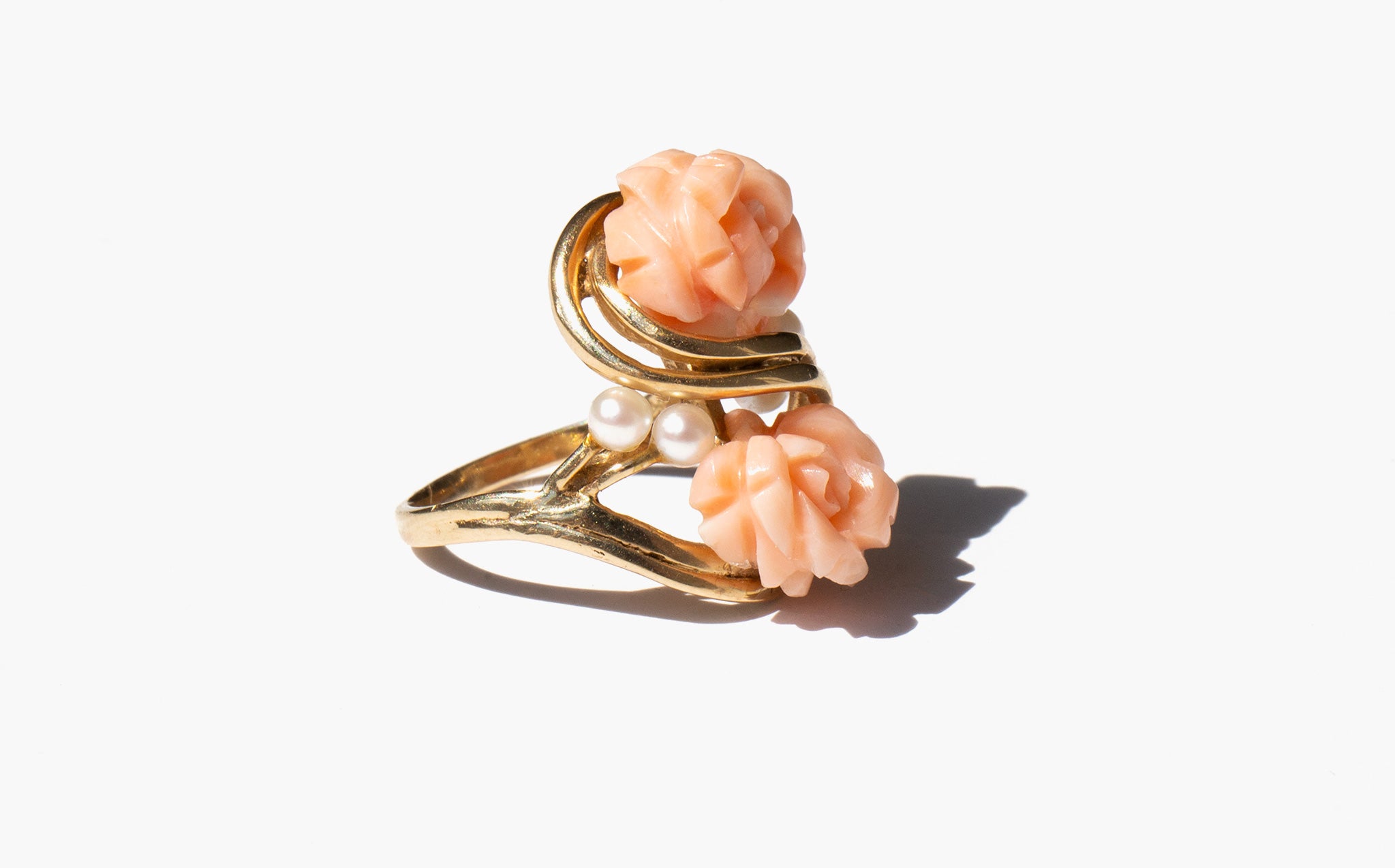 Carved coral rose ring accented with seed pearls and set in 14k gold.