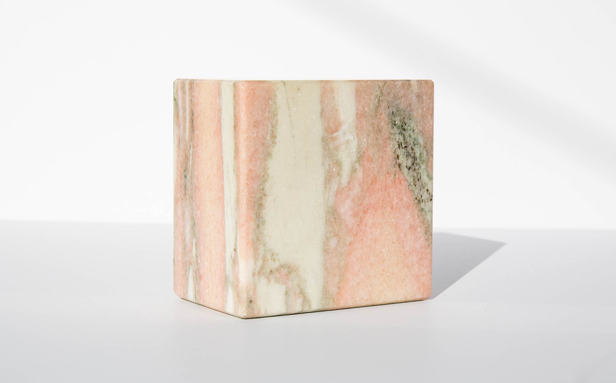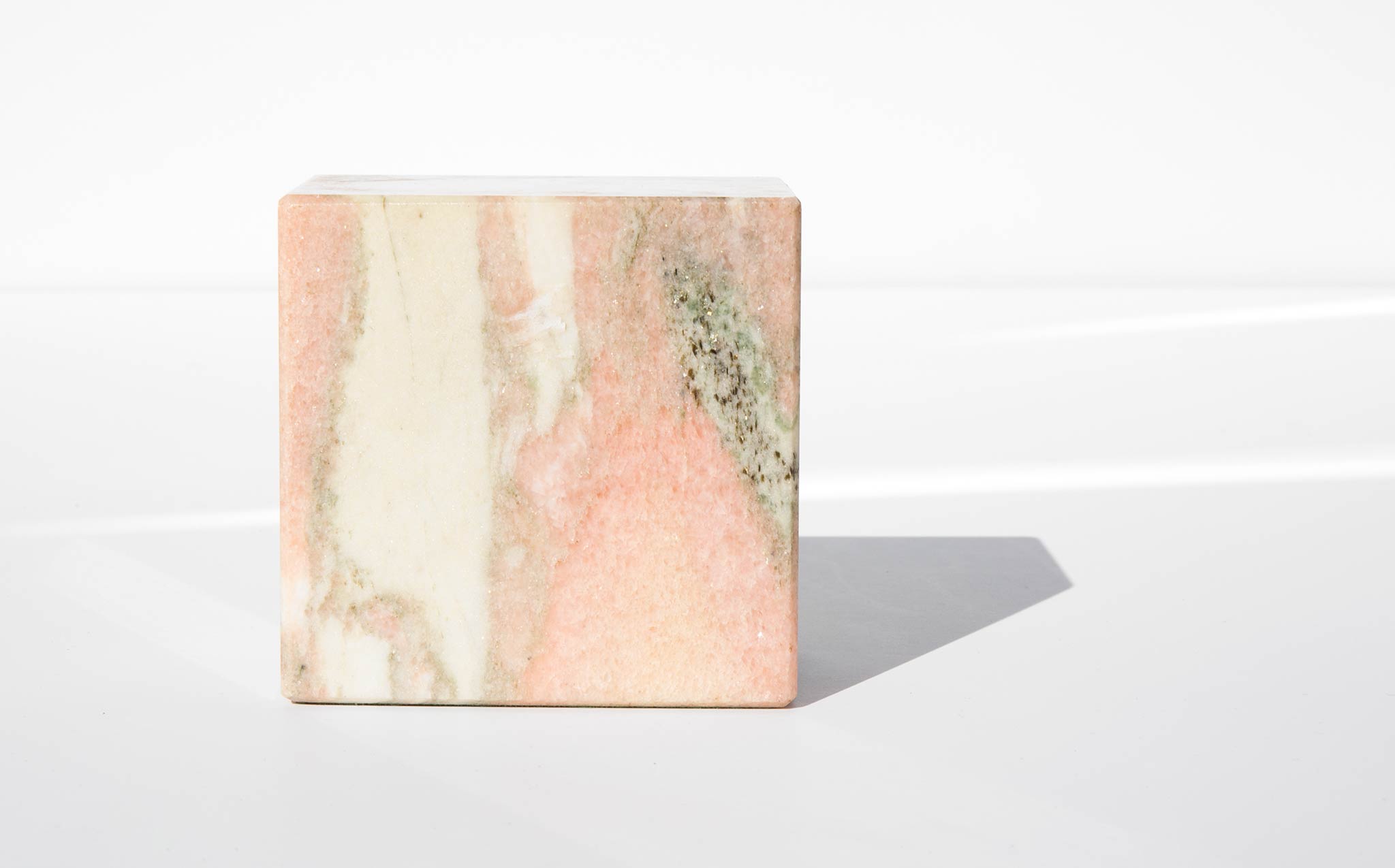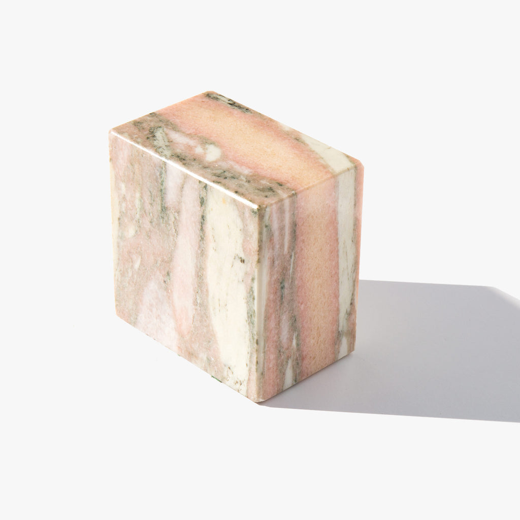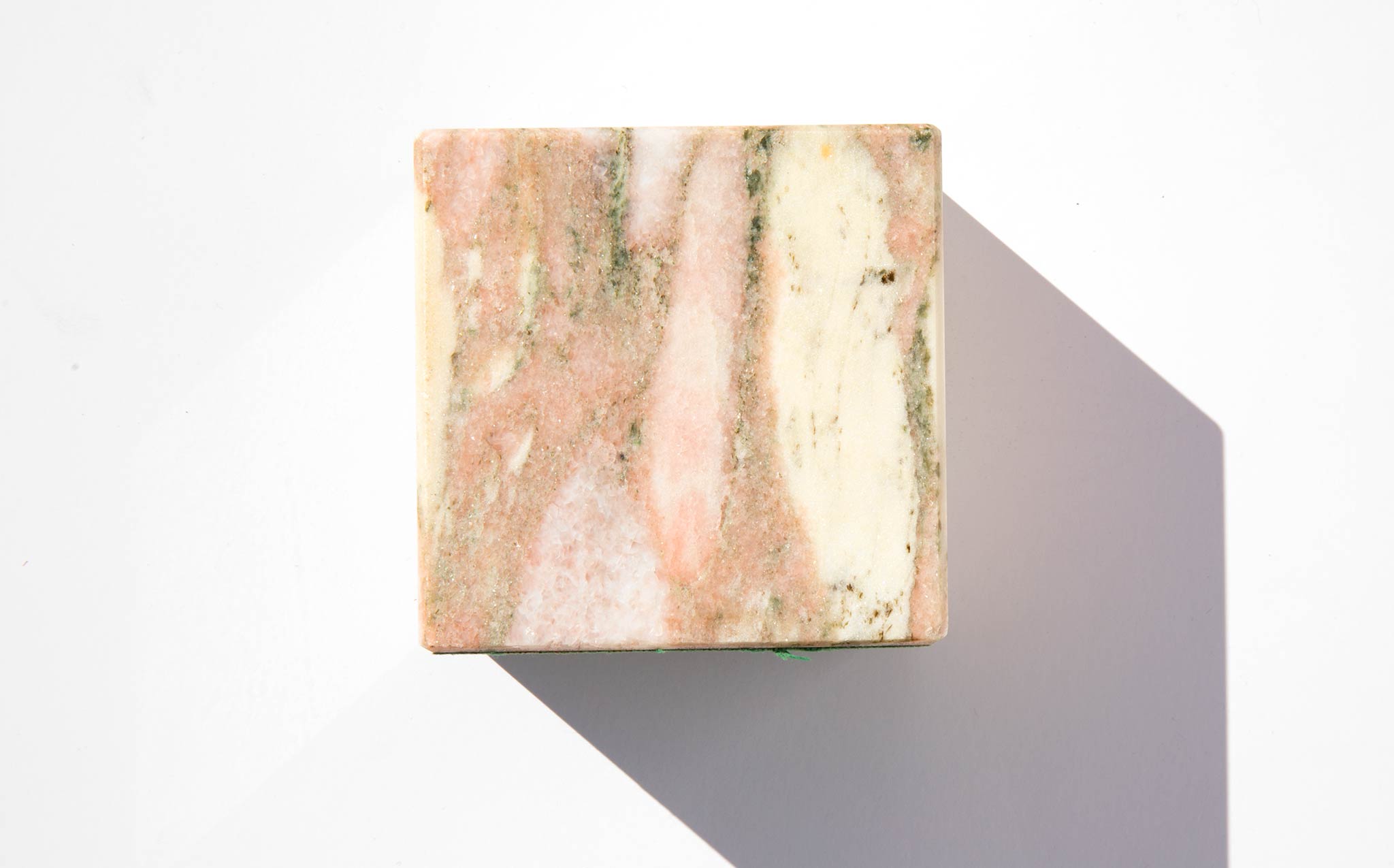 Solid piece of pretty pink marble with striations of cream and smoky grey. Lined on the bottom with soft green felt.