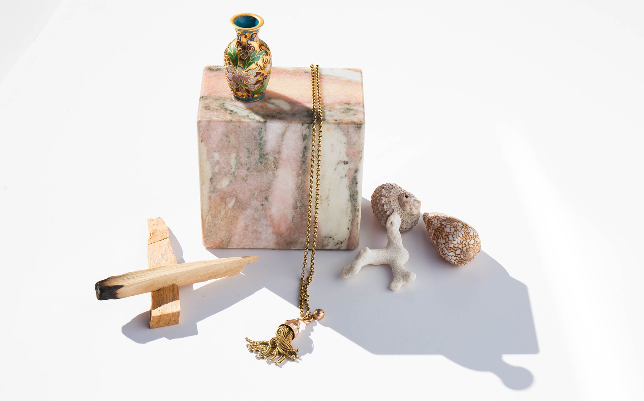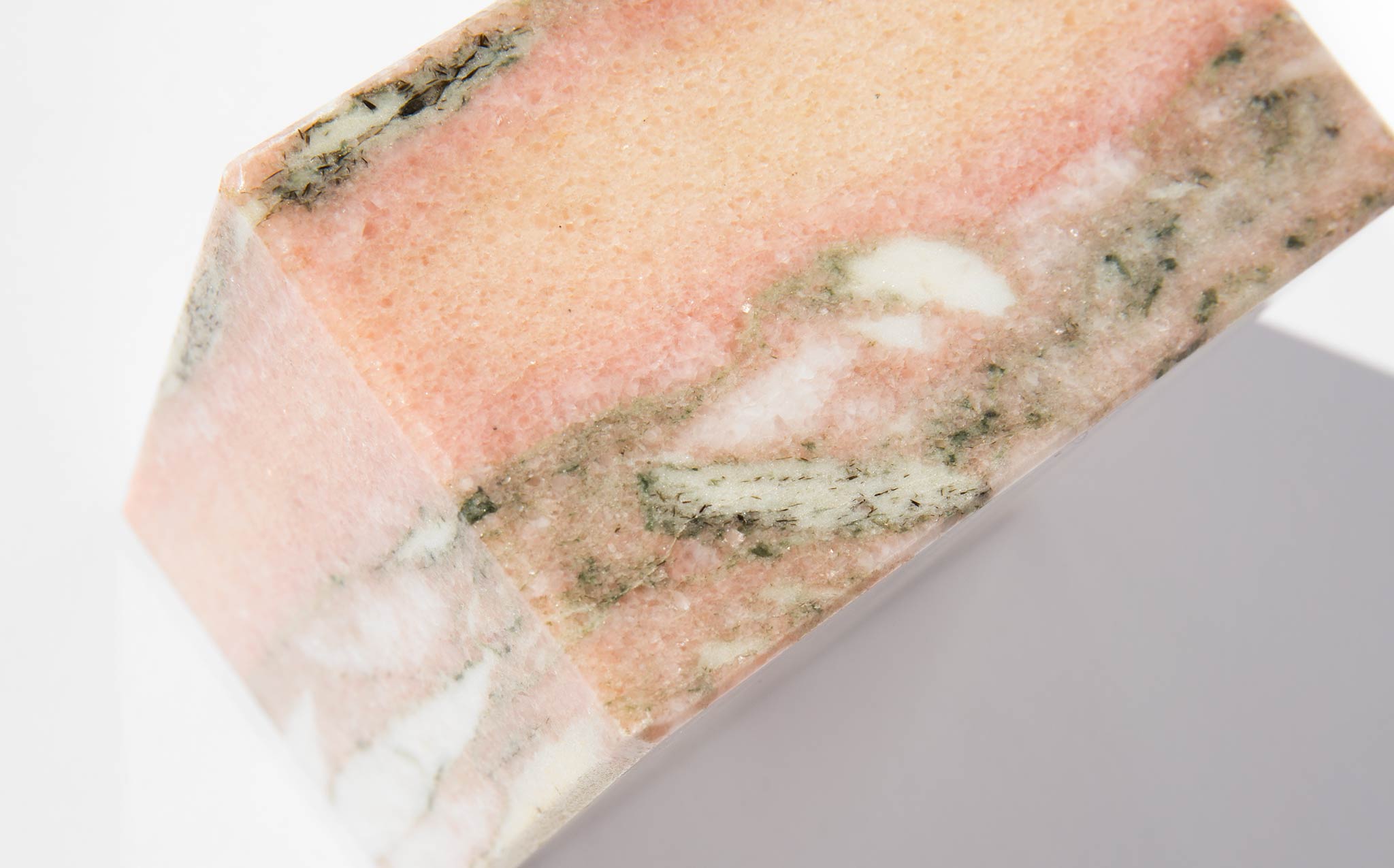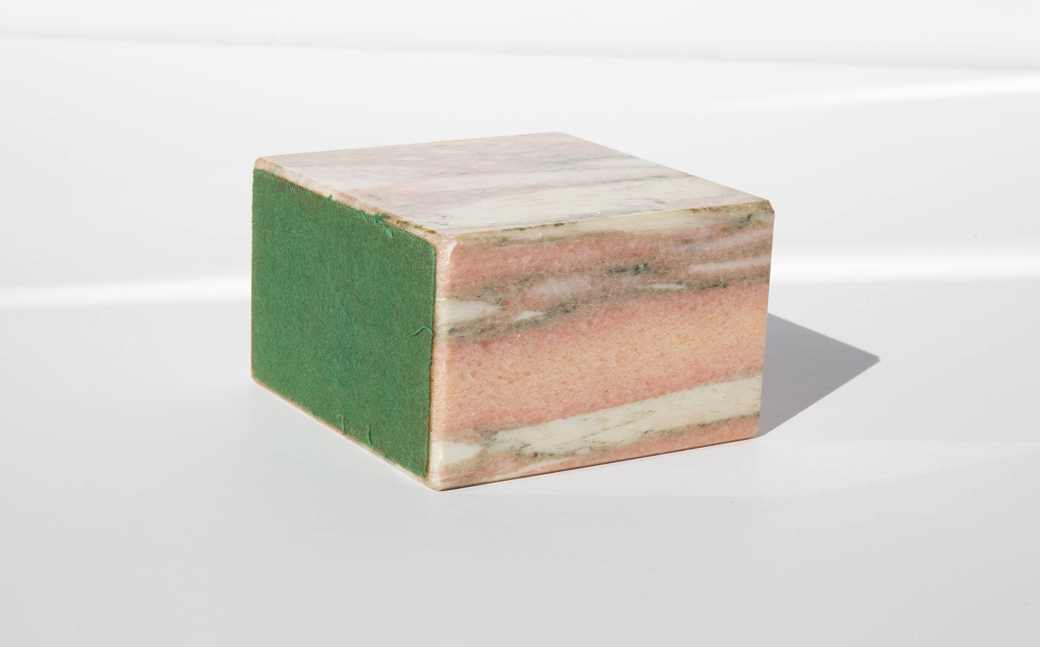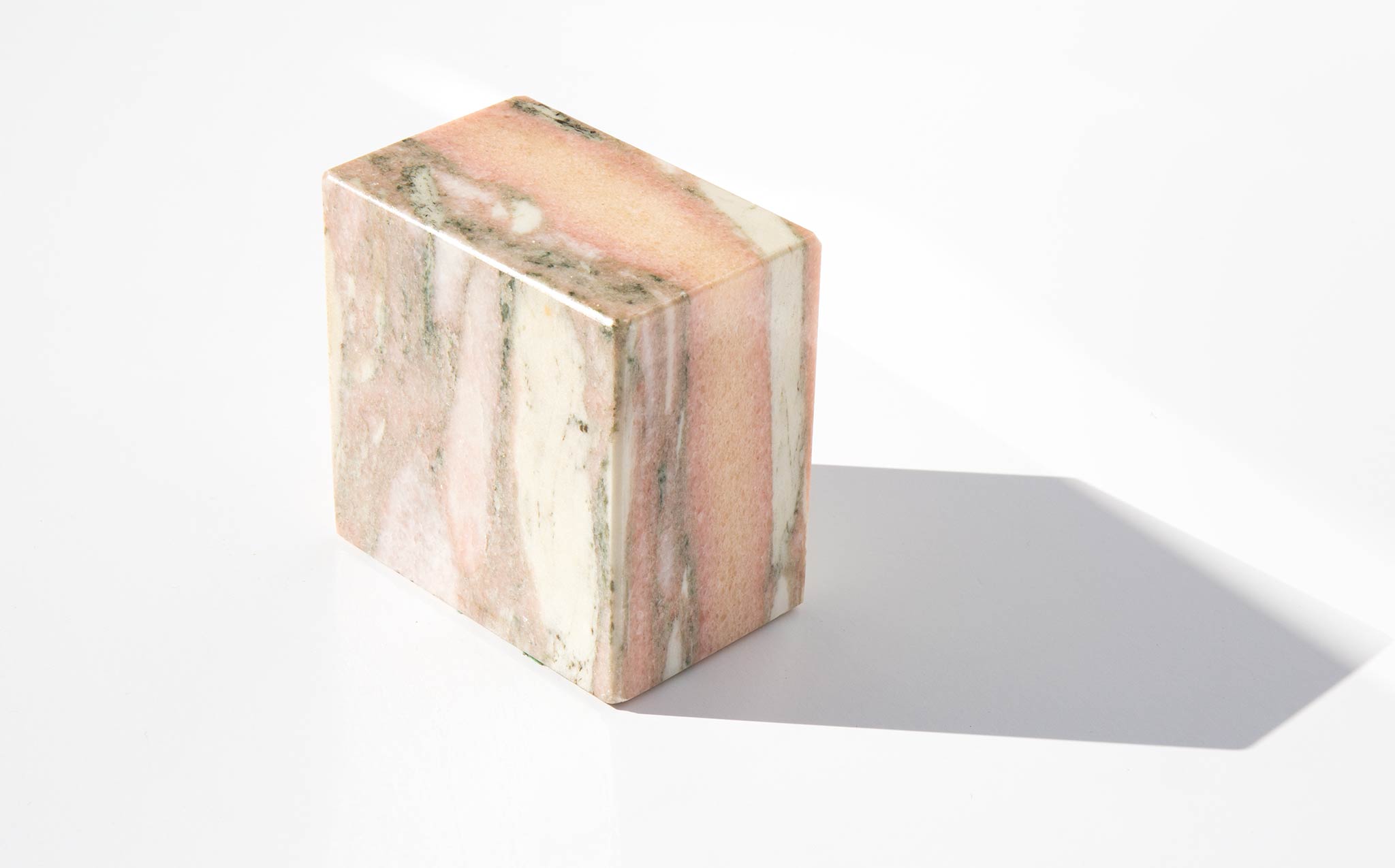 Solid piece of pretty pink marble with striations of cream and smoky grey. Lined on the bottom with soft green felt.