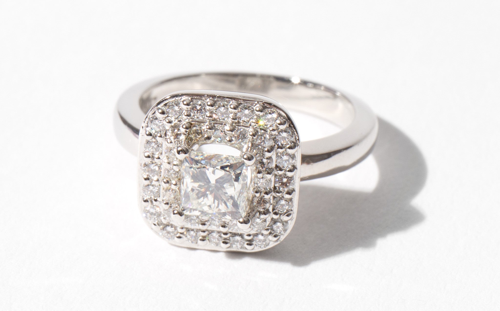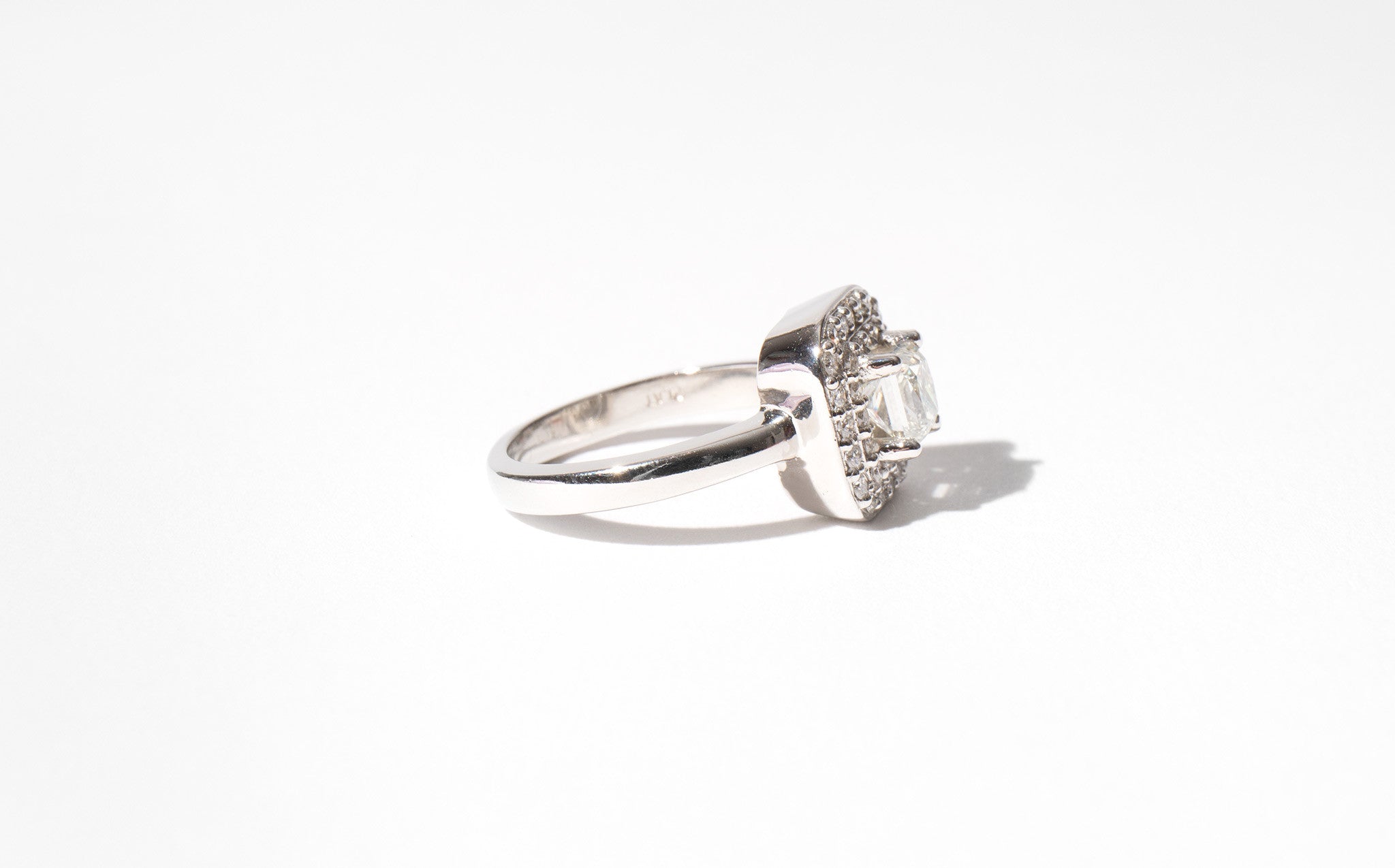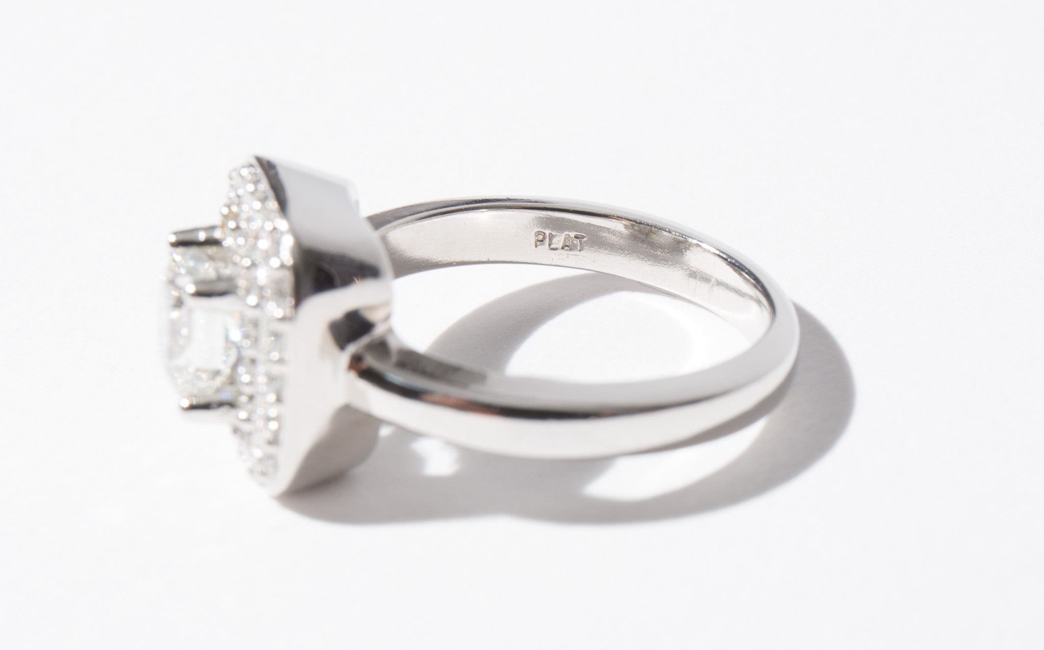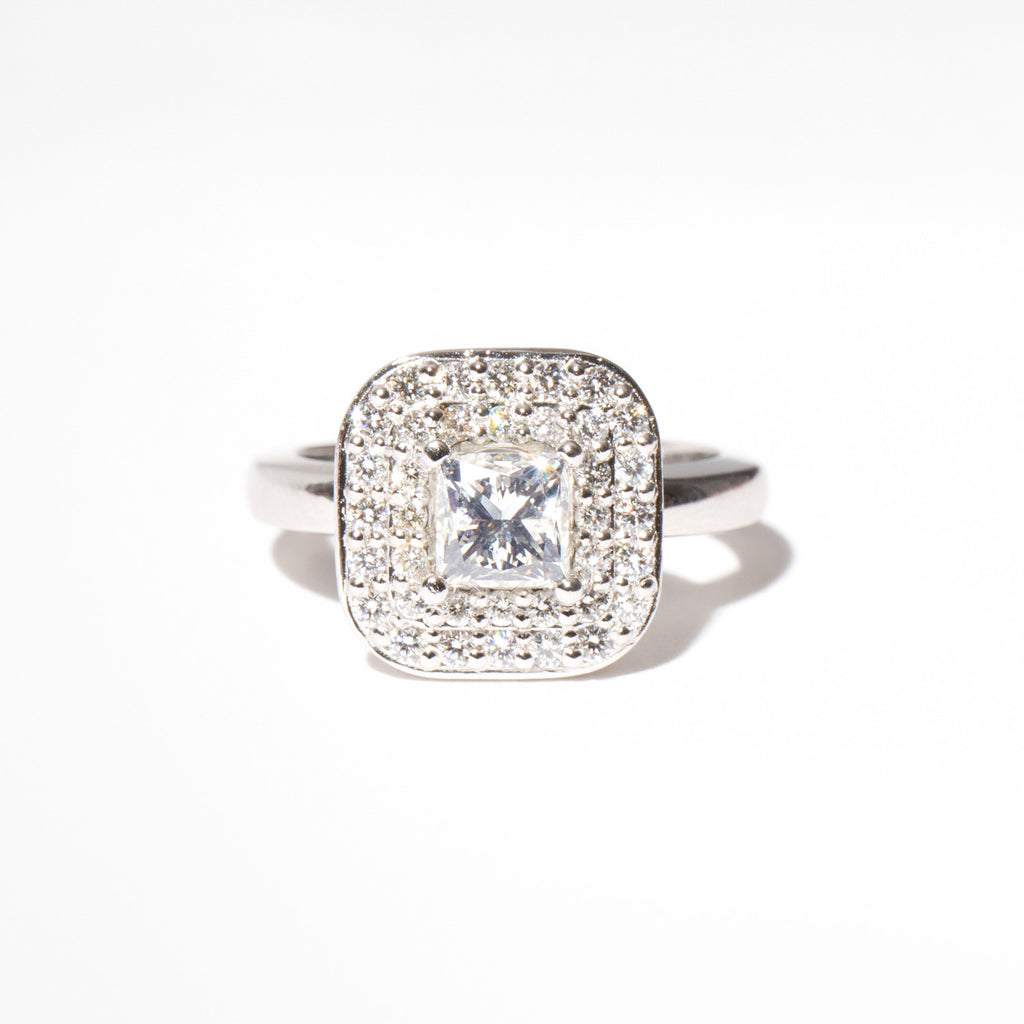 Modern, solid platinum ring with princess cut, fully faceted 1 ct center stone.
