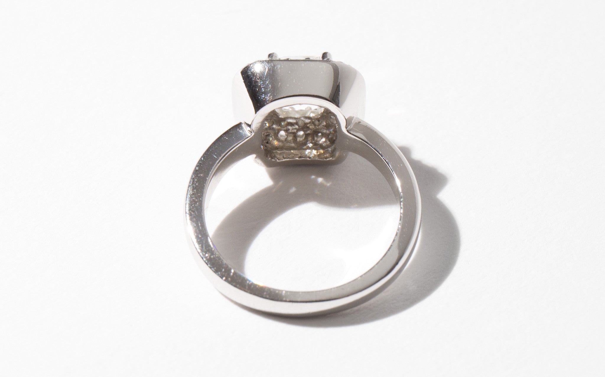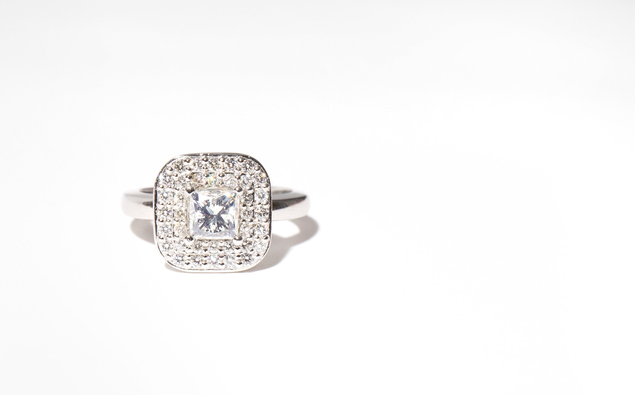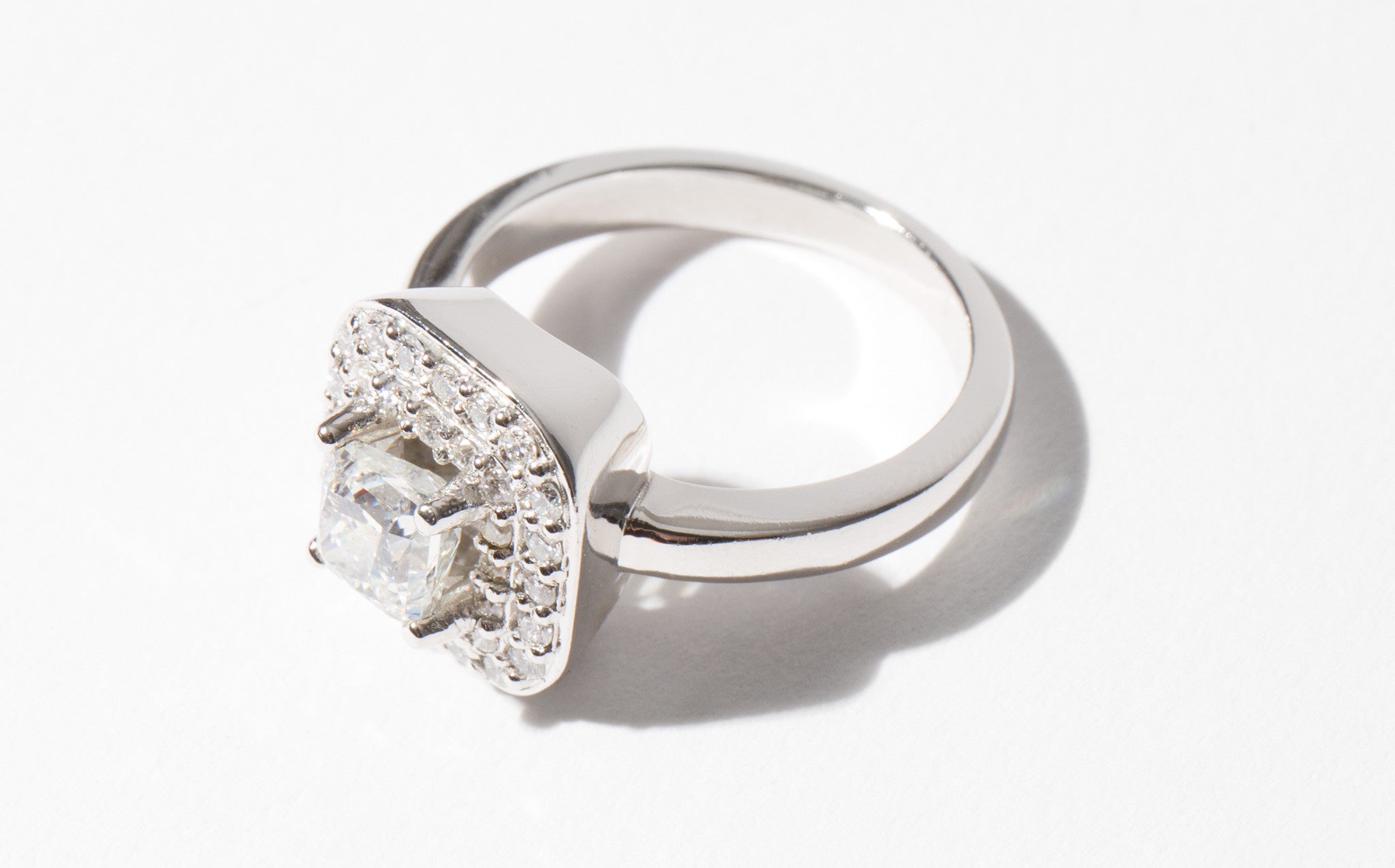 Modern, solid platinum ring with princess cut, fully faceted 1 ct center stone.