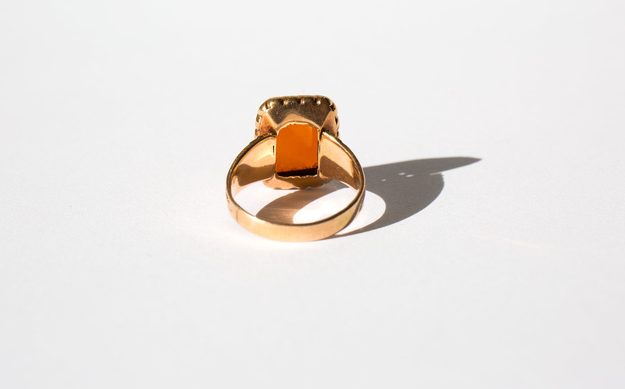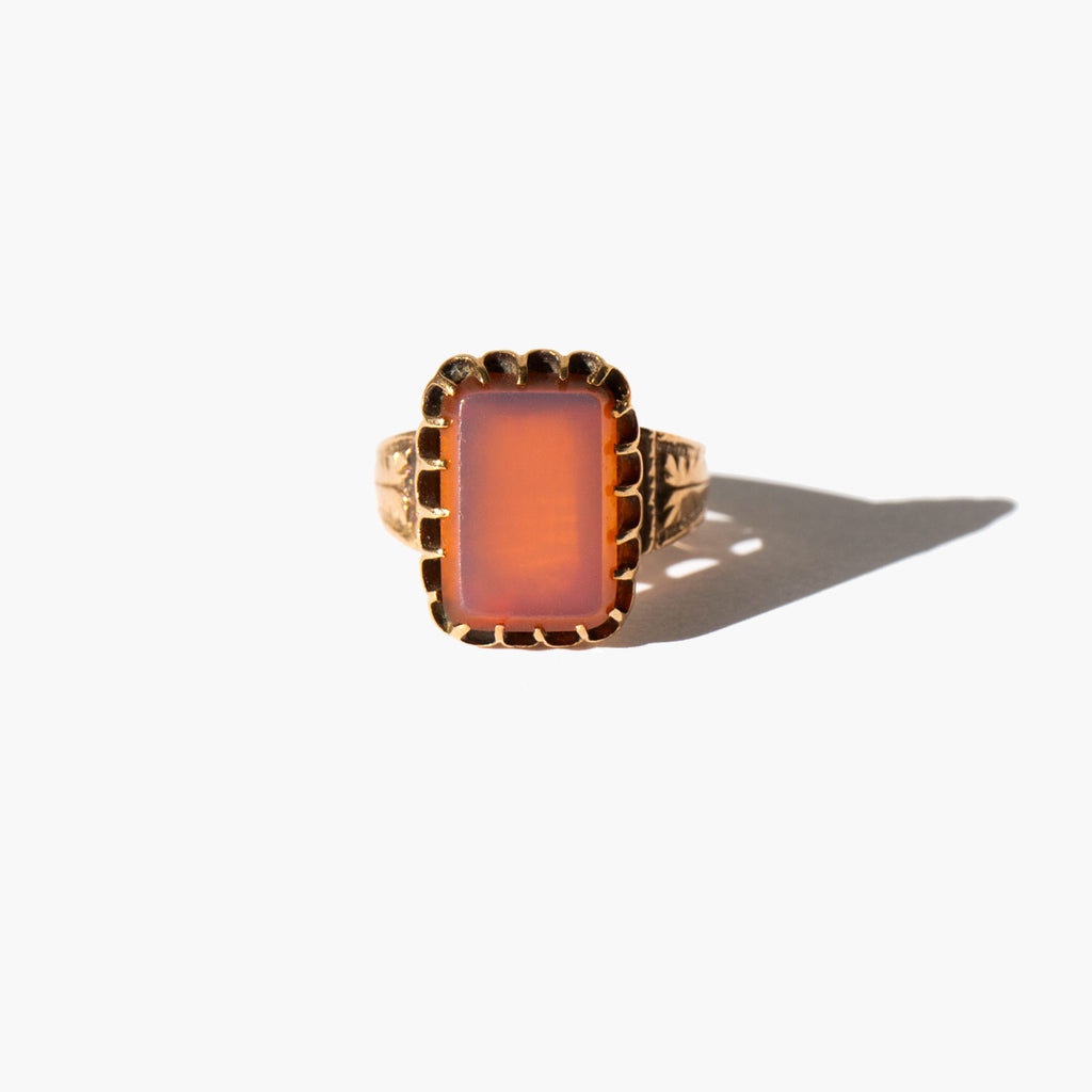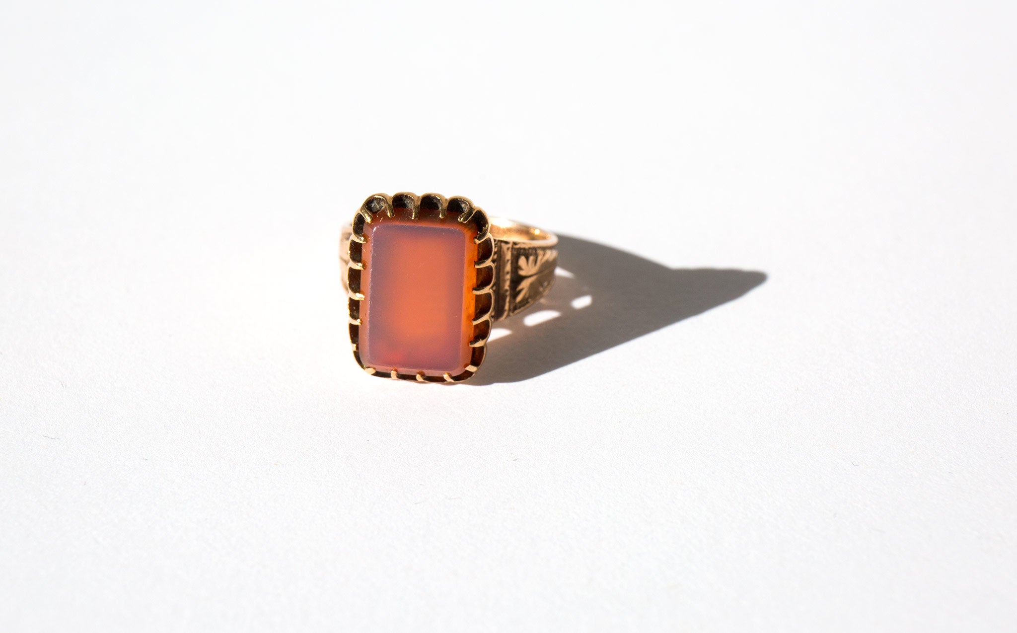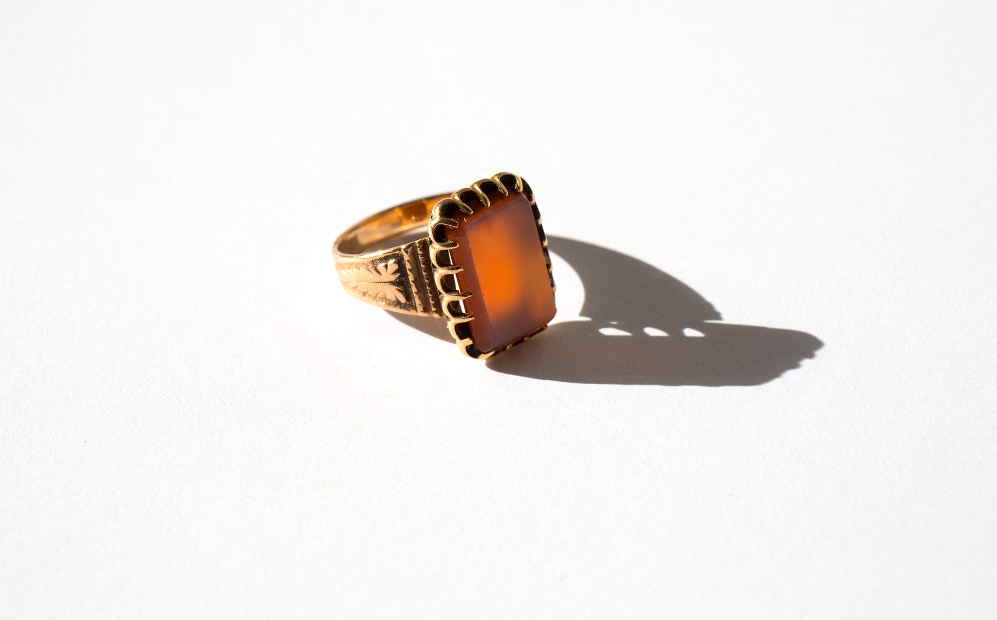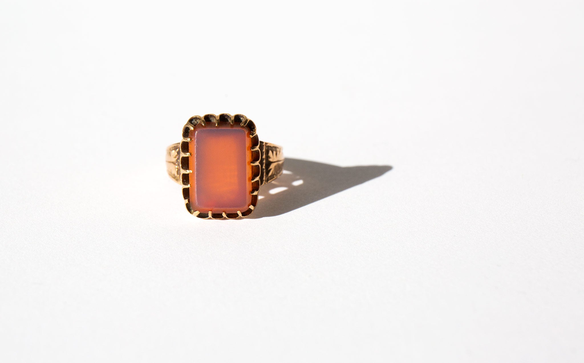 Unusual, detailed 14k gold setting with a large sherbet hued sardonyx.