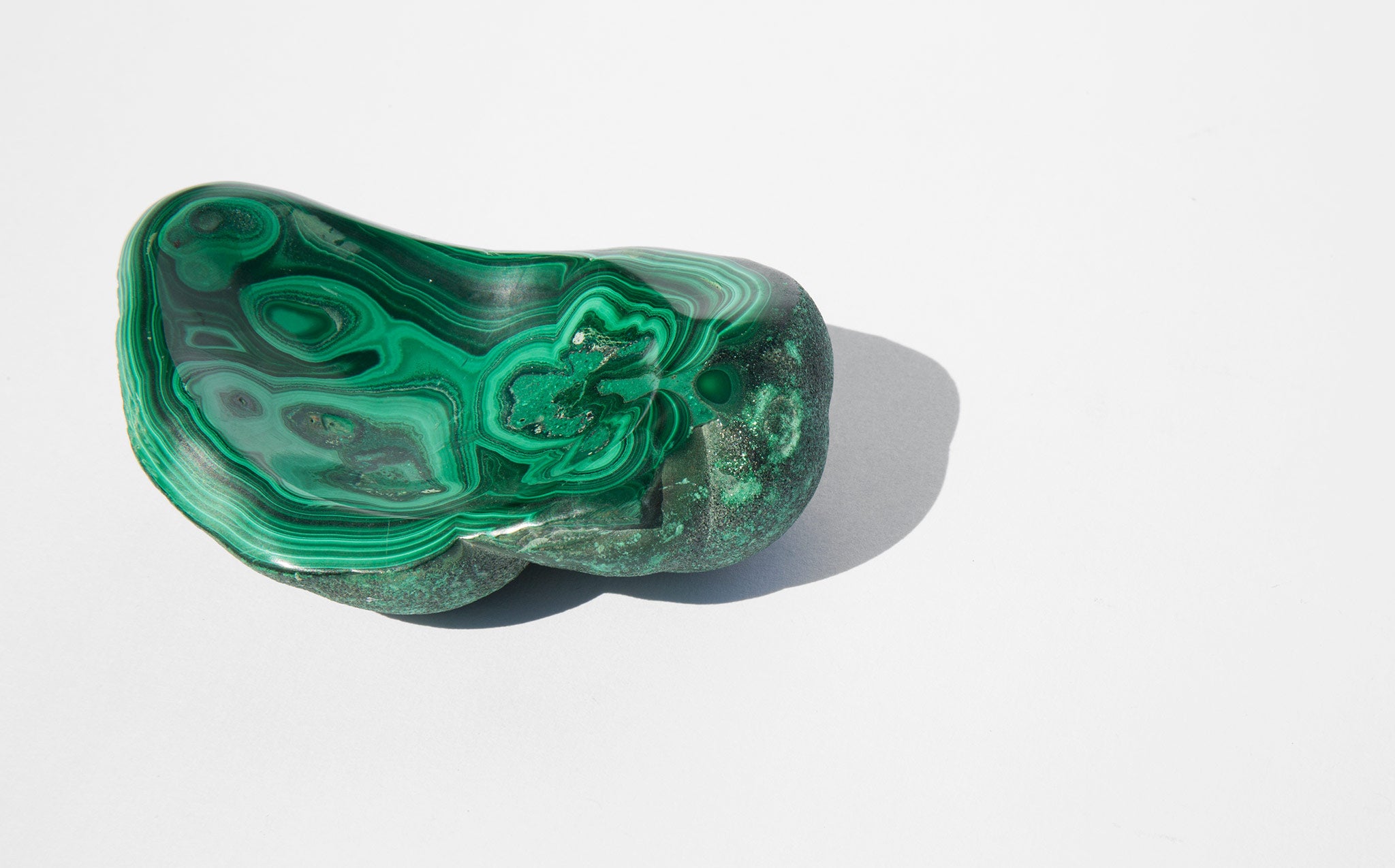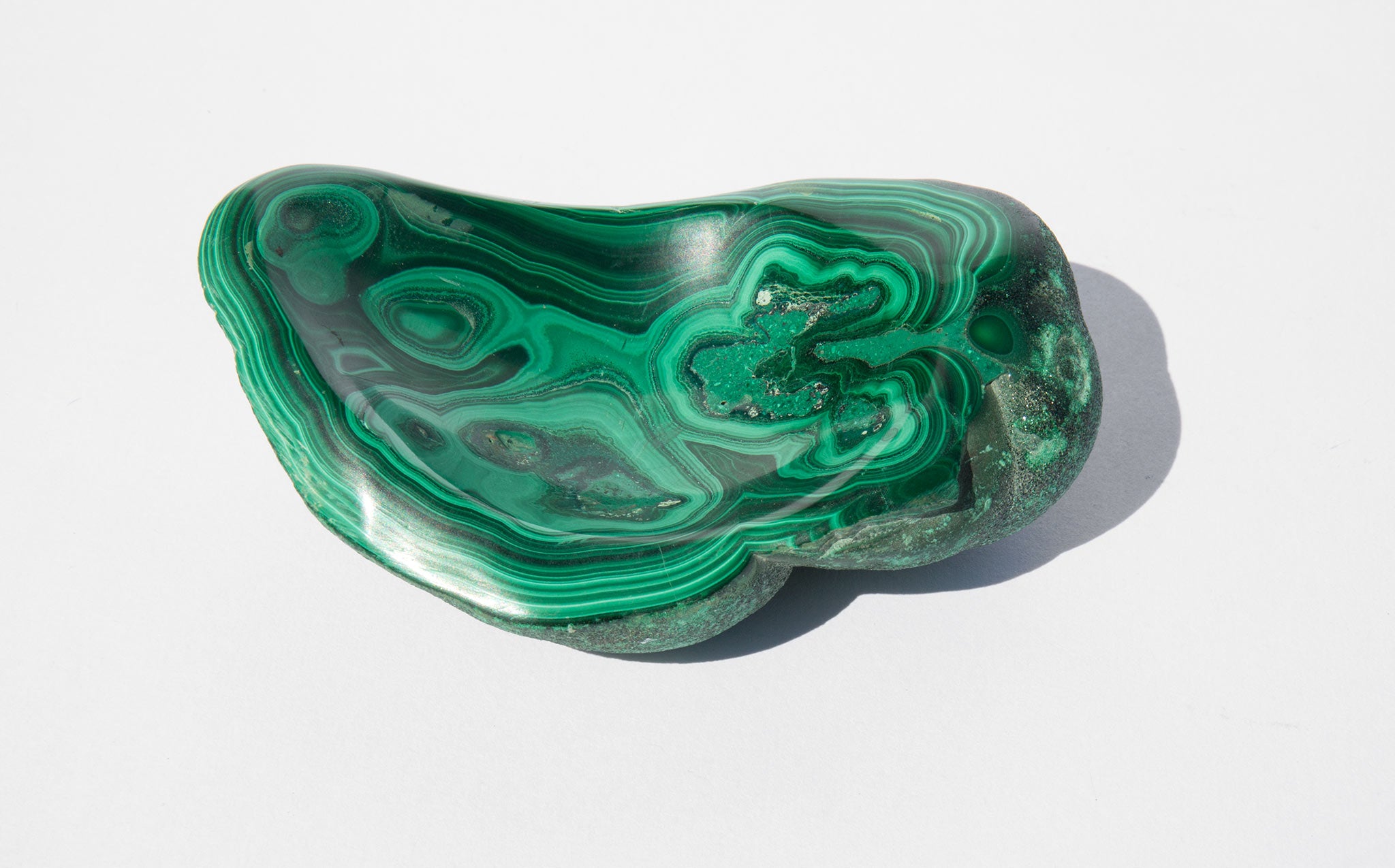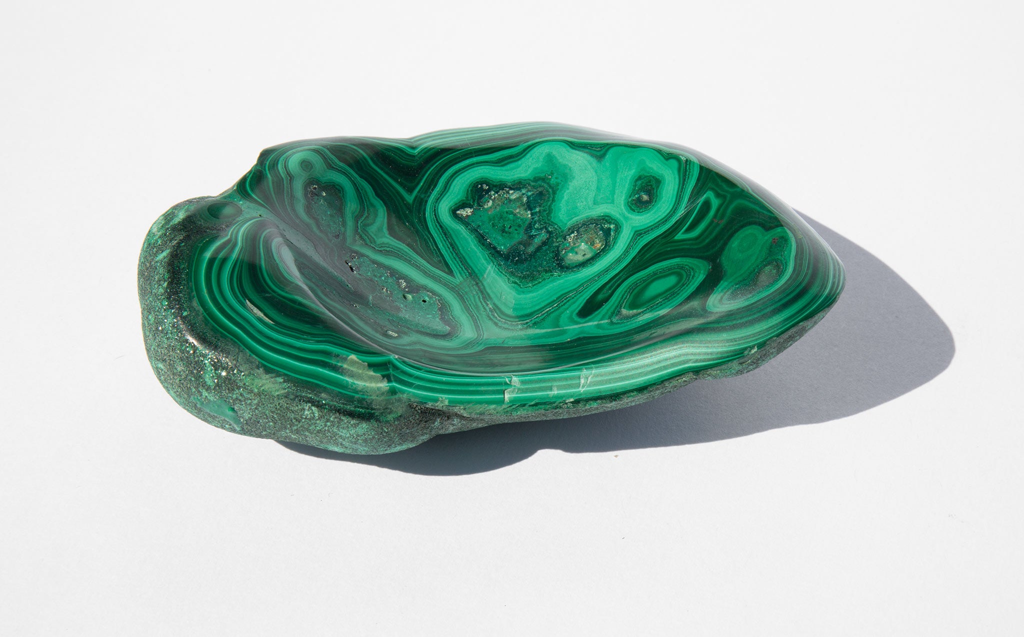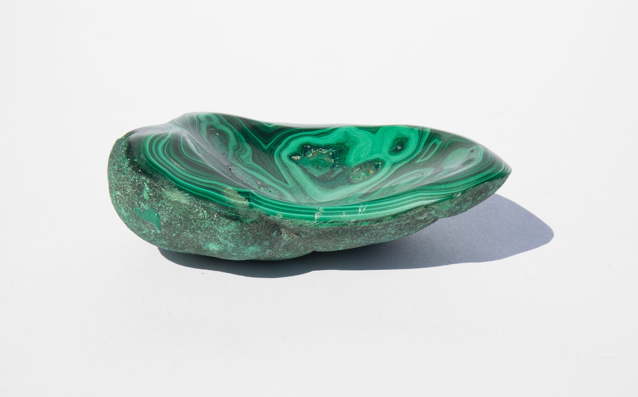 A natural, solid piece of malachite that is unpolished and lightly shimmers on the outside with a polished and smooth interior basin.