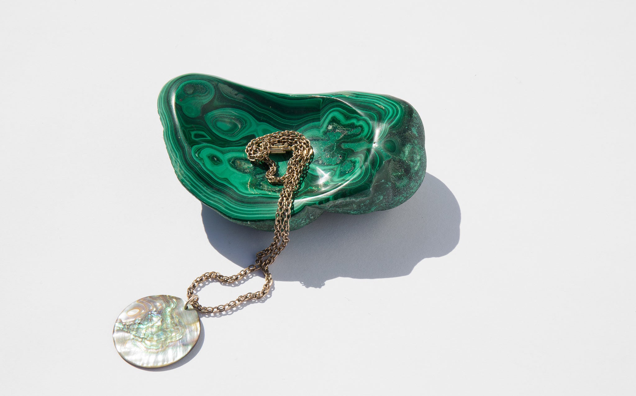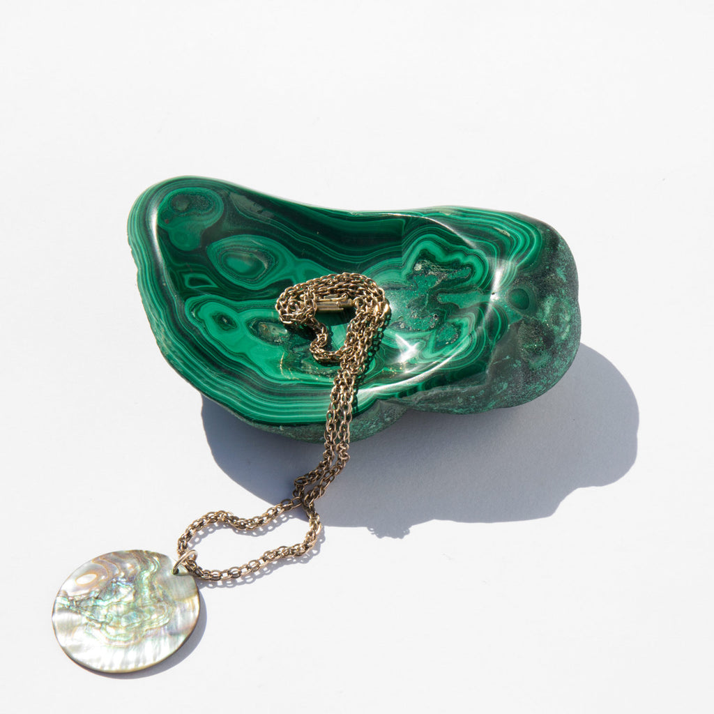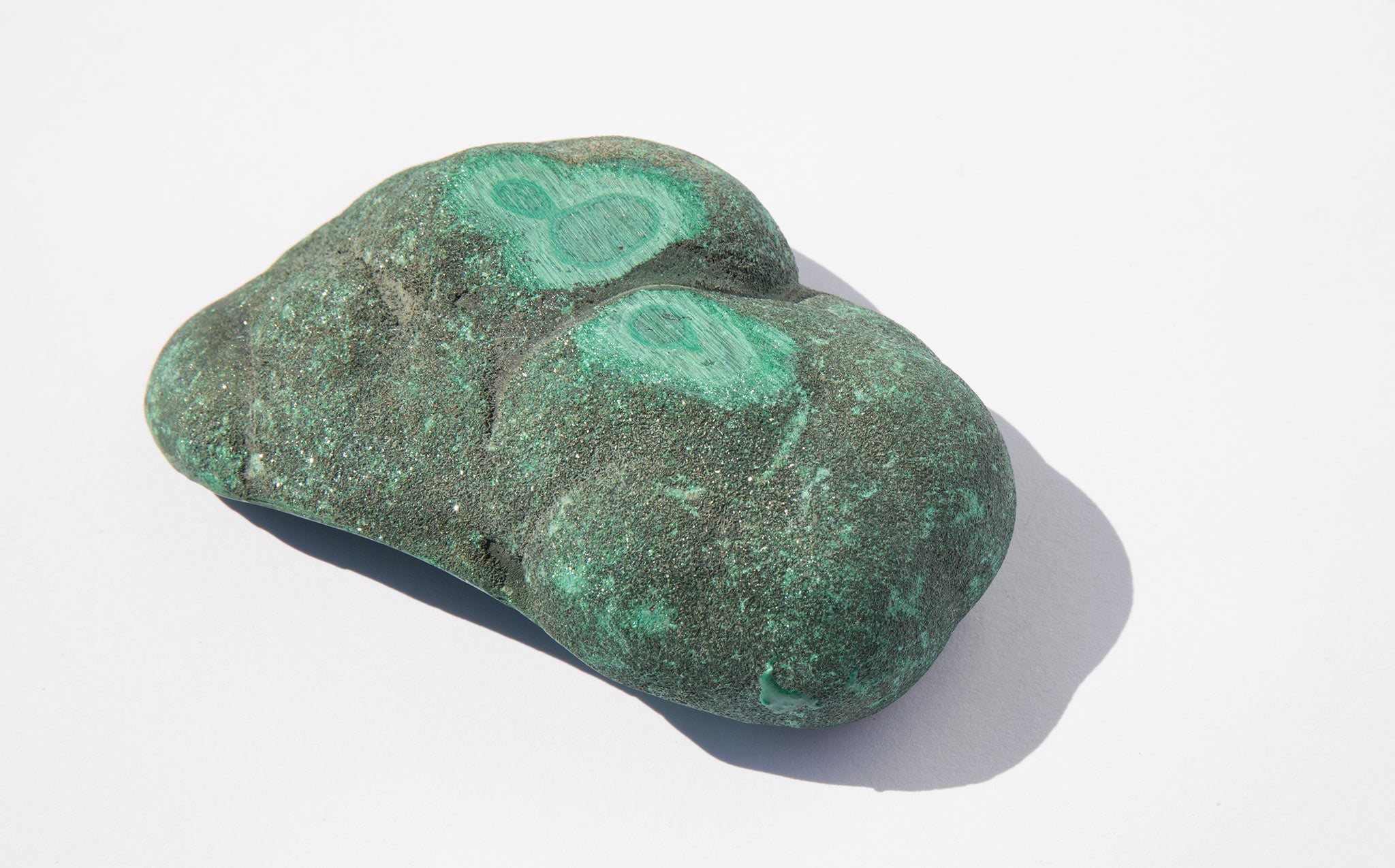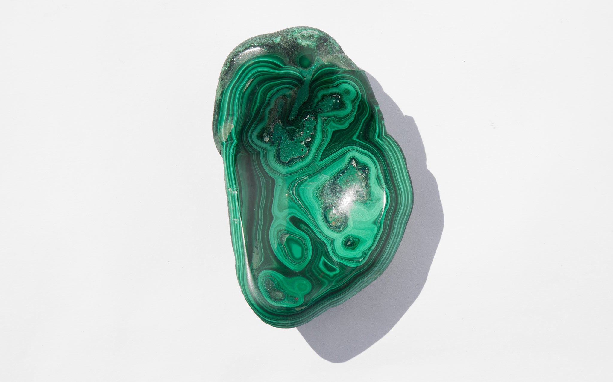A natural, solid piece of malachite that is unpolished and lightly shimmers on the outside with a polished and smooth interior basin.
