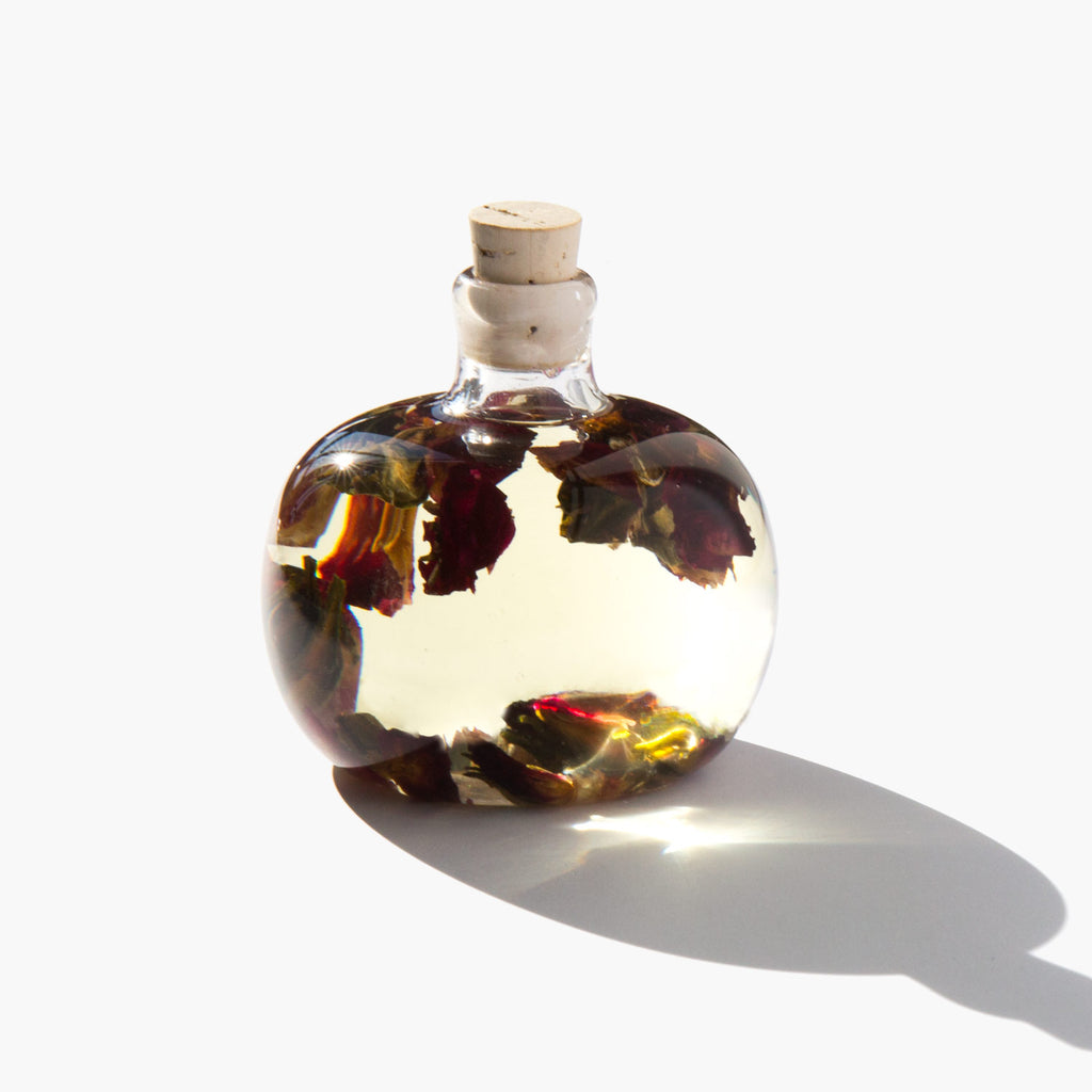 Ingredients: organic Bulgarian rose otto essential oil, hand distilled Omani frankincense oil, organic tuberose absolute, organic cinnamon leaf essential oil, organic black pepper essential oil, organic patchouli essential oil, and whole organic rosebuds in an organic fractionated coconut base.