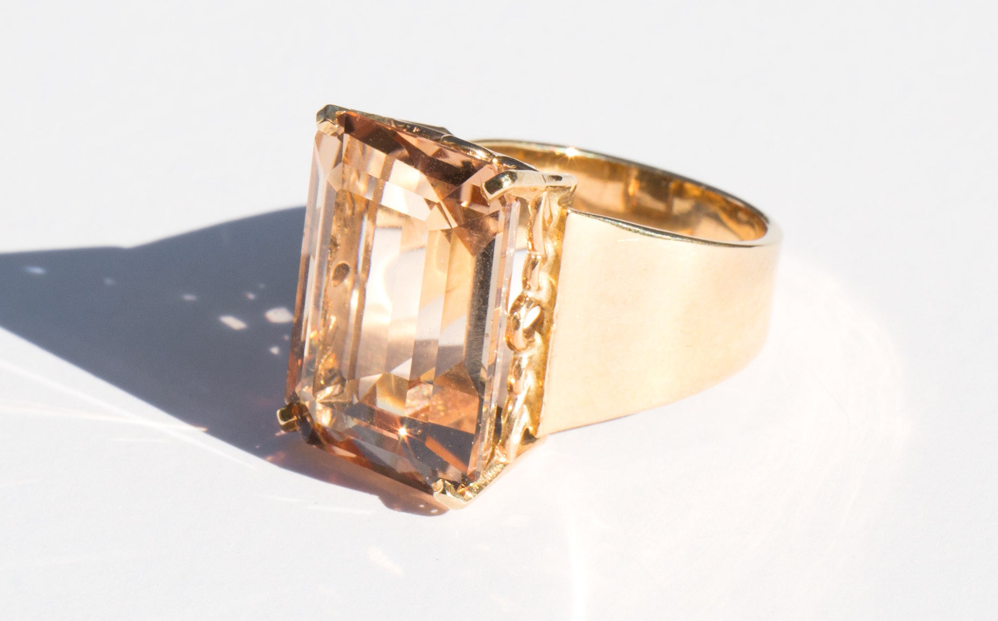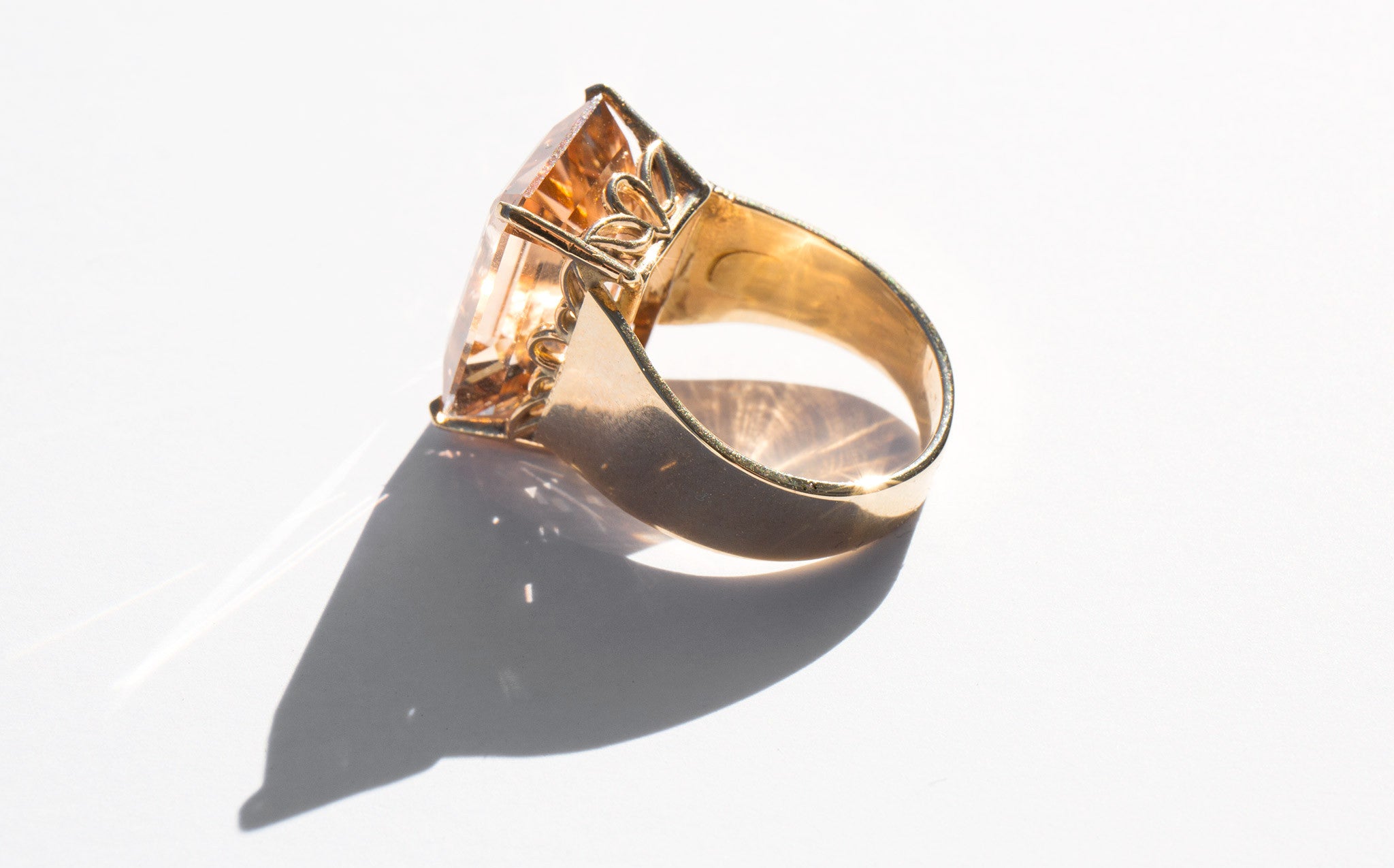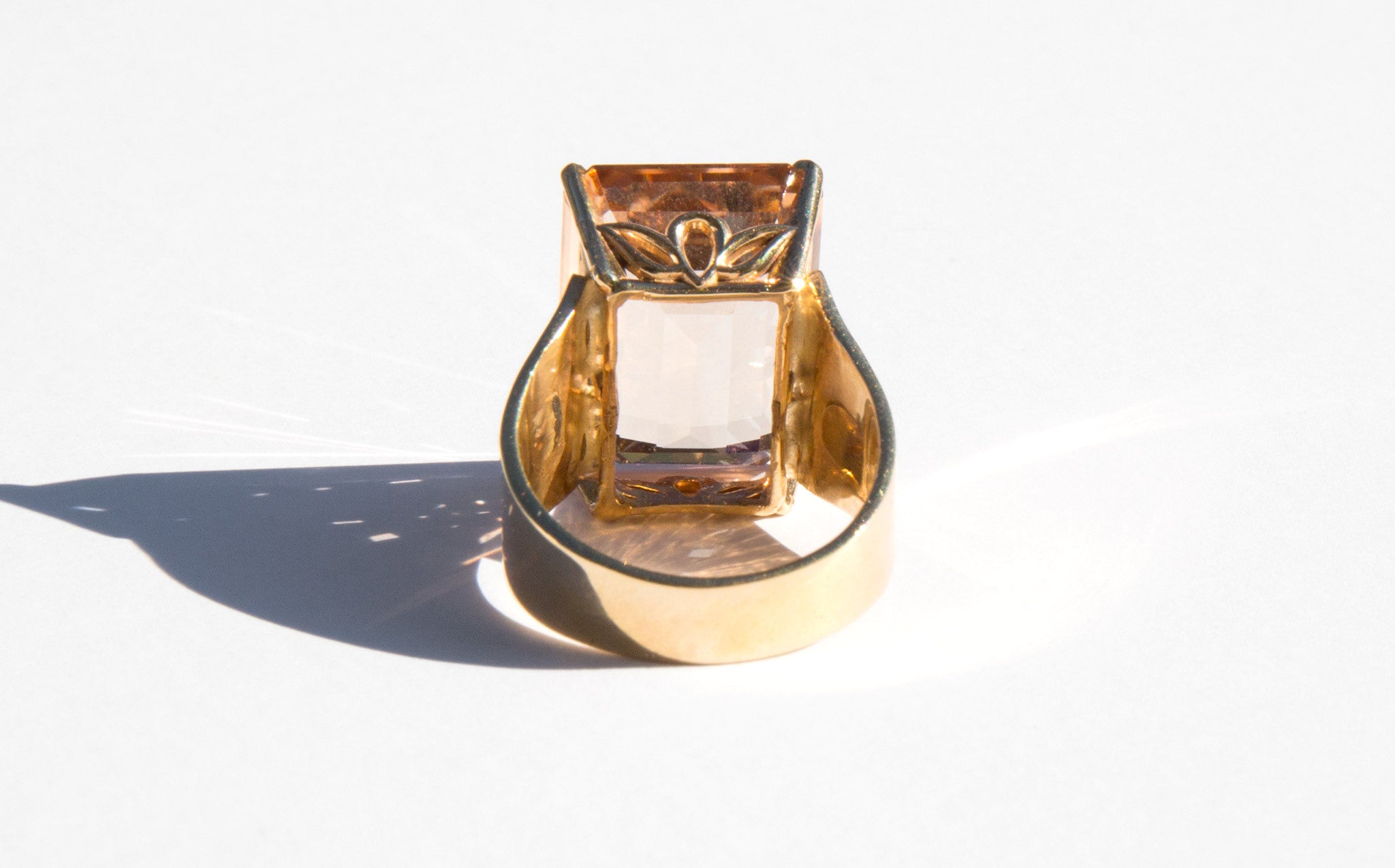 Rare large precious topaz in a 1960's handmade, salmon pink hued 14k gold cocktail setting.