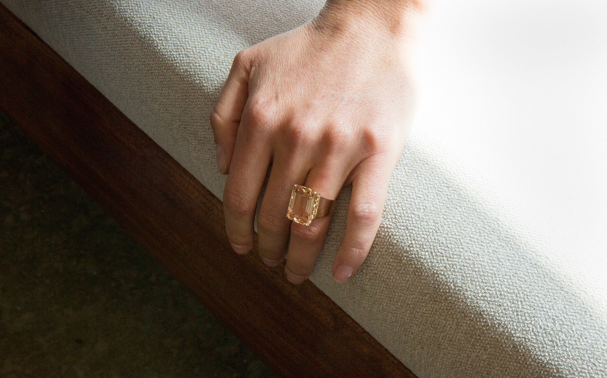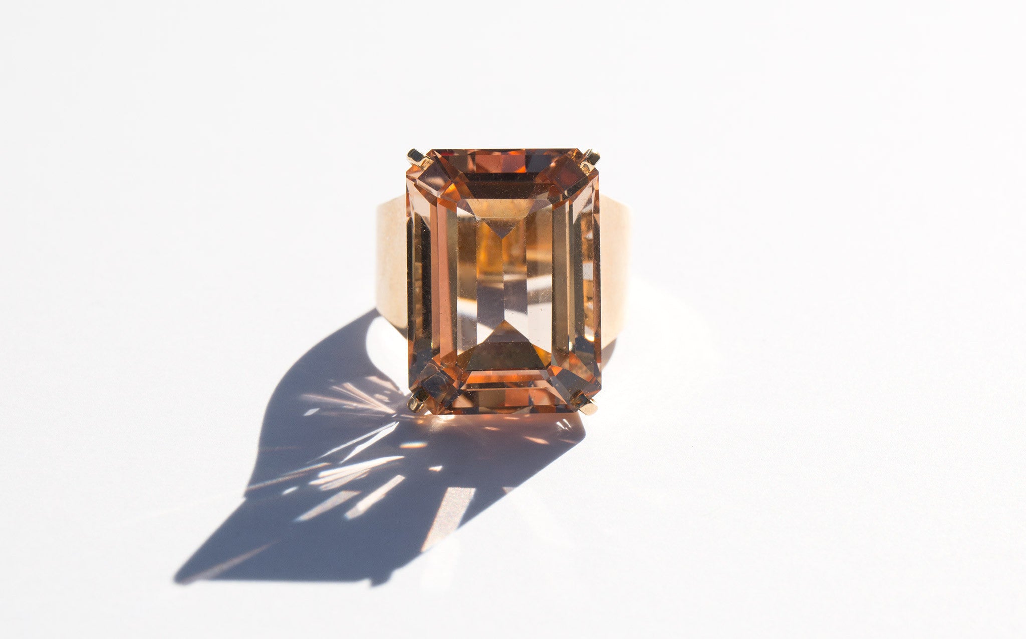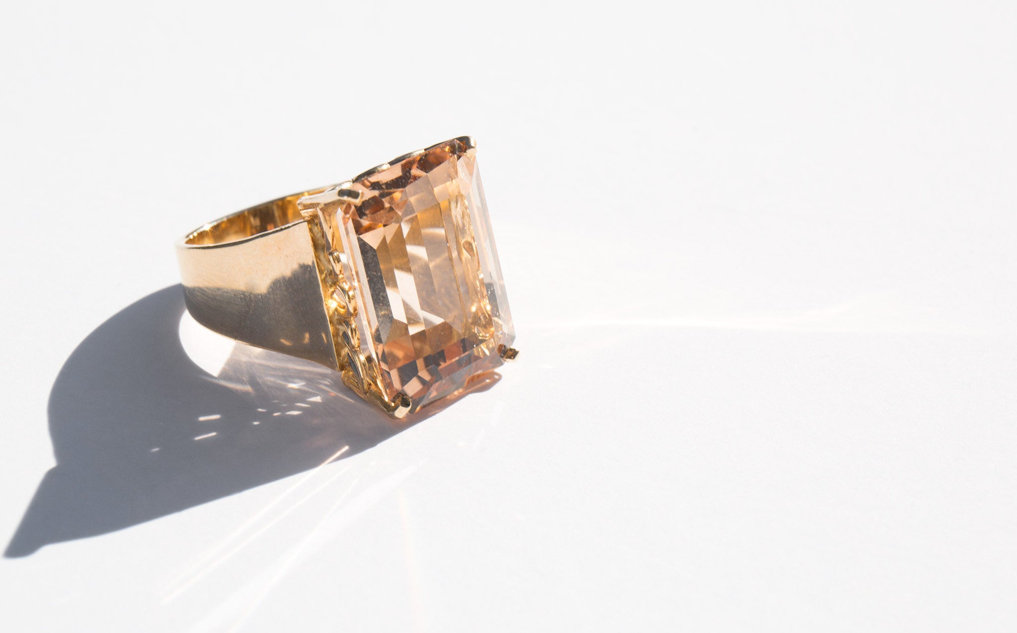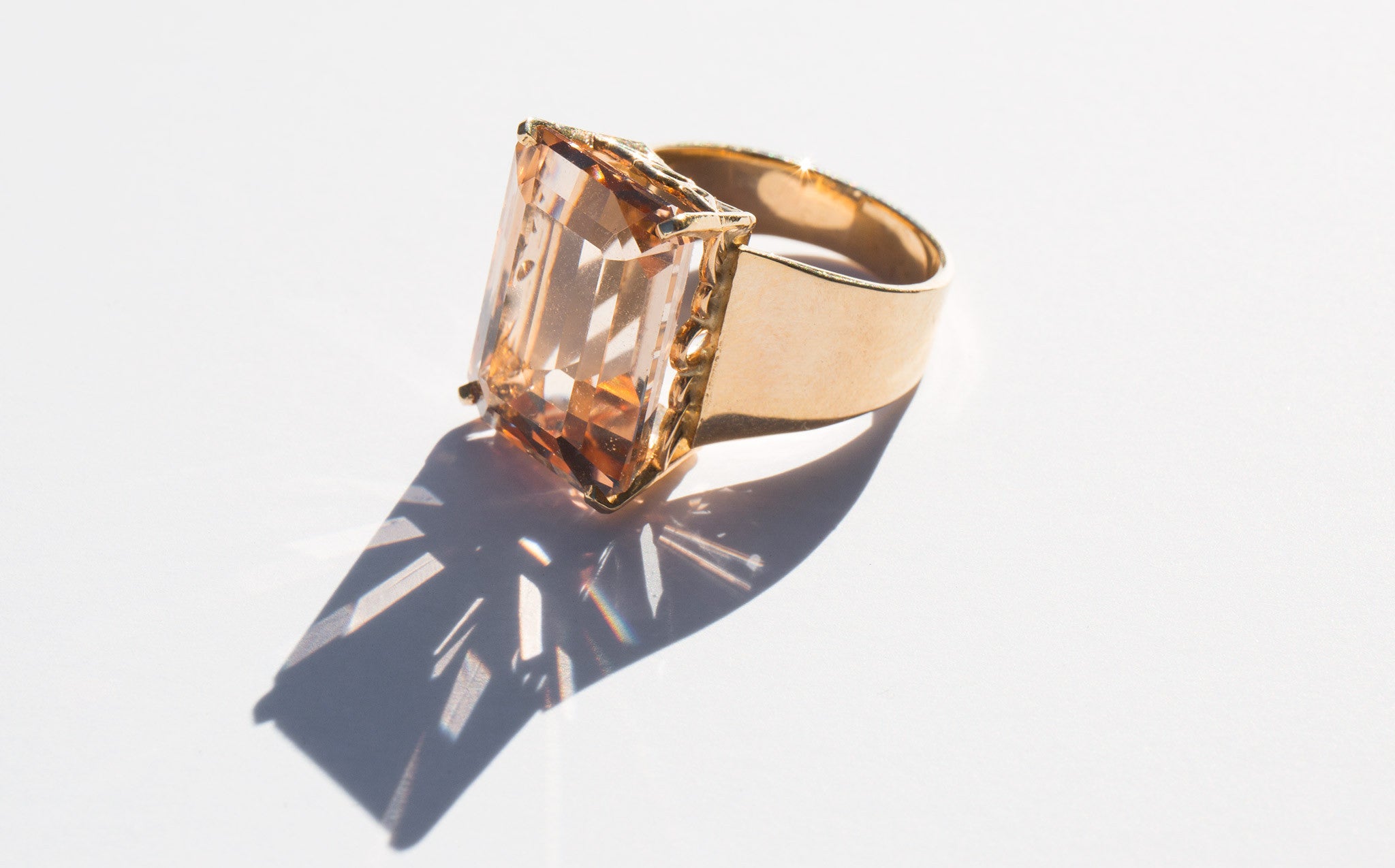 Rare large precious topaz in a 1960's handmade, salmon pink hued 14k gold cocktail setting.