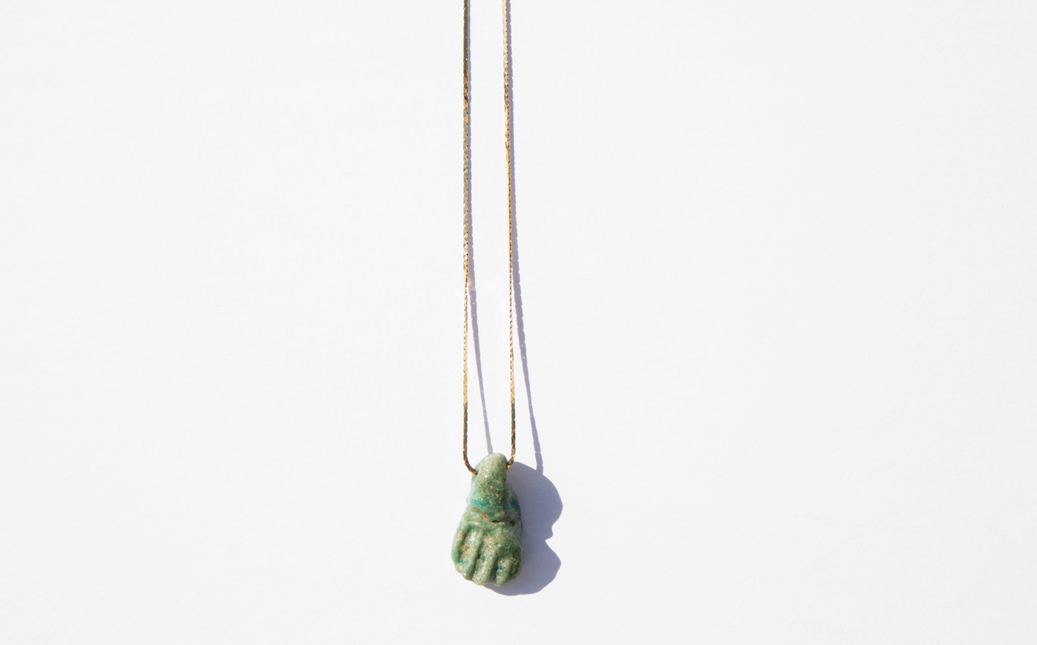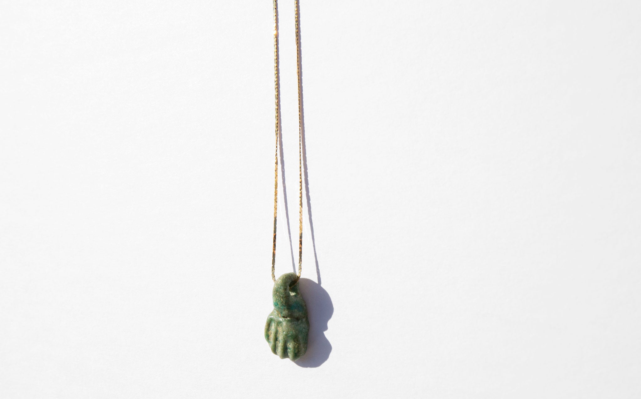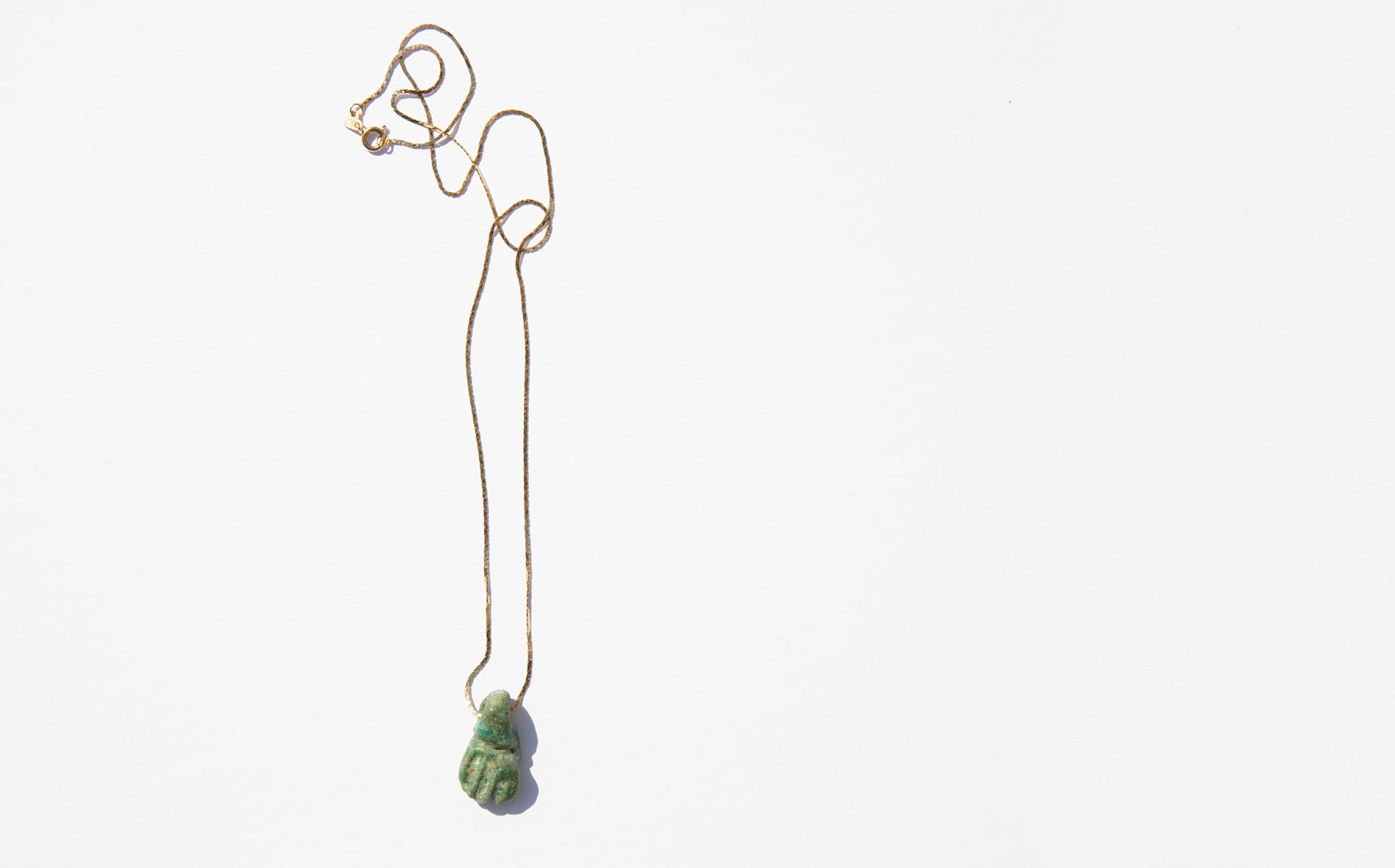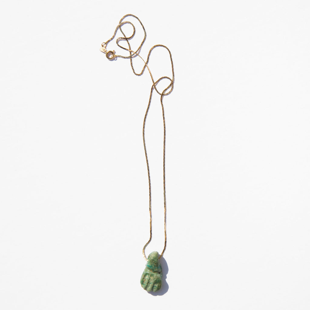 An antique rough jade mano figa strung on a sparking 14k gold whisper chain. Mano Figa is literally translated in Italian as fig hand and in some cultures the gesture is seen as obscene and representing the female genitalia. In Italian culture the figa is used as a magically protective element to ward off evil curses and bad luck of all kinds.