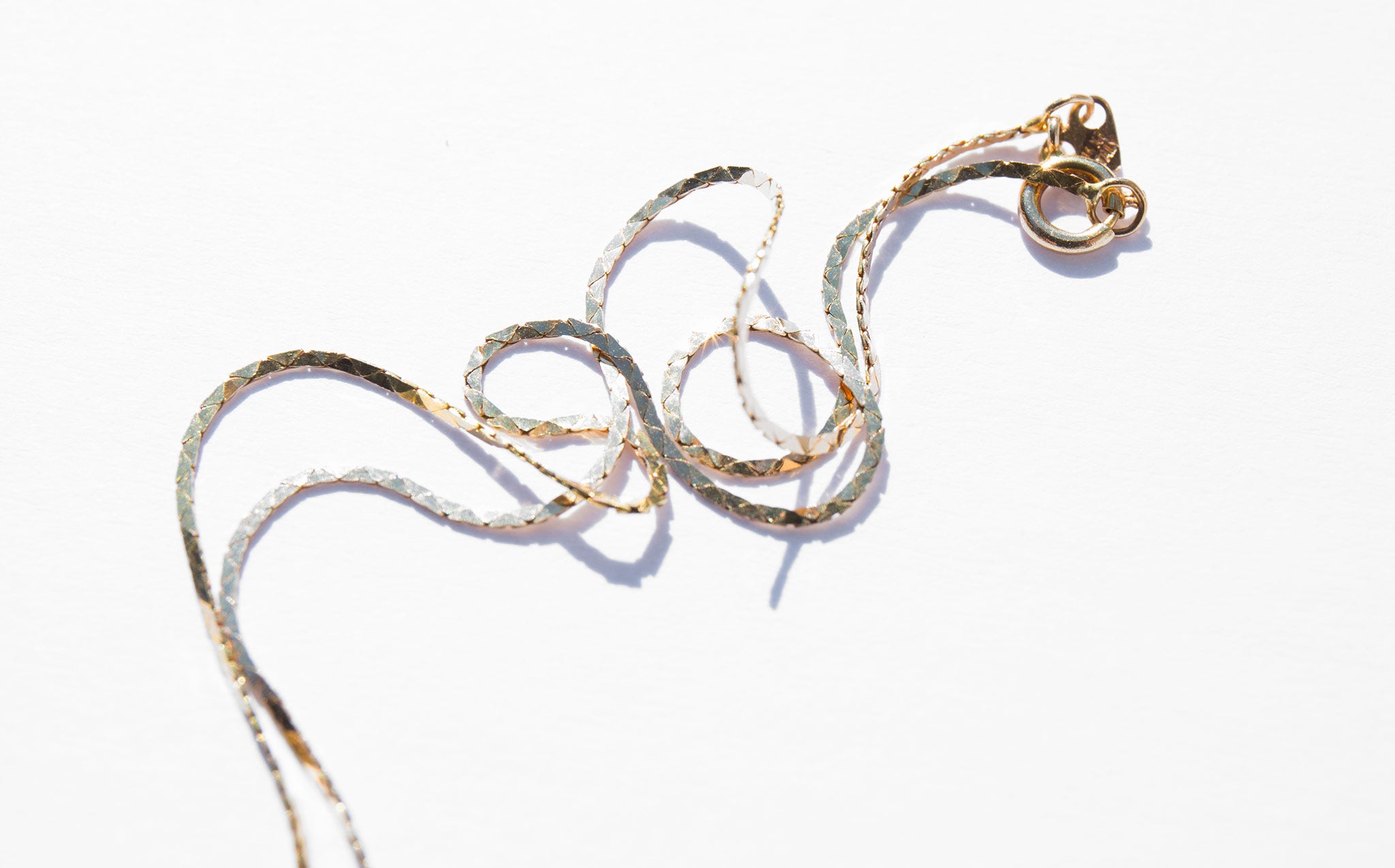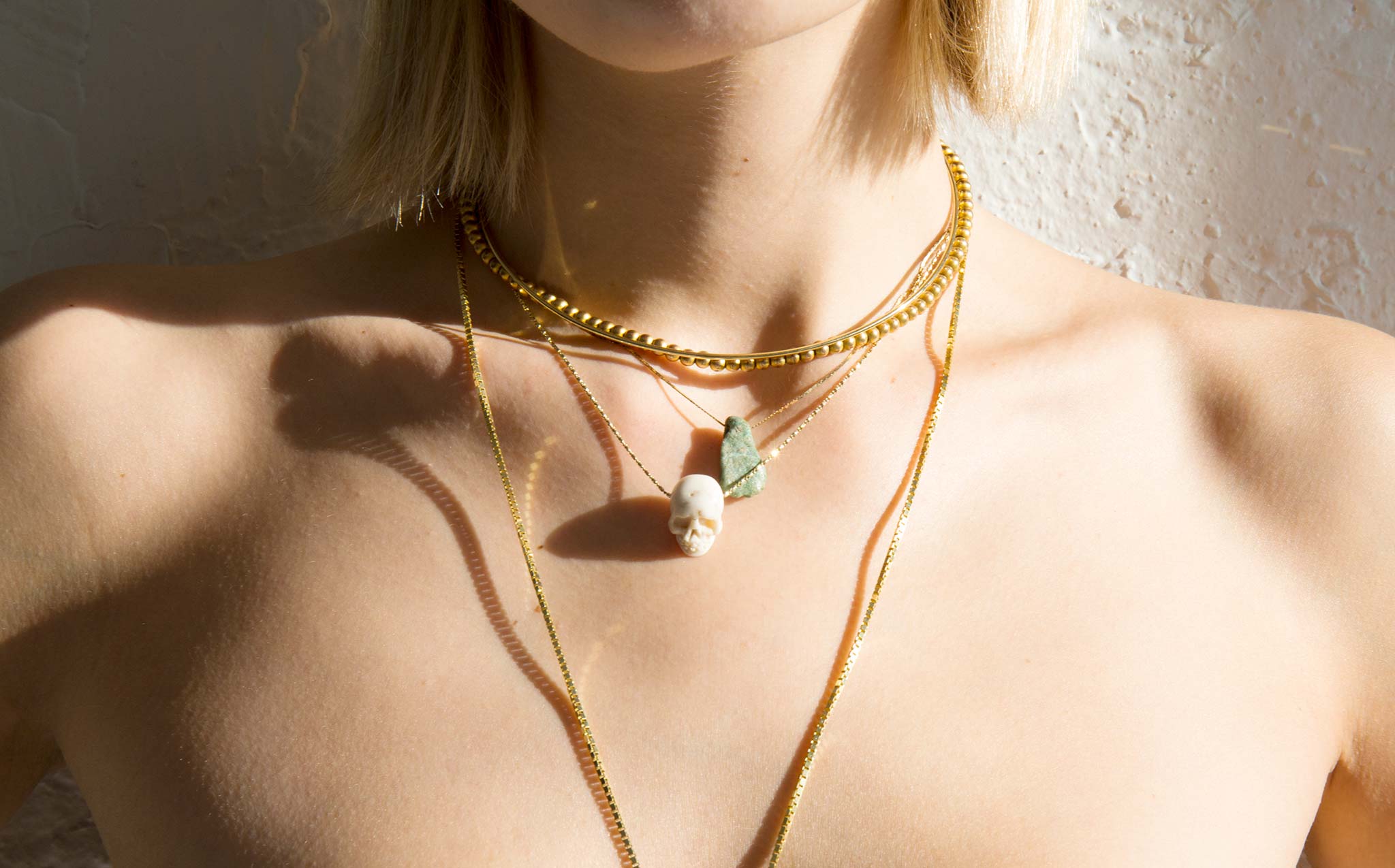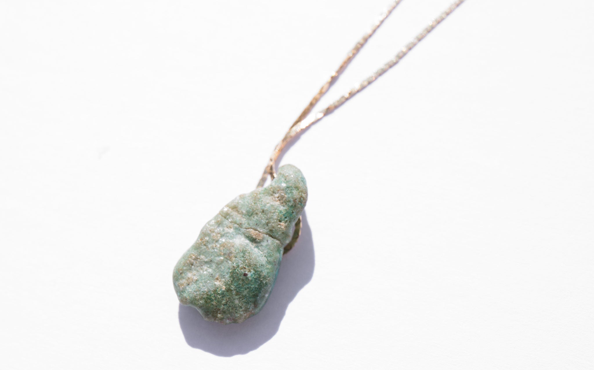 An antique rough jade mano figa strung on a sparking 14k gold whisper chain. Mano Figa is literally translated in Italian as fig hand and in some cultures the gesture is seen as obscene and representing the female genitalia. In Italian culture the figa is used as a magically protective element to ward off evil curses and bad luck of all kinds.