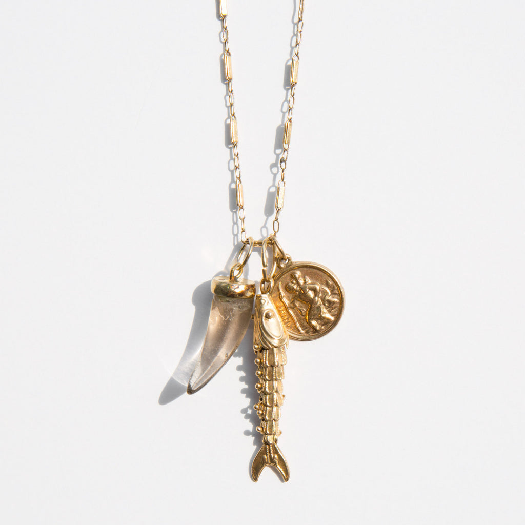 A delicate and unusual 14k gold link chain with a 14k fish, symbolic of freedom in Buddhist culture, quartz, a powerful stone to draw off negative energy, and a 14k gold St Christopher, the patron saint of travelers, mariners and unofficially surfers because he is said to provide protection against severe weather and danger.