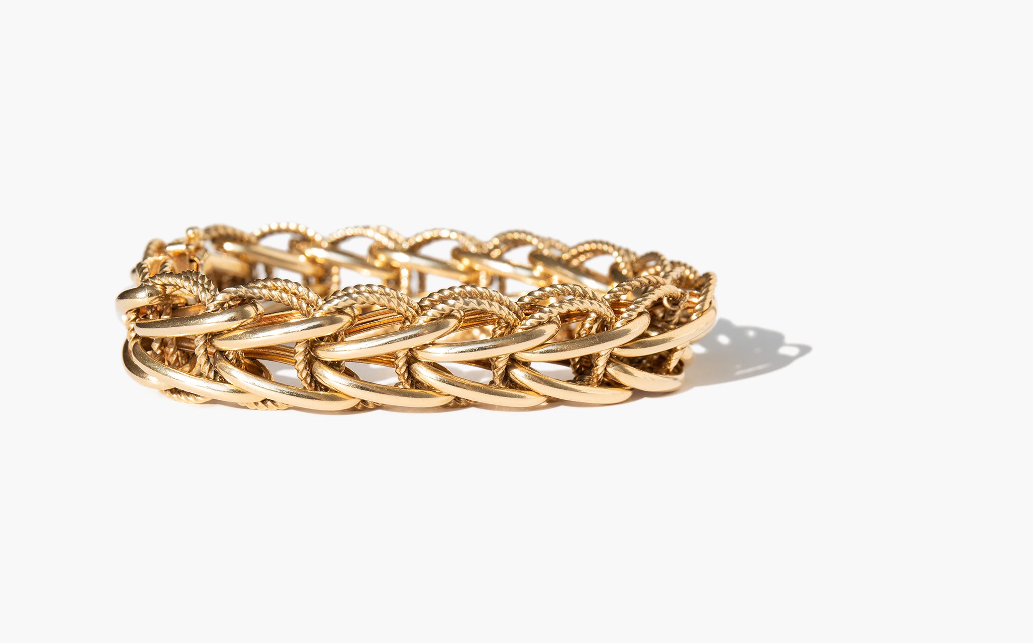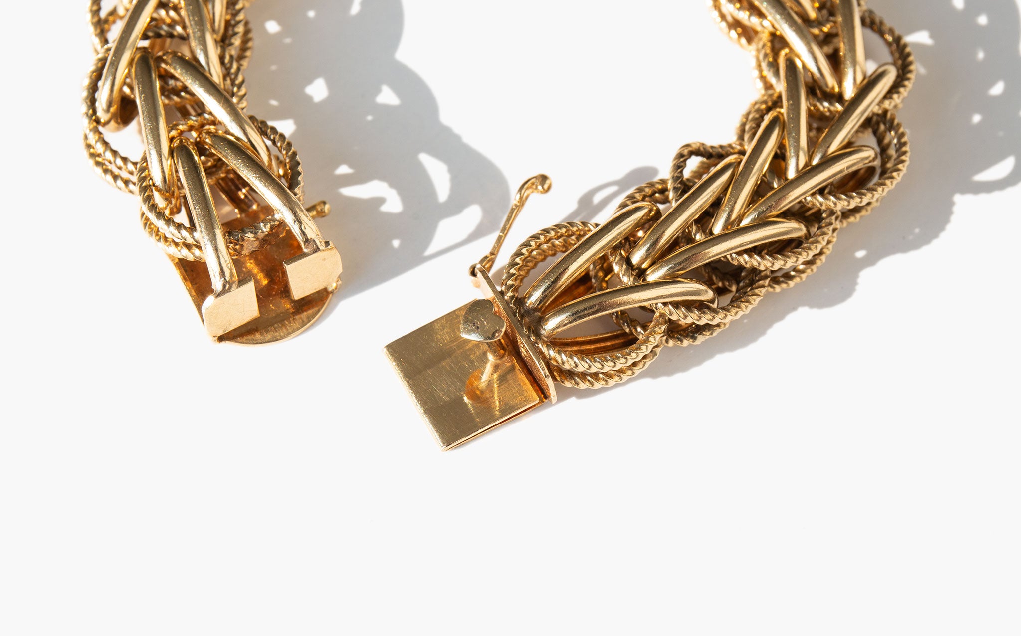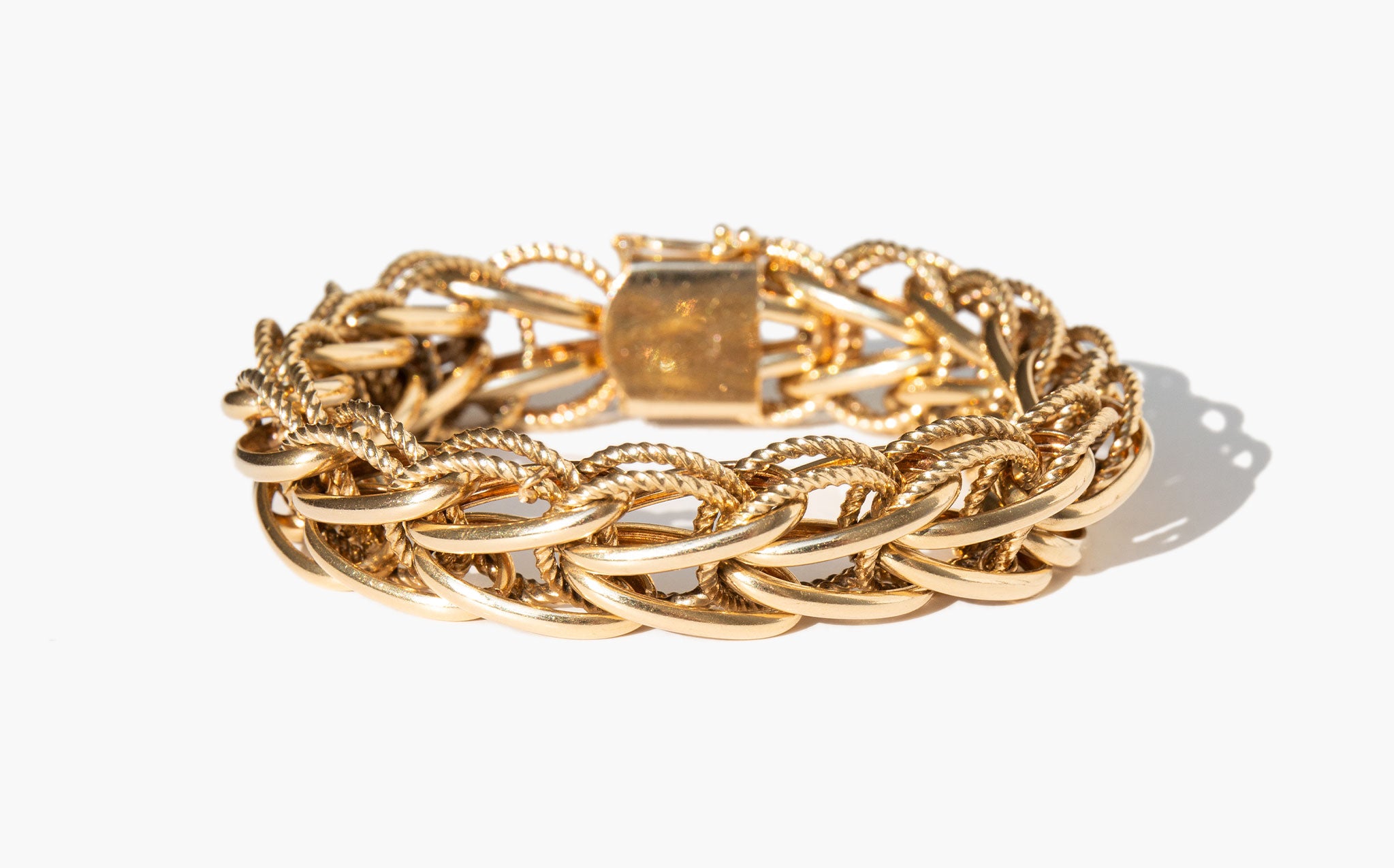 Decadent and weighty mid-century statement bracelet with woven textured and smooth links.
