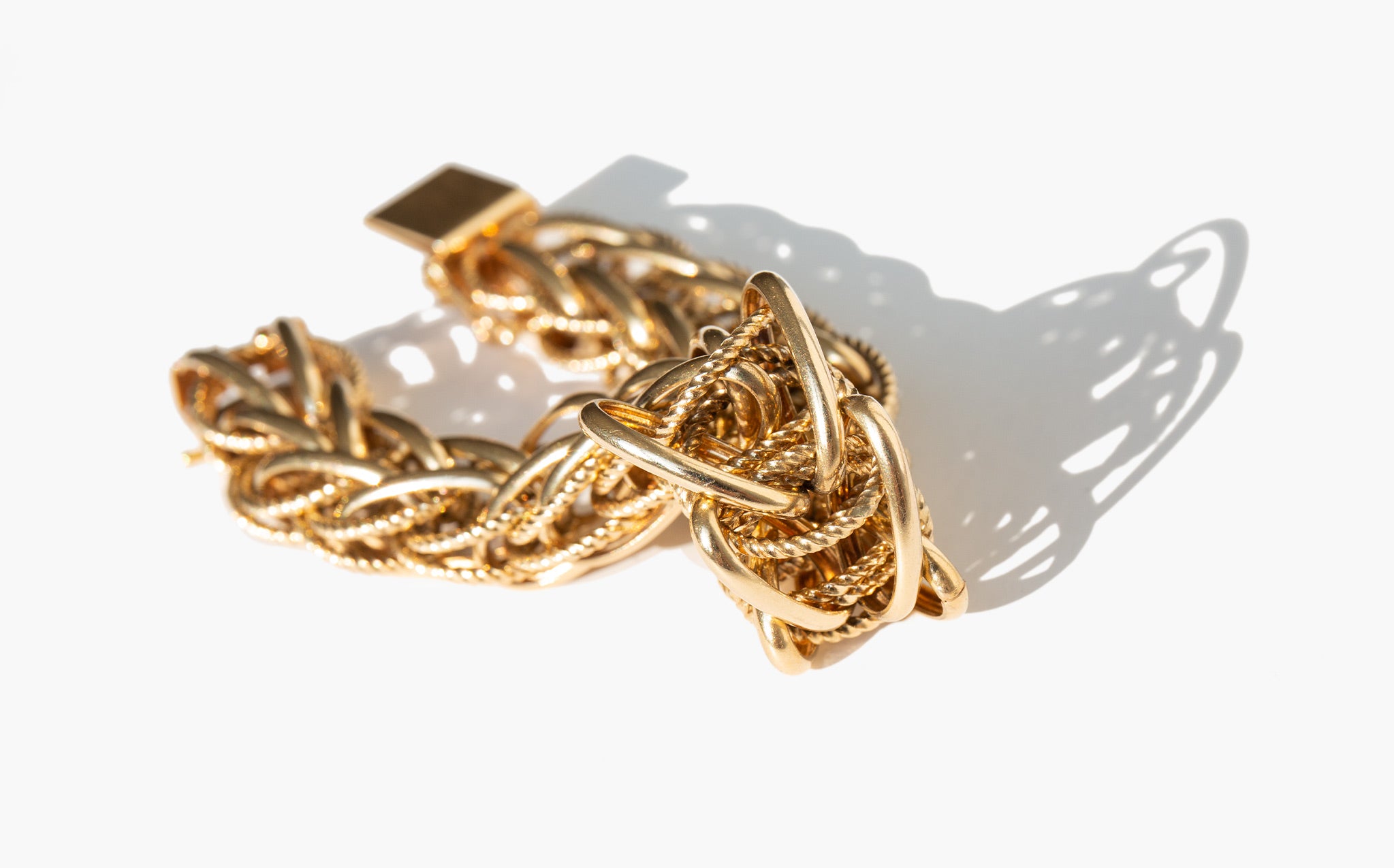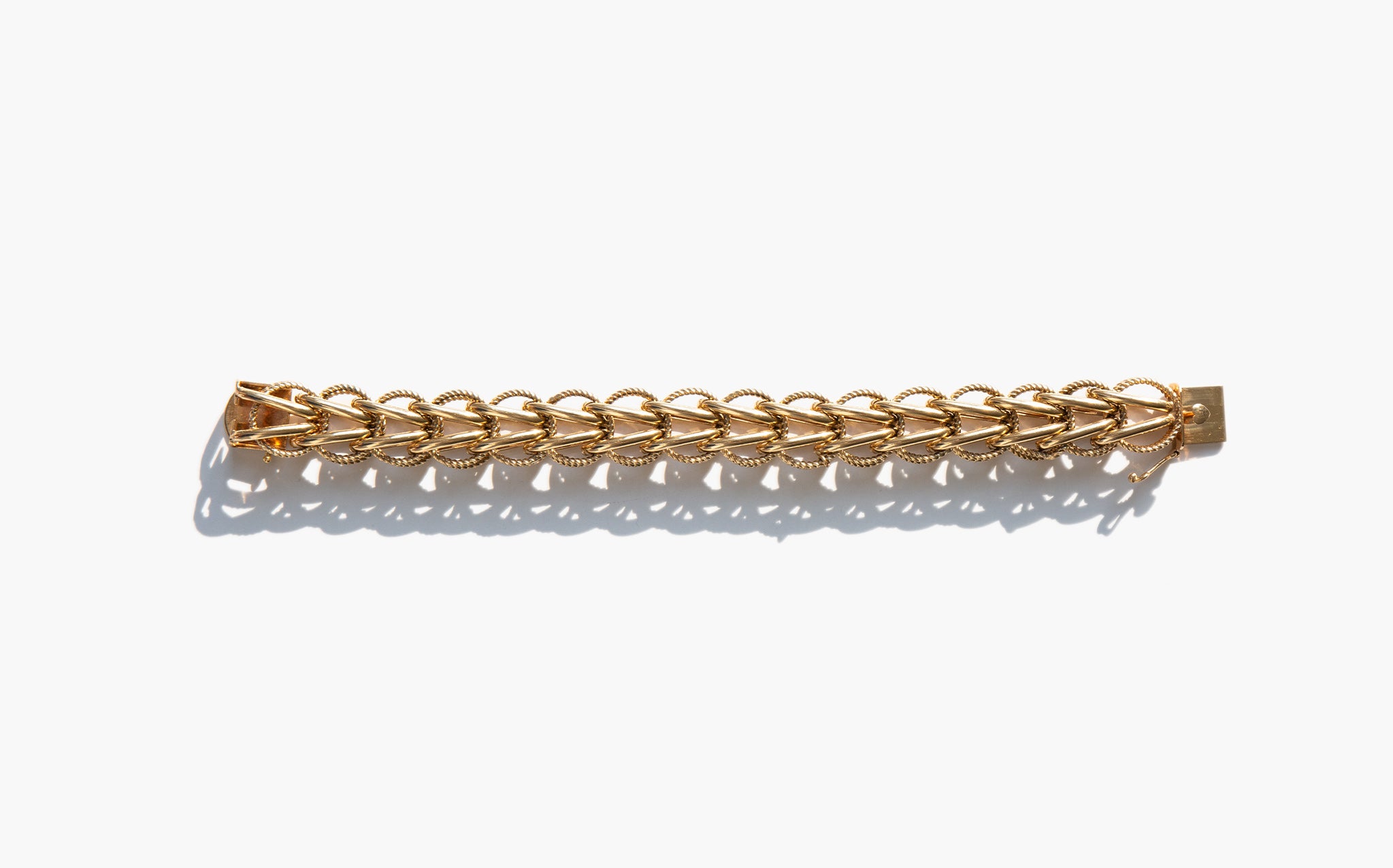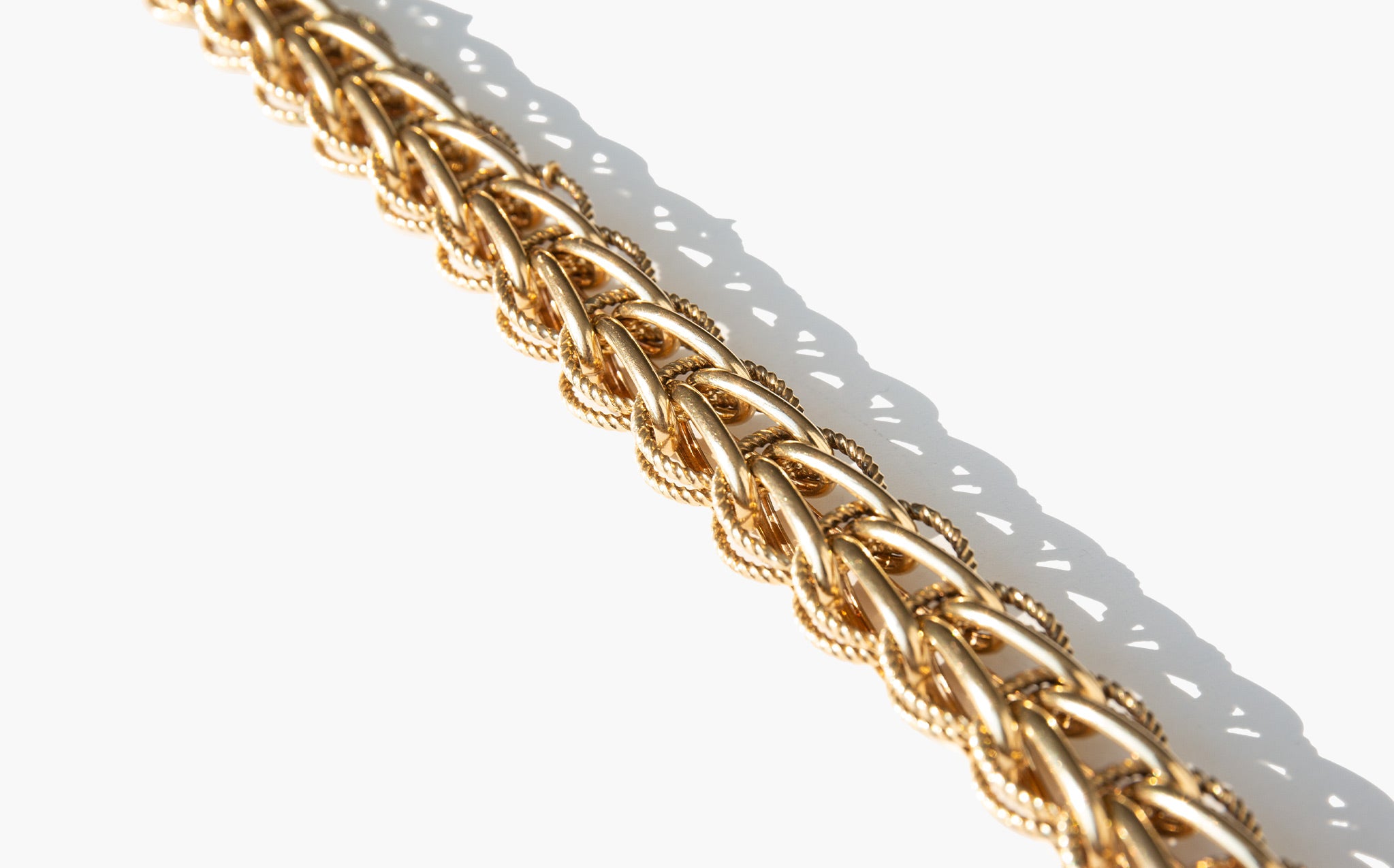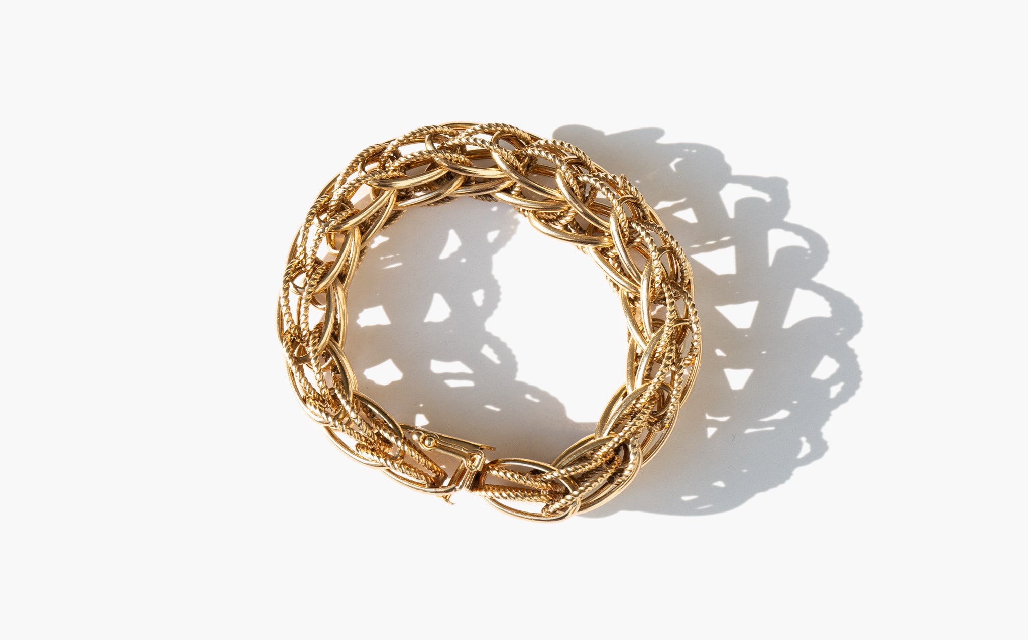Decadent and weighty mid-century statement bracelet with woven textured and smooth links.