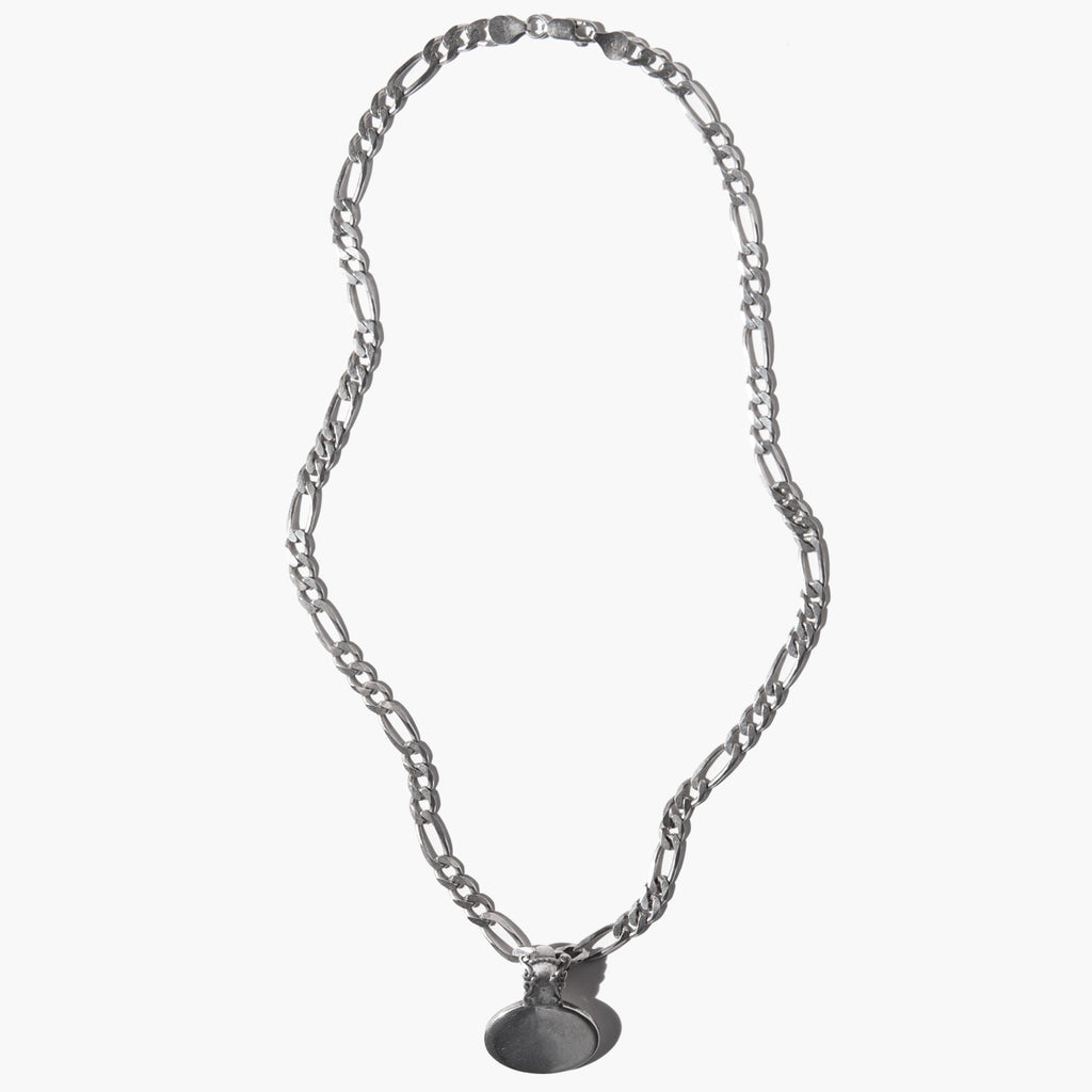 Sterling silver figaro chain with a solid Mexican sterling silver nameplate pendant.