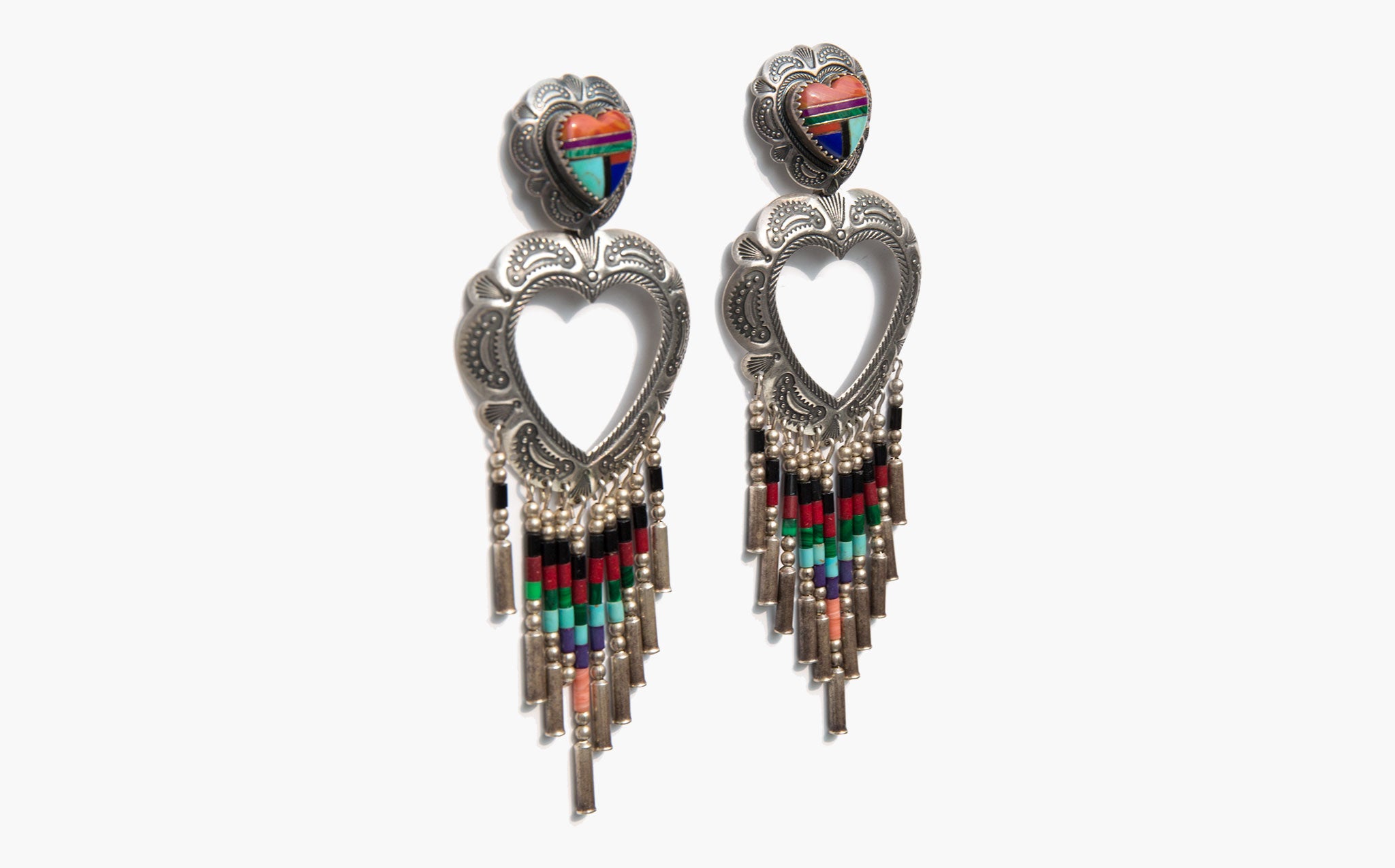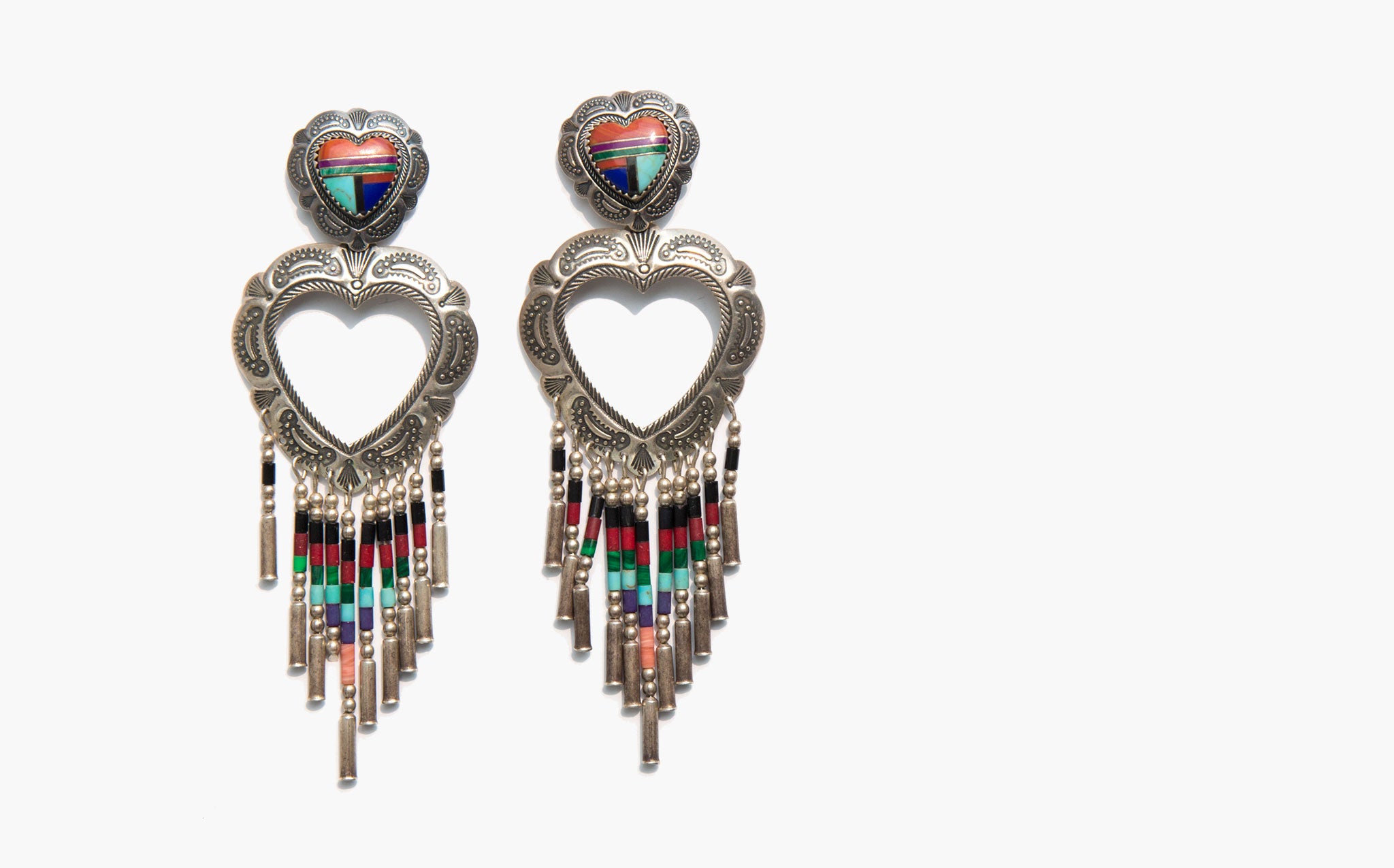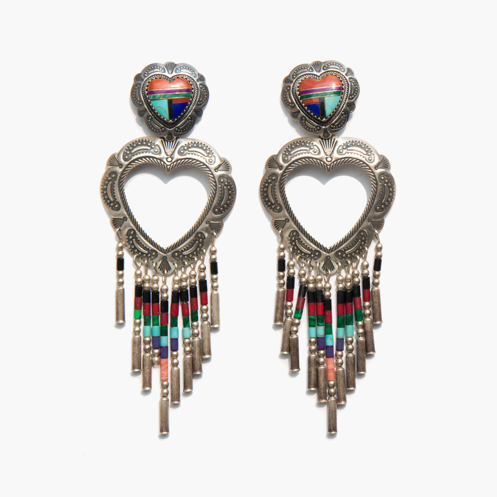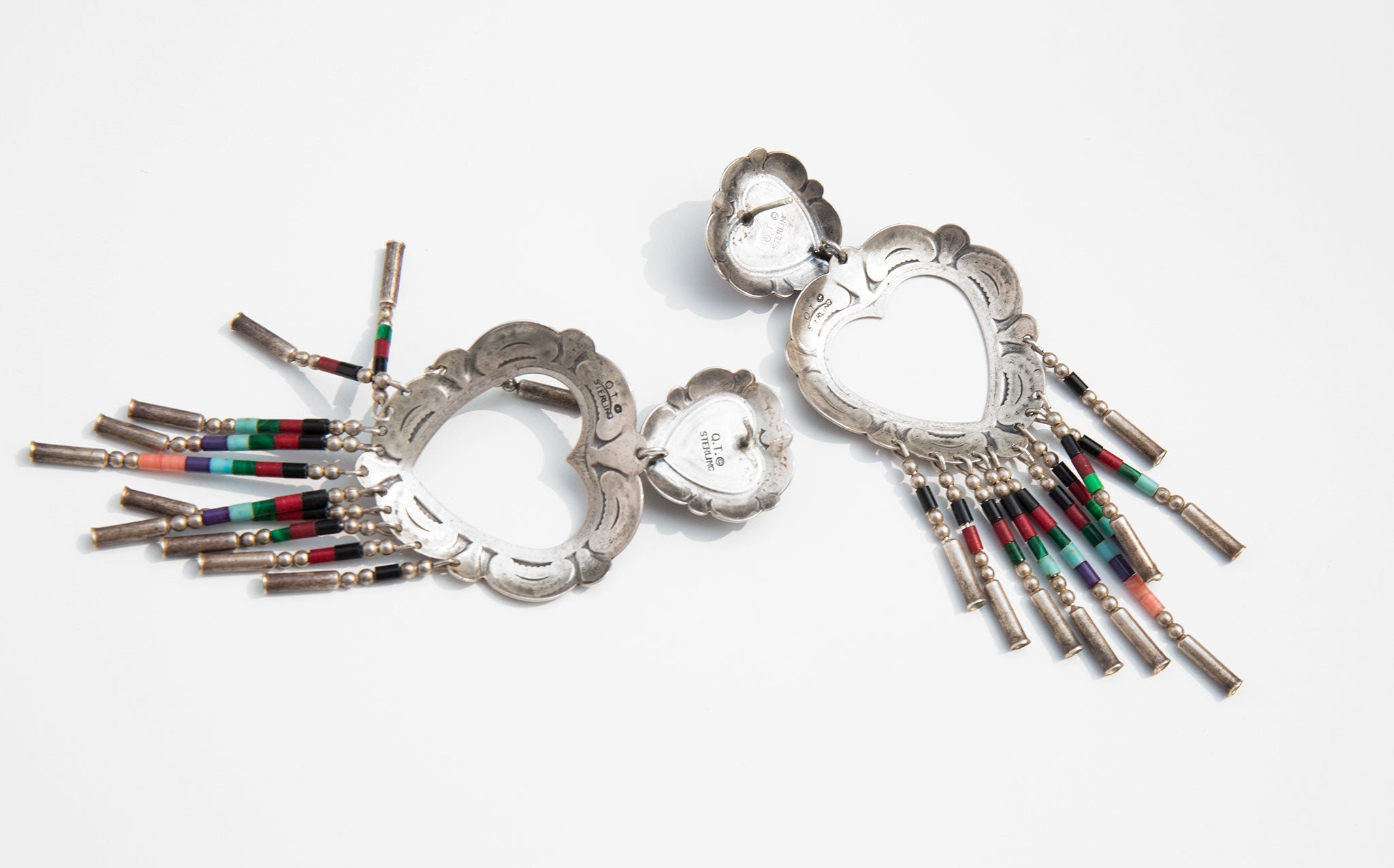 Sterling silver statement earrings with turquoise, lapis, malachite and other inlaid stones.