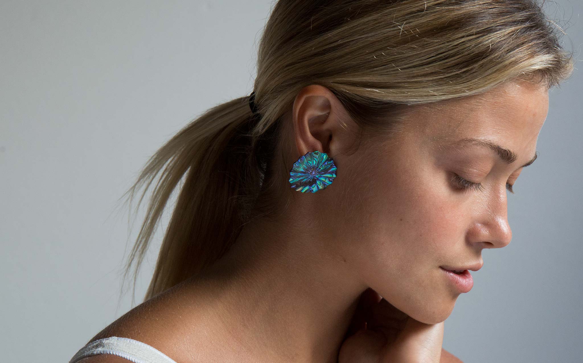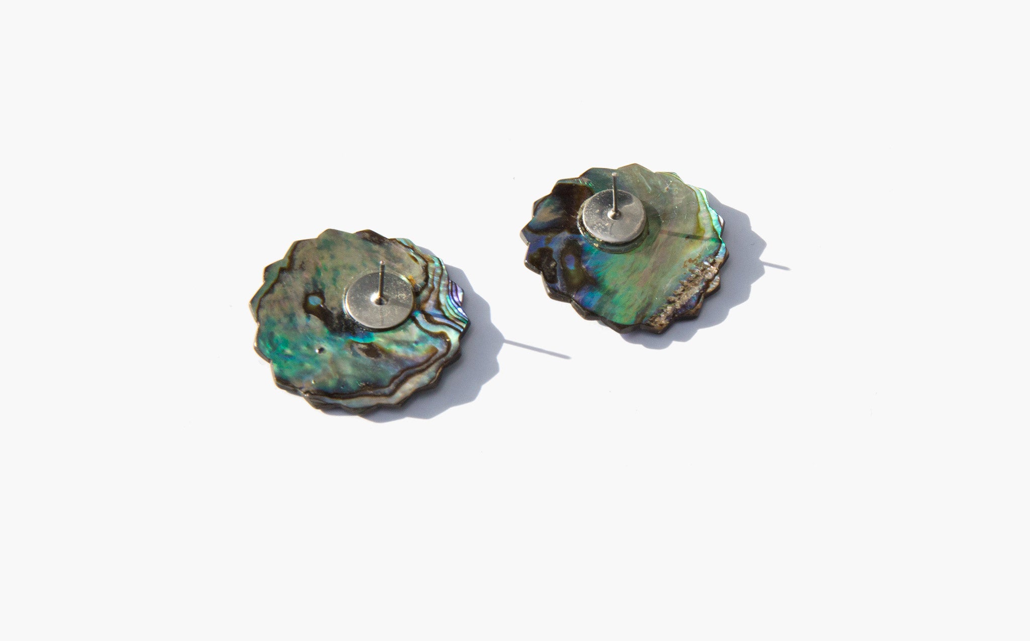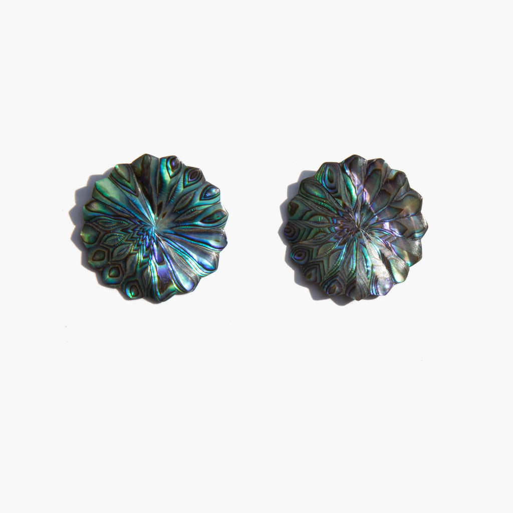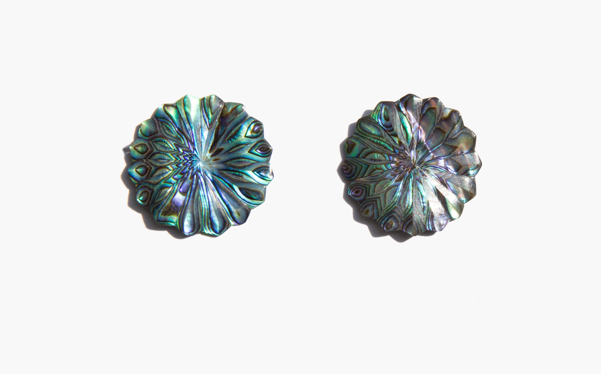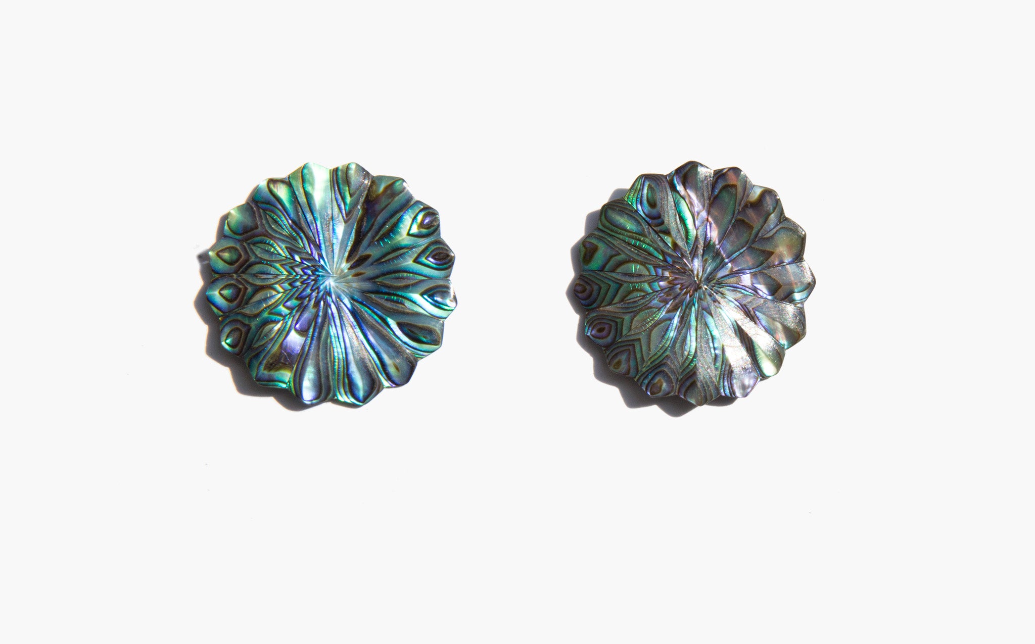 Brilliantly iridescent abalone earrings with peacock feather detailing.