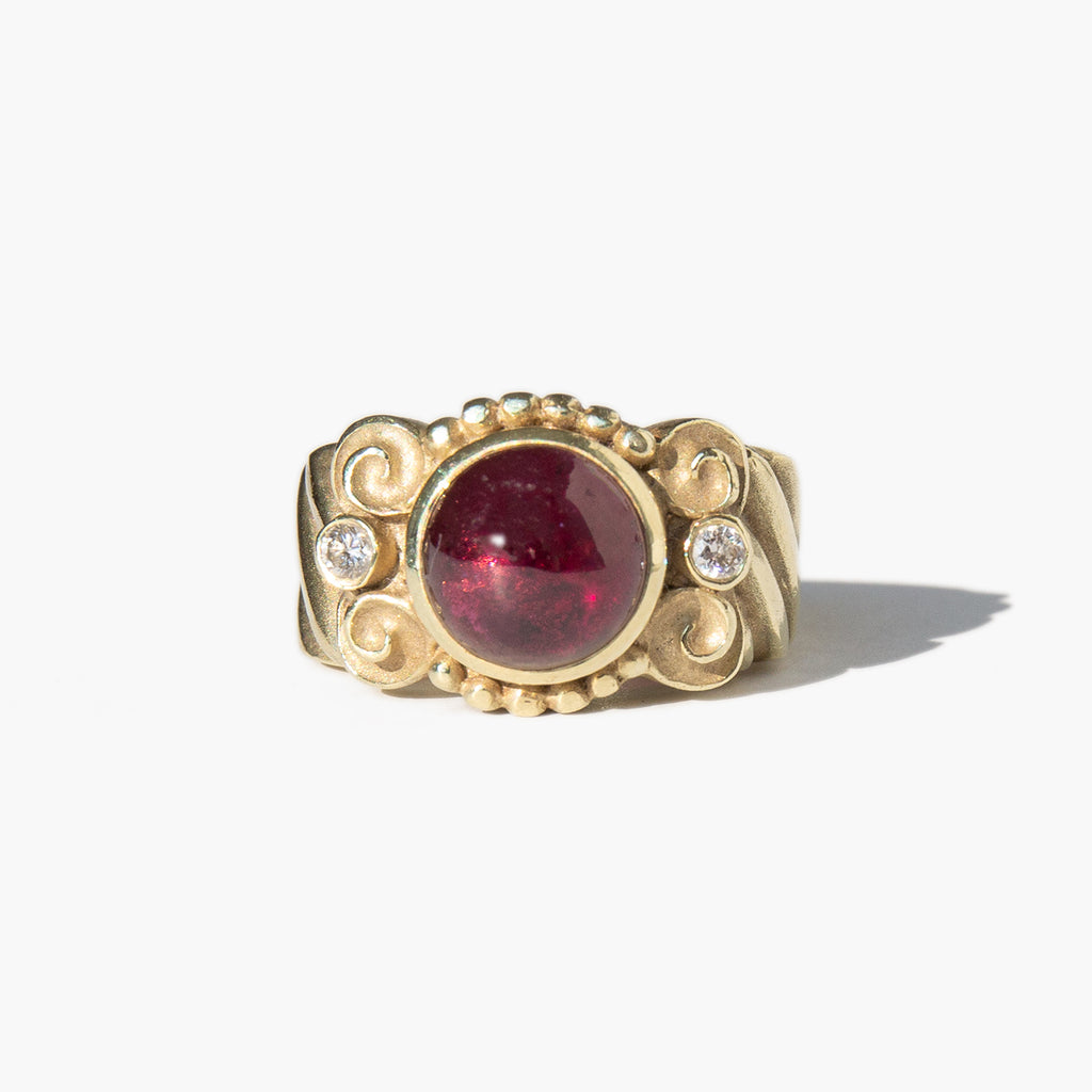 Majestic and detailed 14k gold ring with a large center garnet cabochon flanked by two tiny accent diamonds. A popular amulet of the middle ages, the garnet was thought to guard against evil spirits in the night and was a stone used for general protection against malevolent spiritual forces, that would guide the wearer through darkness, and even protect from poisoning. In more modern times the garnet is often gifted between friends and loved ones for protection before a period of extended separation.