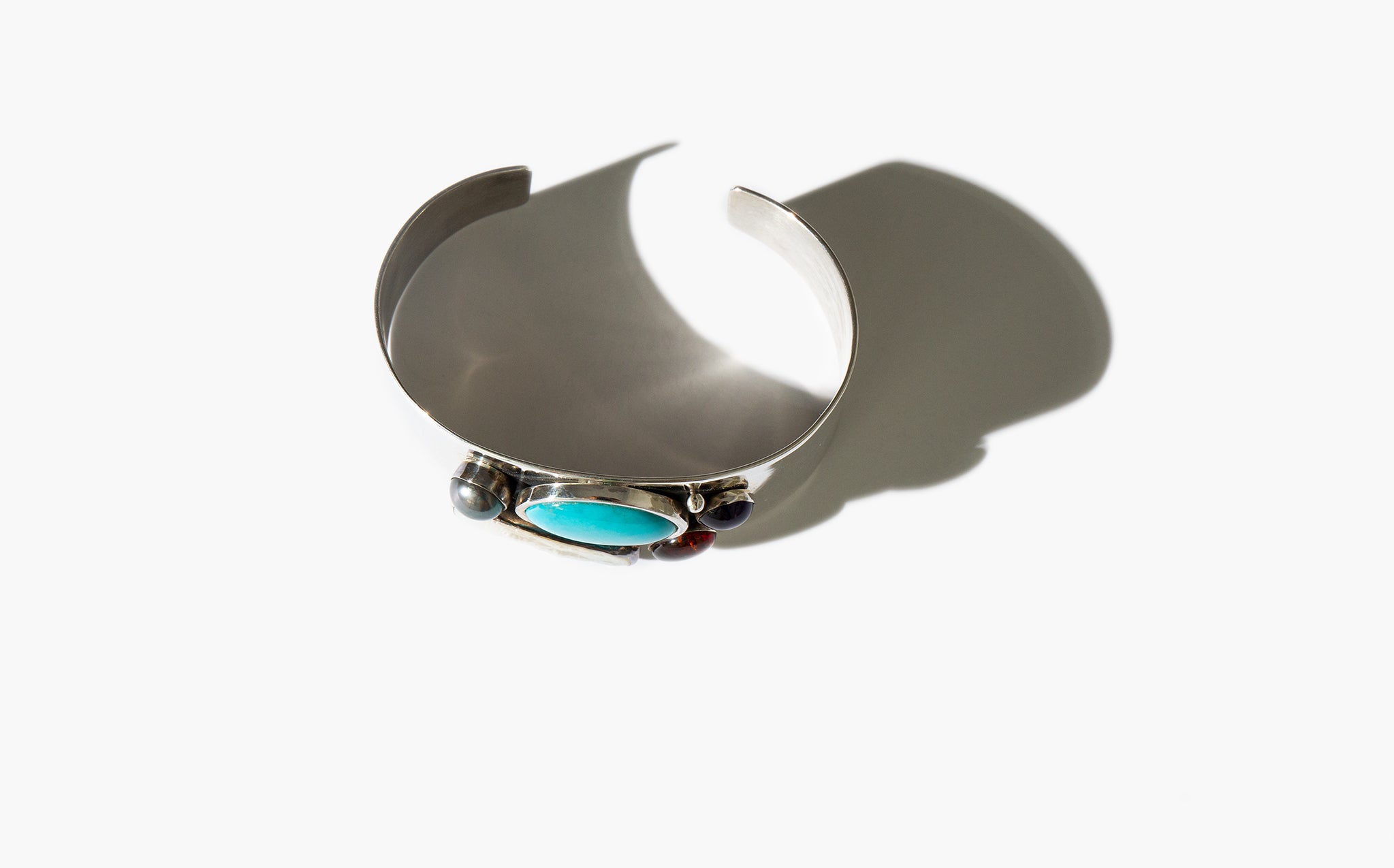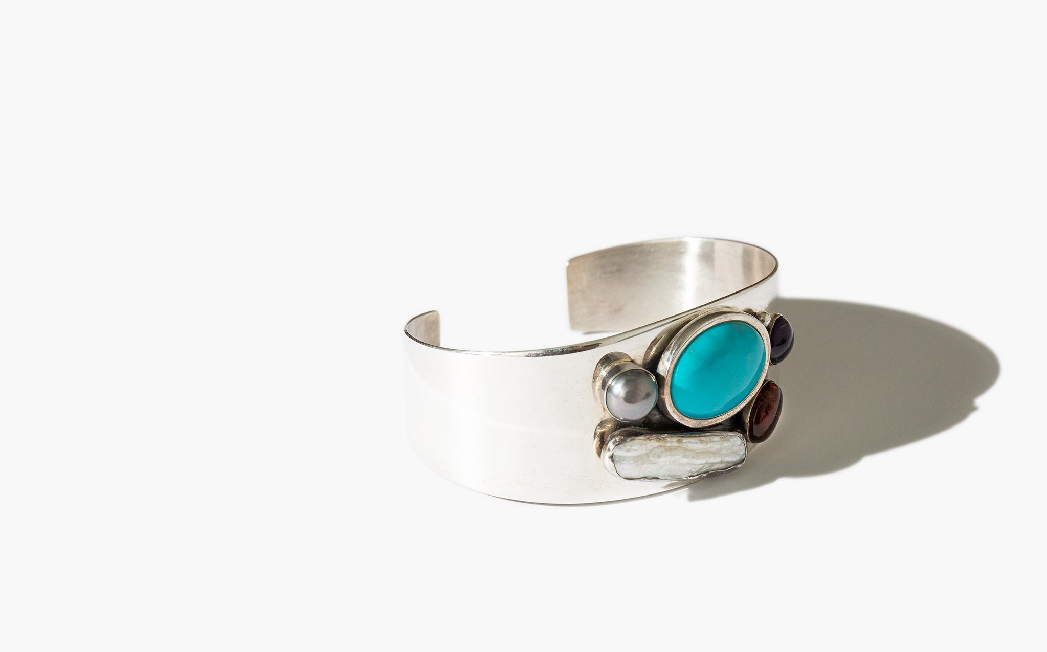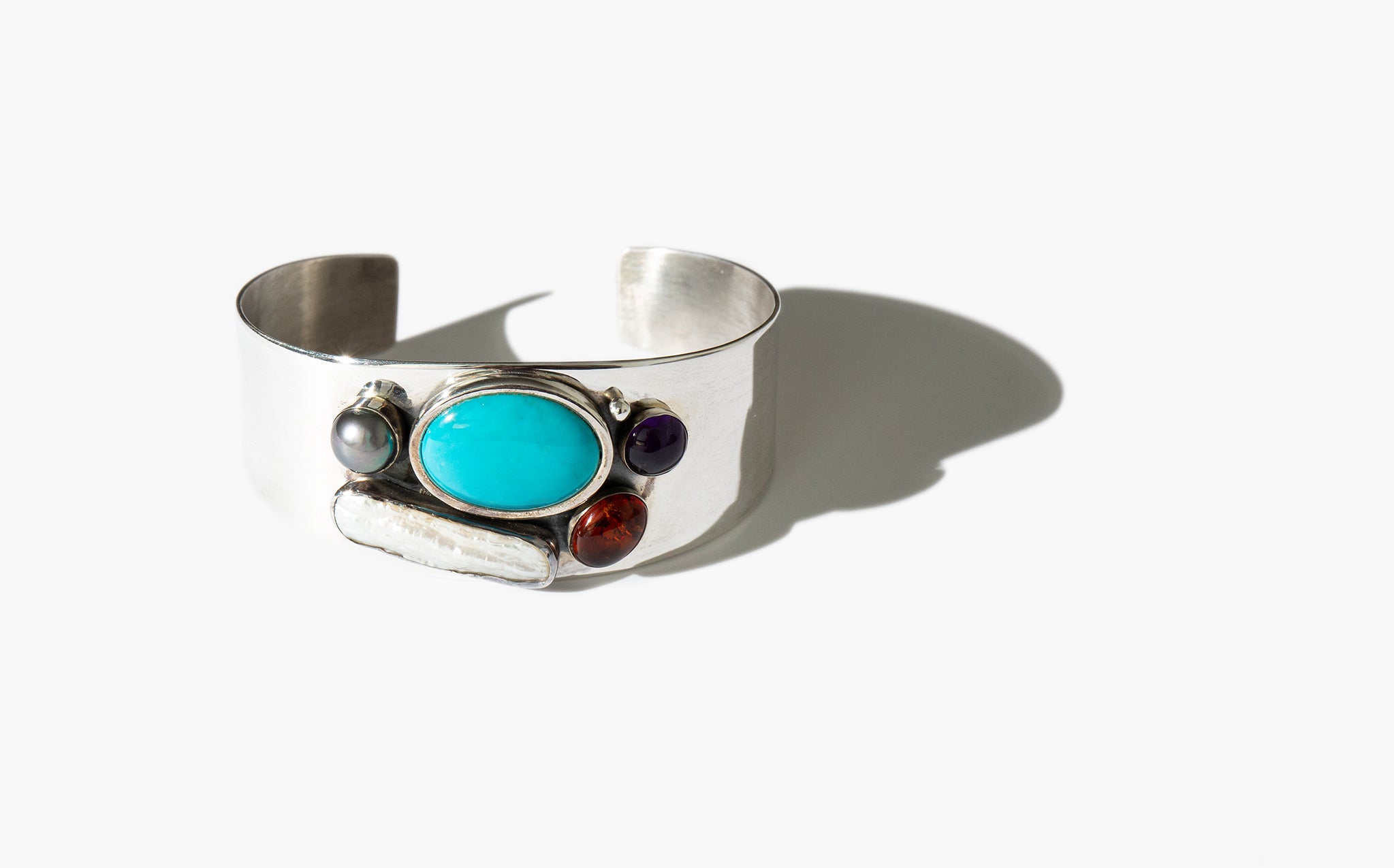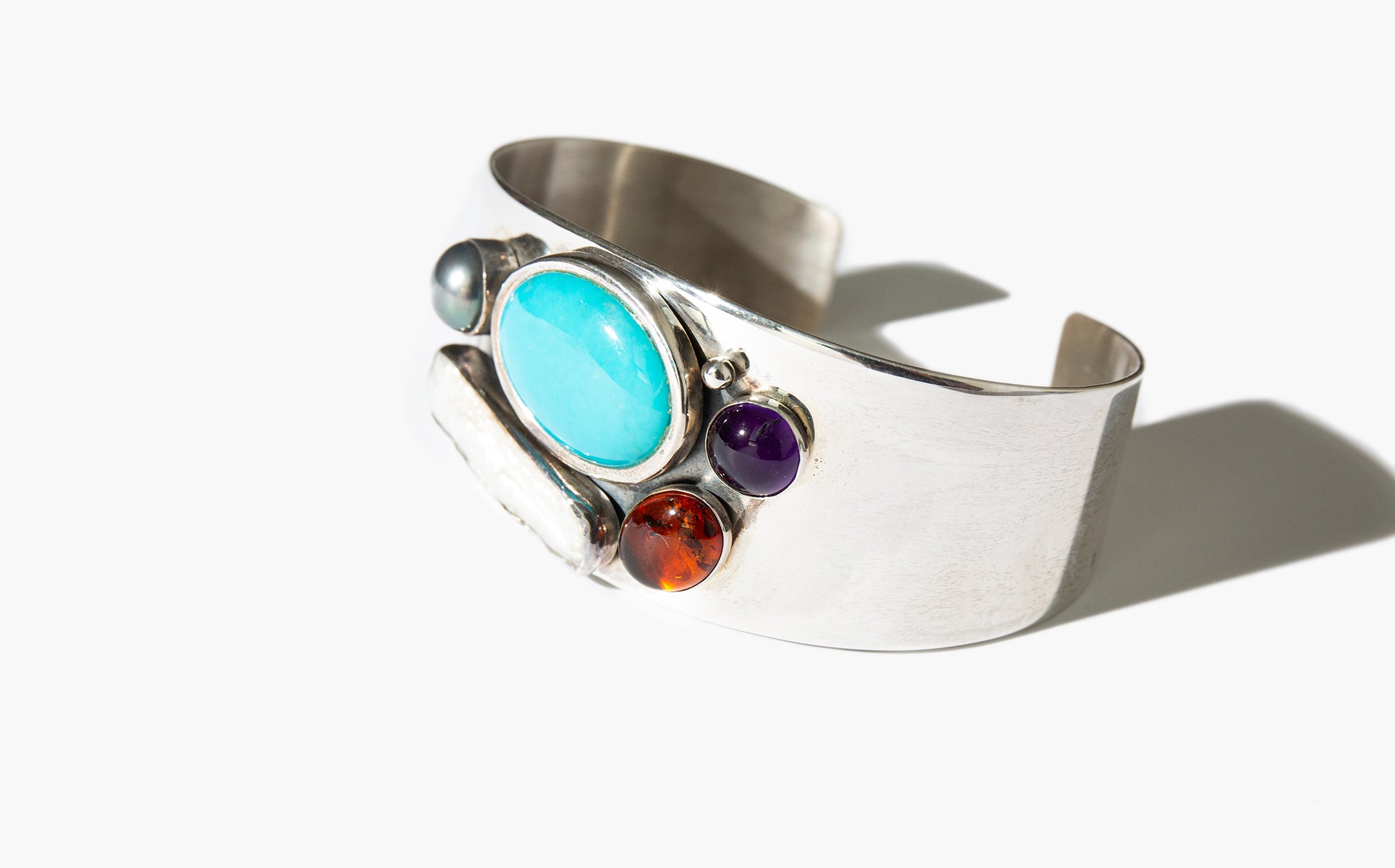Simple, colorful sterling silver cuff bracelets with accents of turquoise, pearl, amethyst, and amber.