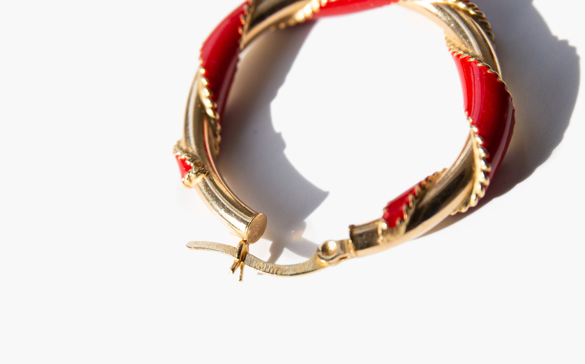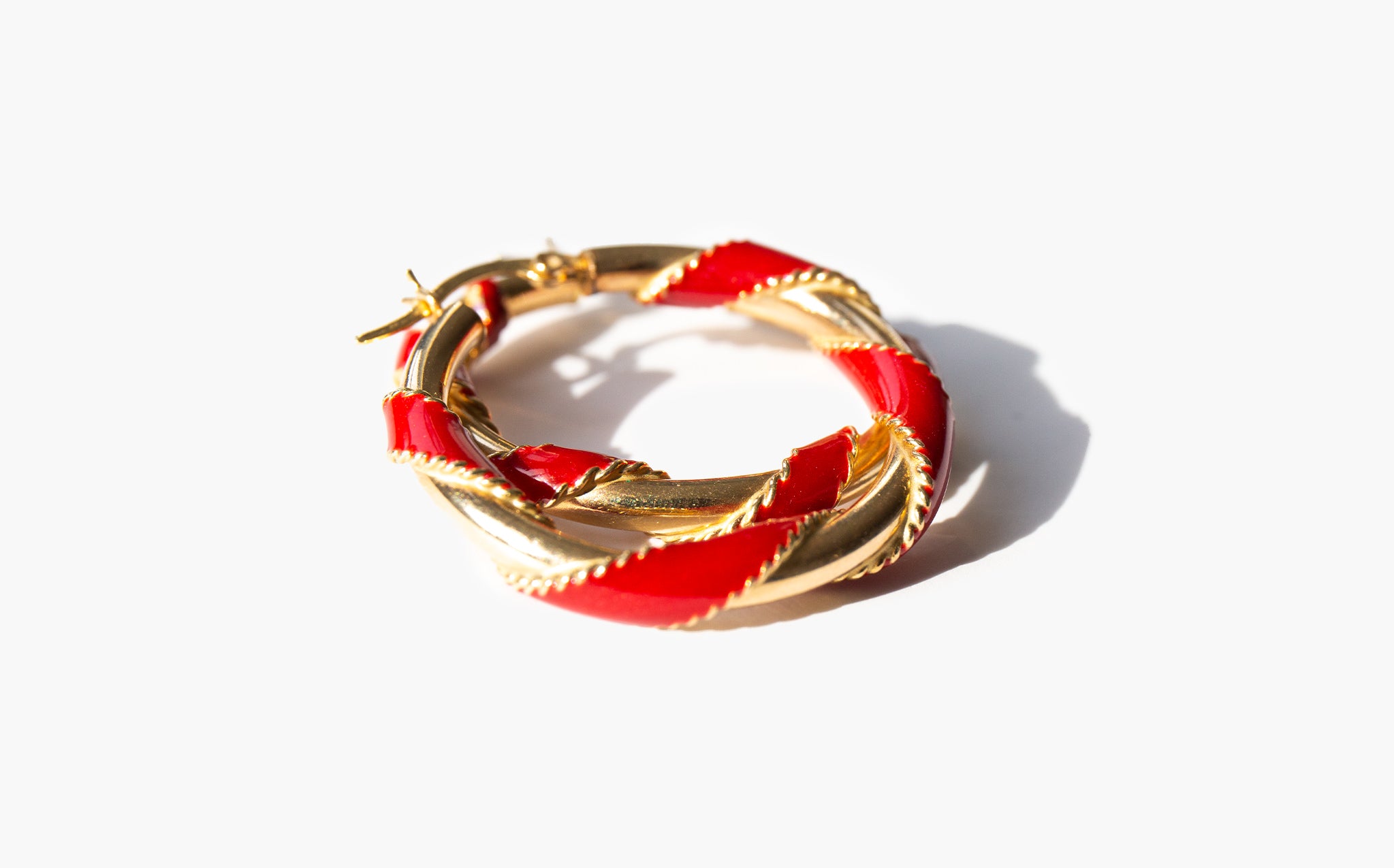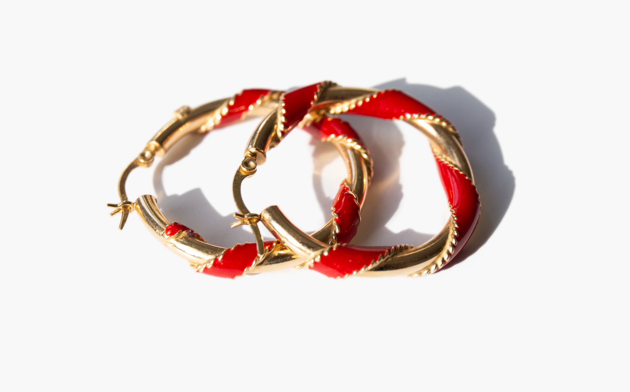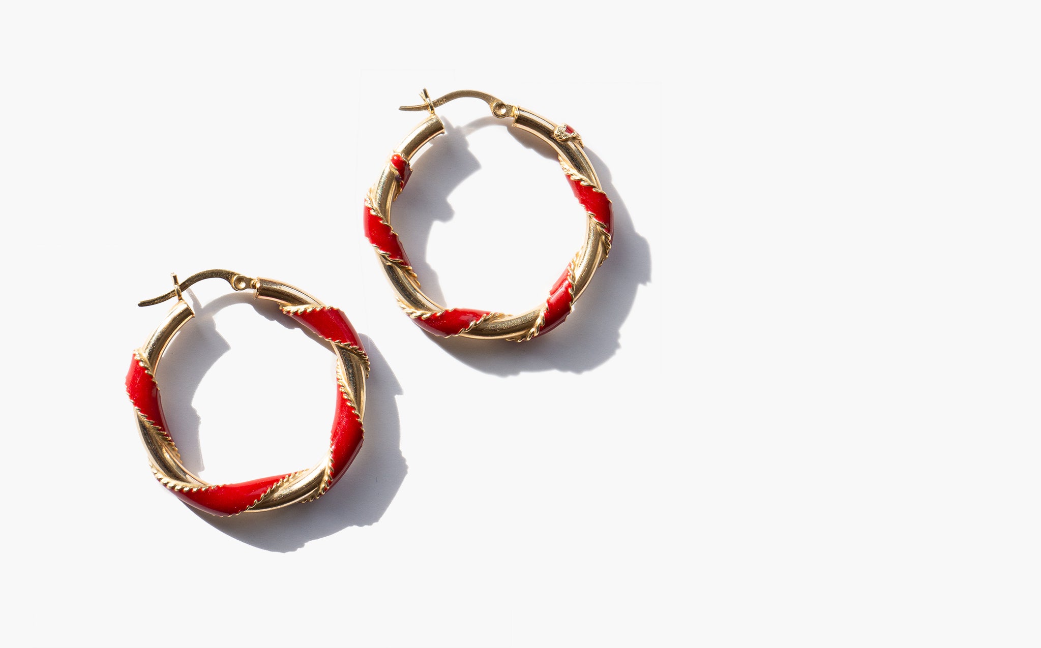 Charming twisted 14k gold hoop earrings with pop red enamel.