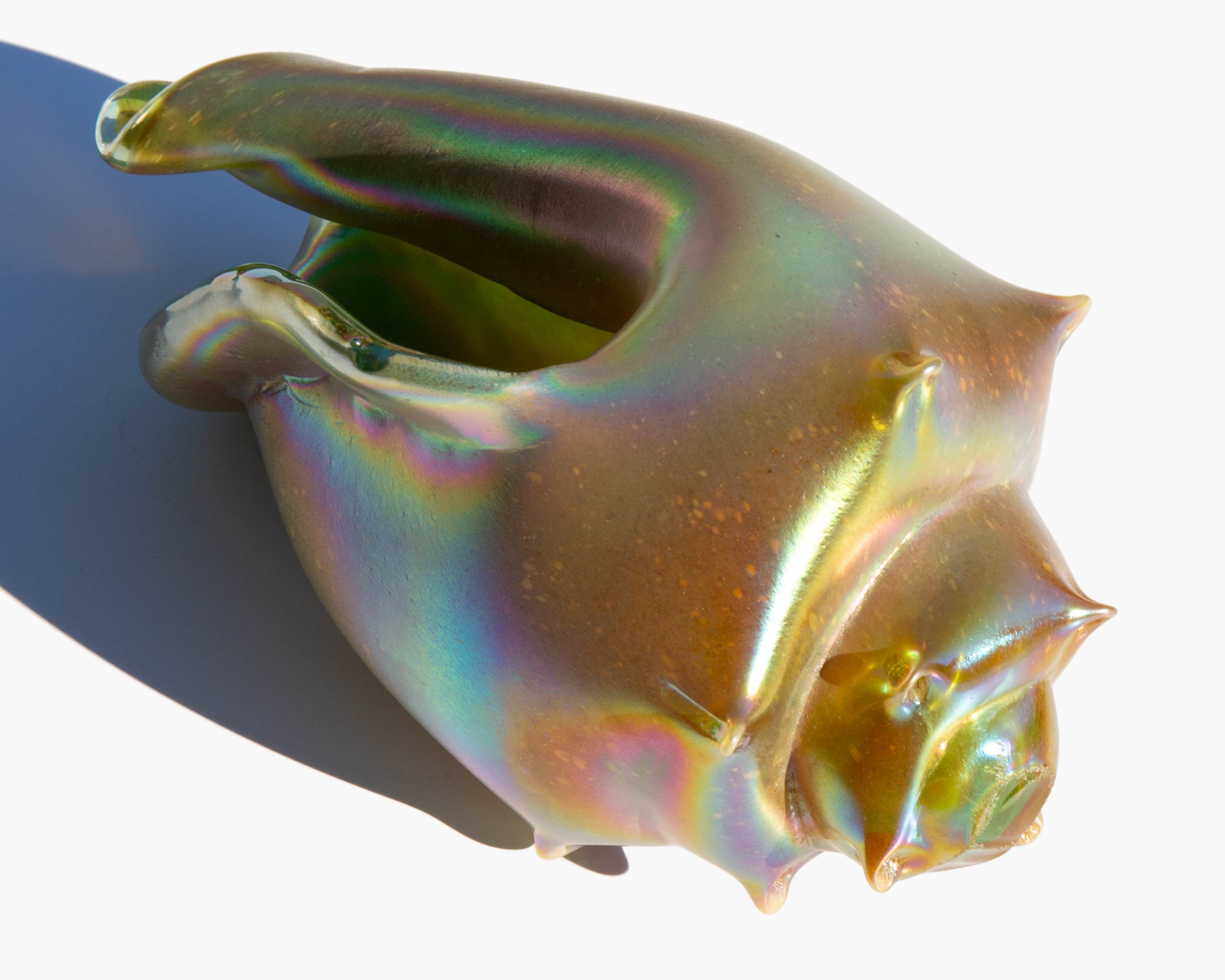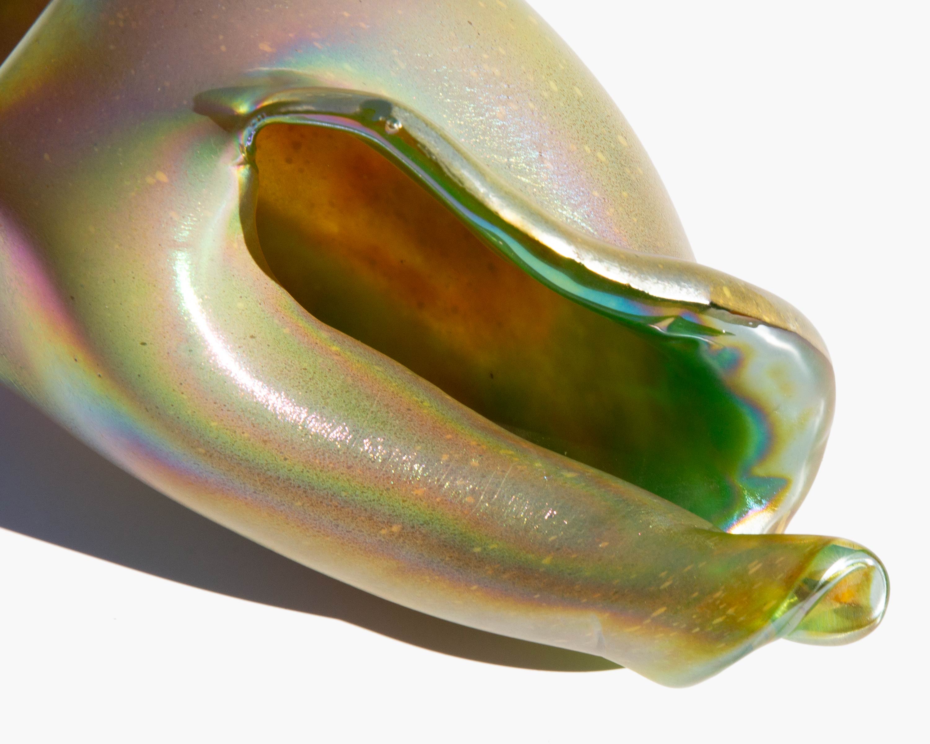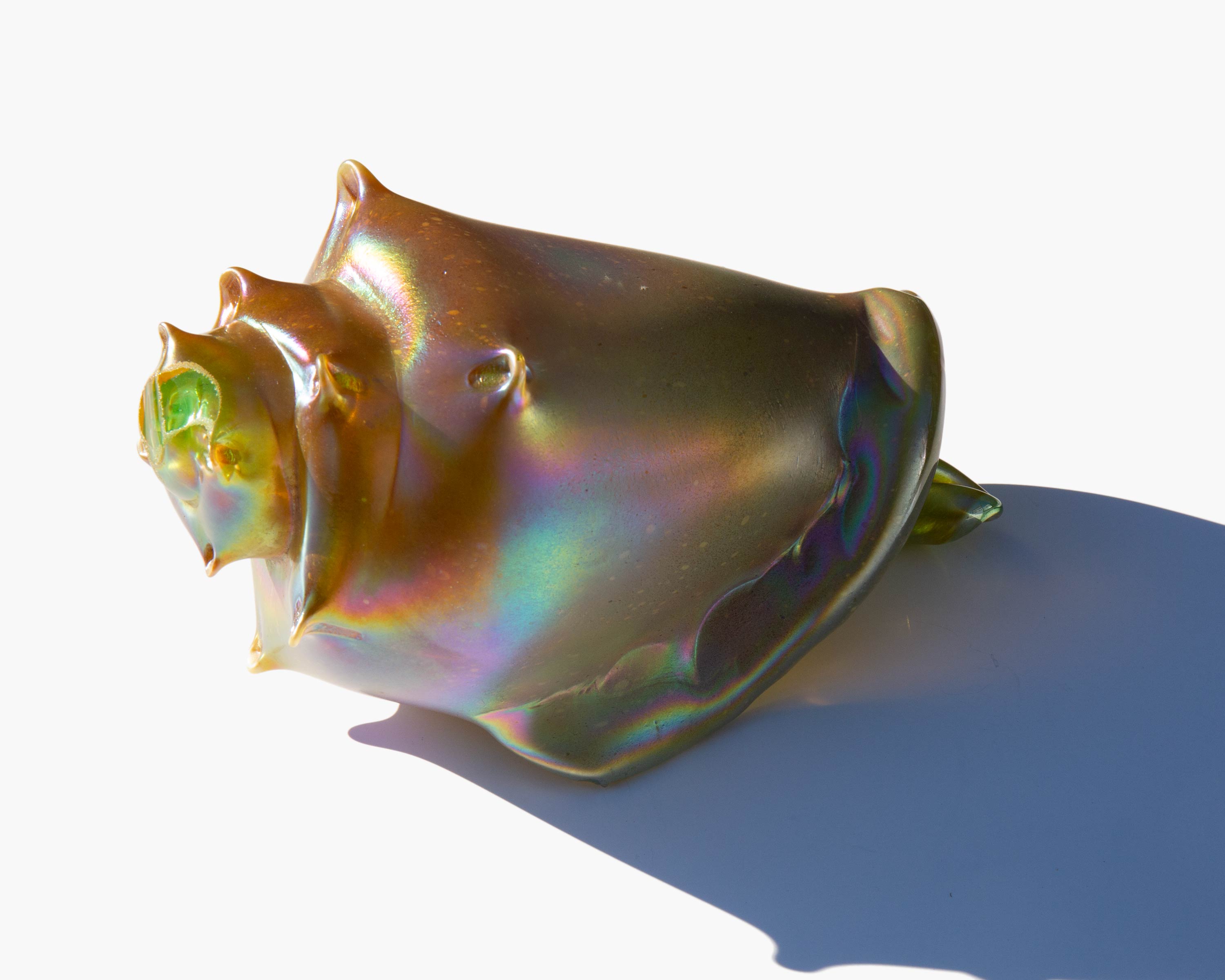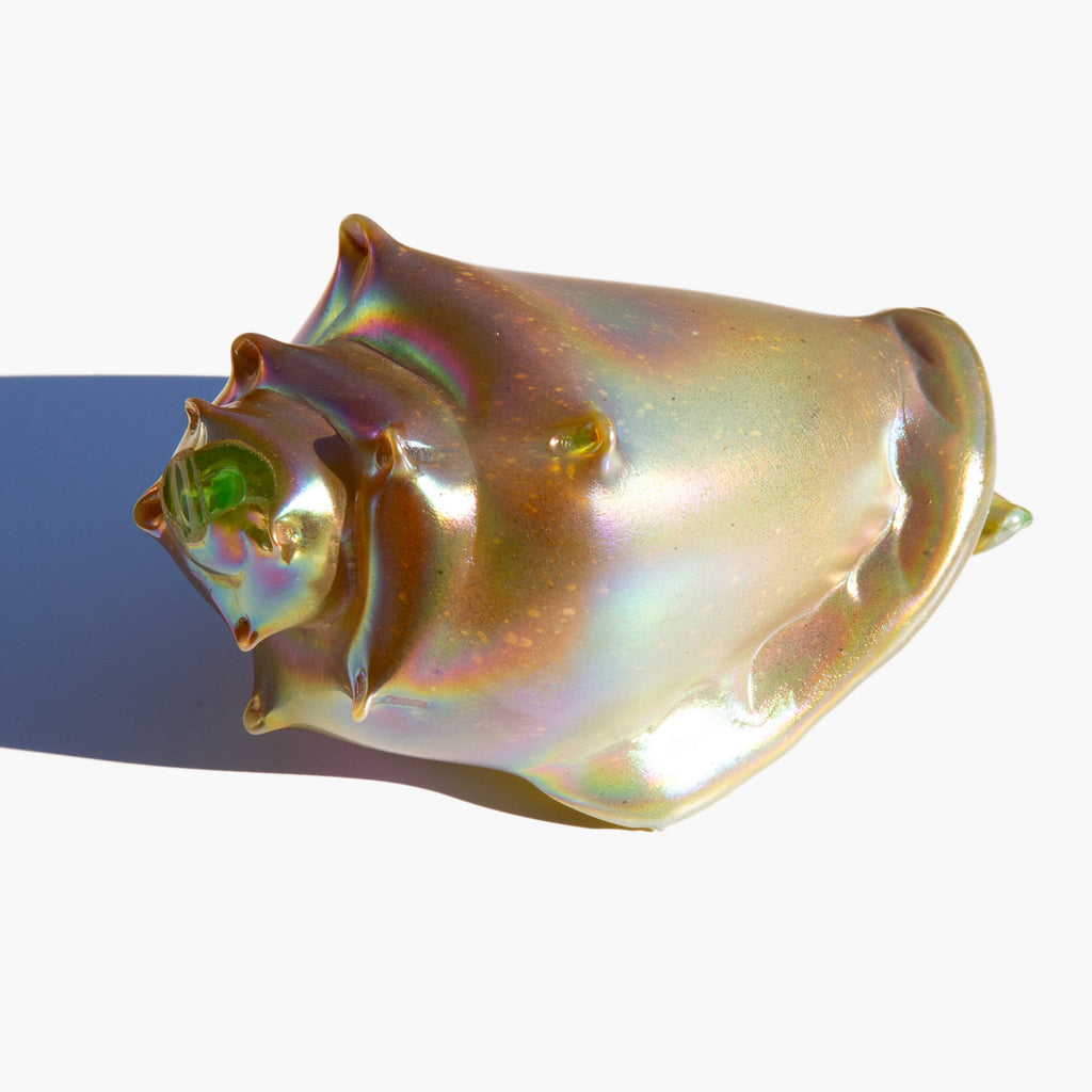 Brilliantly iridescent art glass conch shell. The mystical meaning of the conch comes from the legend that it is the weapon of choice for mermaids and mermen and, as such, alludes to strength and fortitude.
