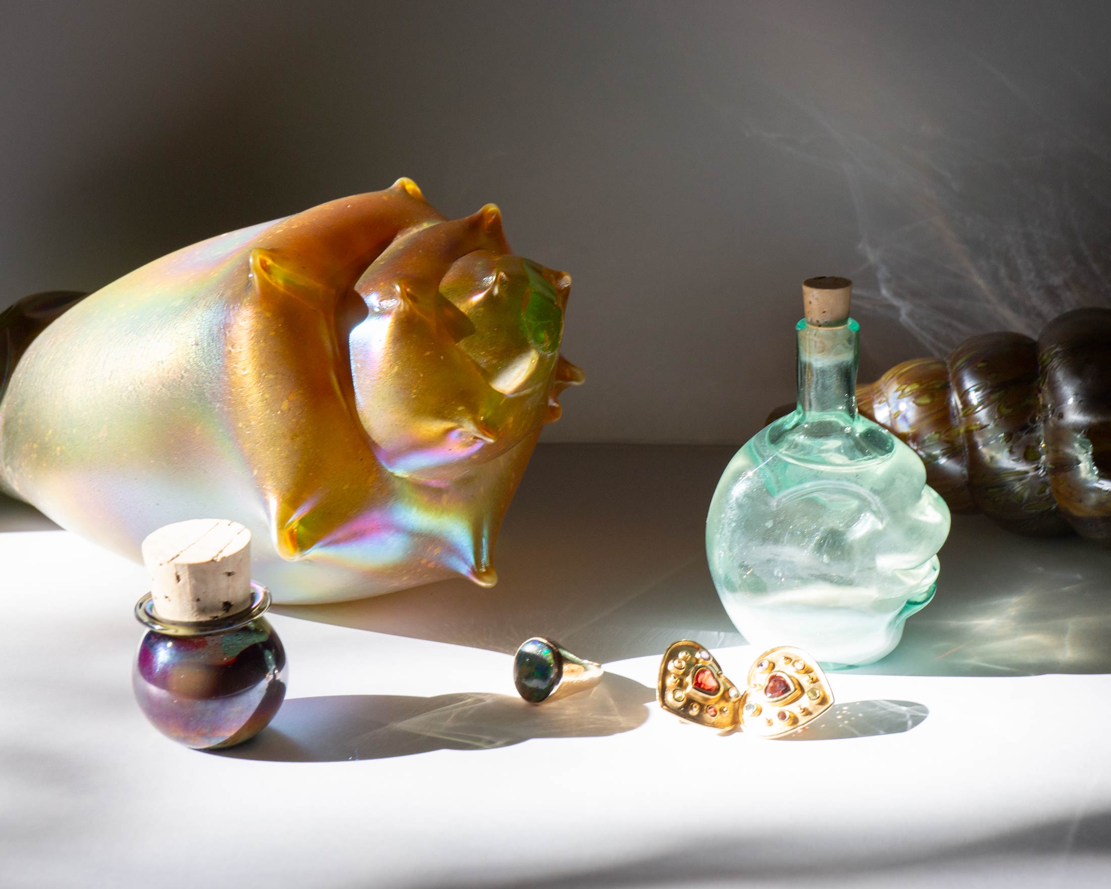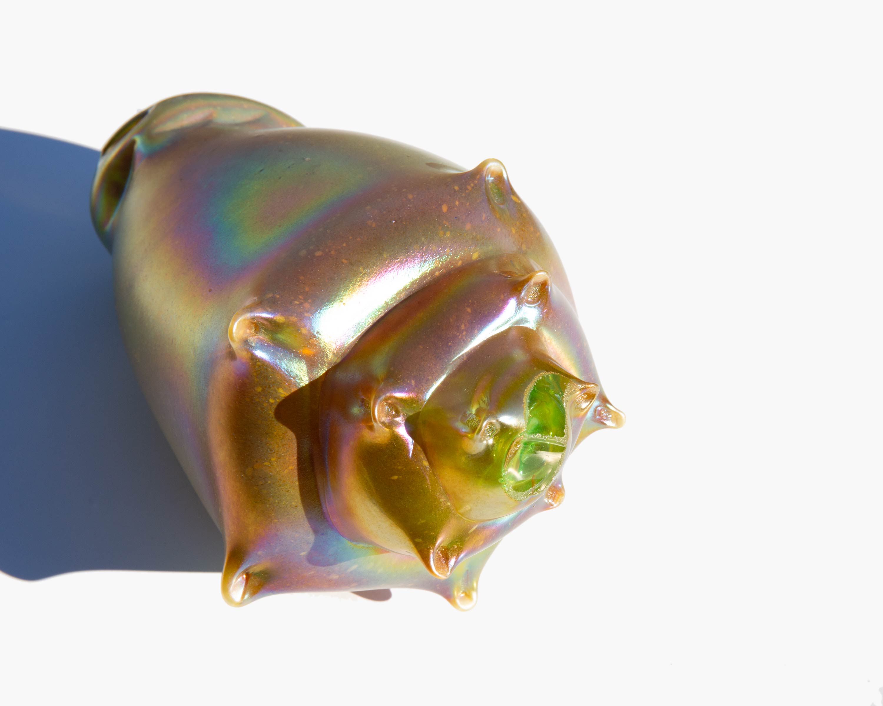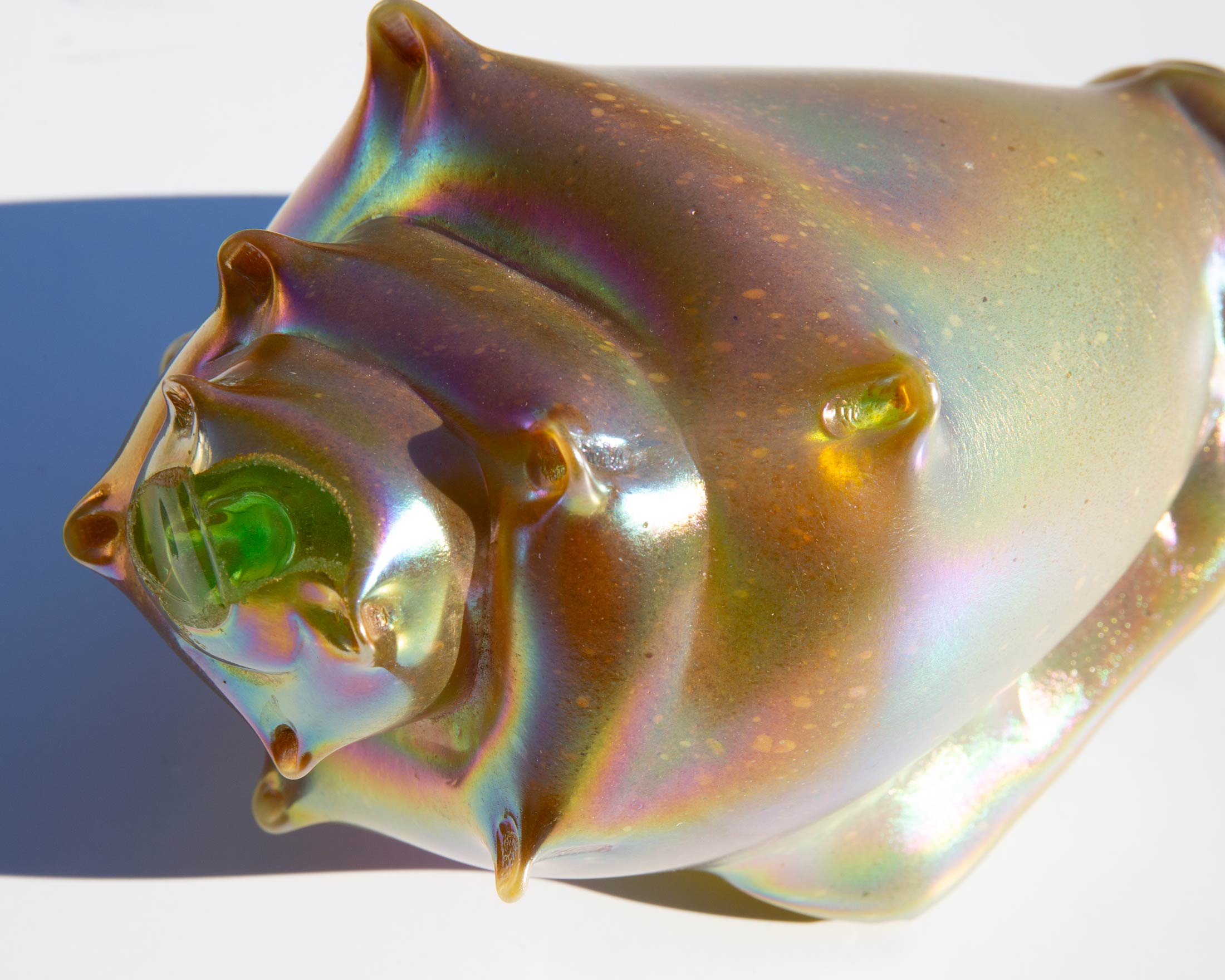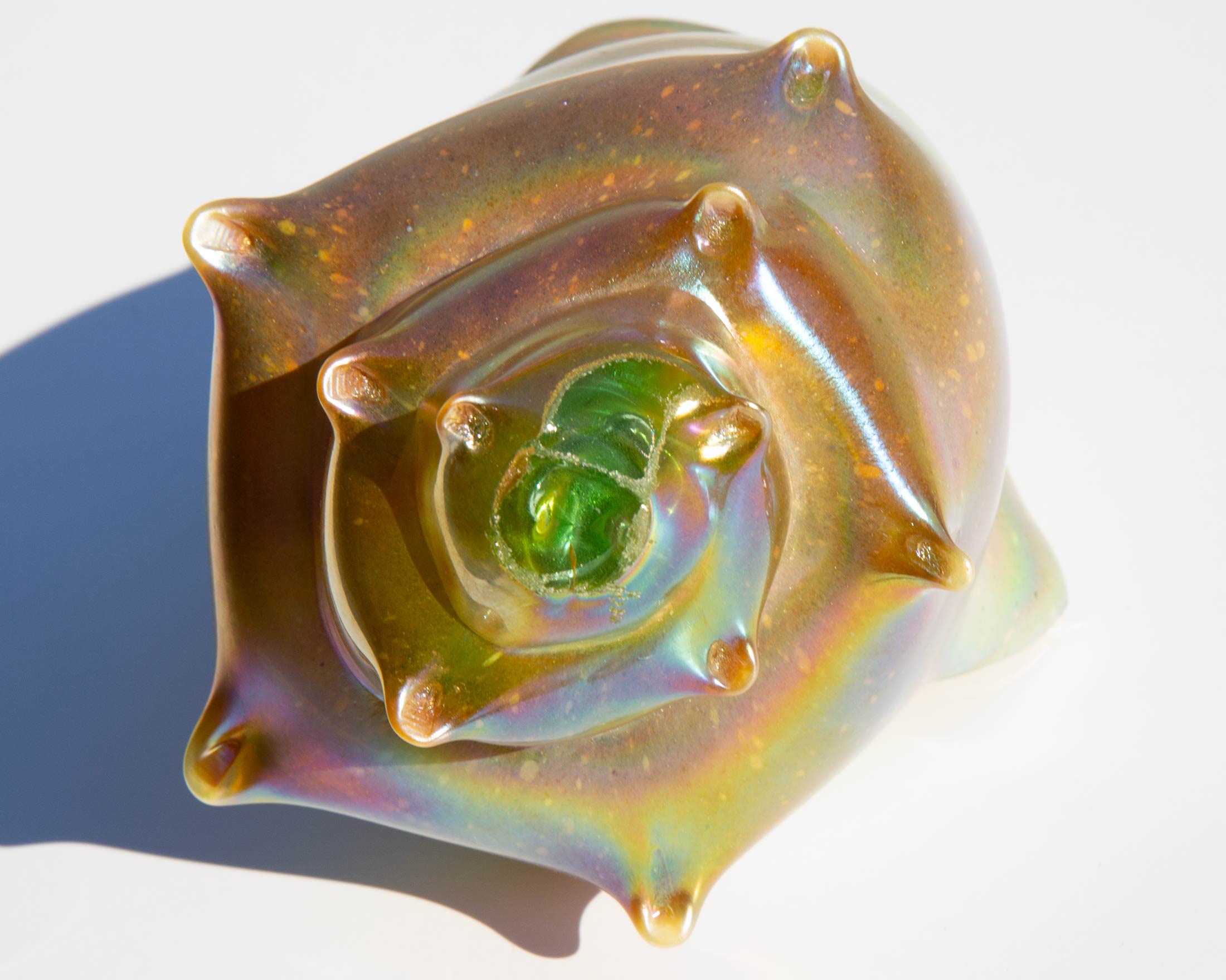 Brilliantly iridescent art glass conch shell. The mystical meaning of the conch comes from the legend that it is the weapon of choice for mermaids and mermen and, as such, alludes to strength and fortitude.