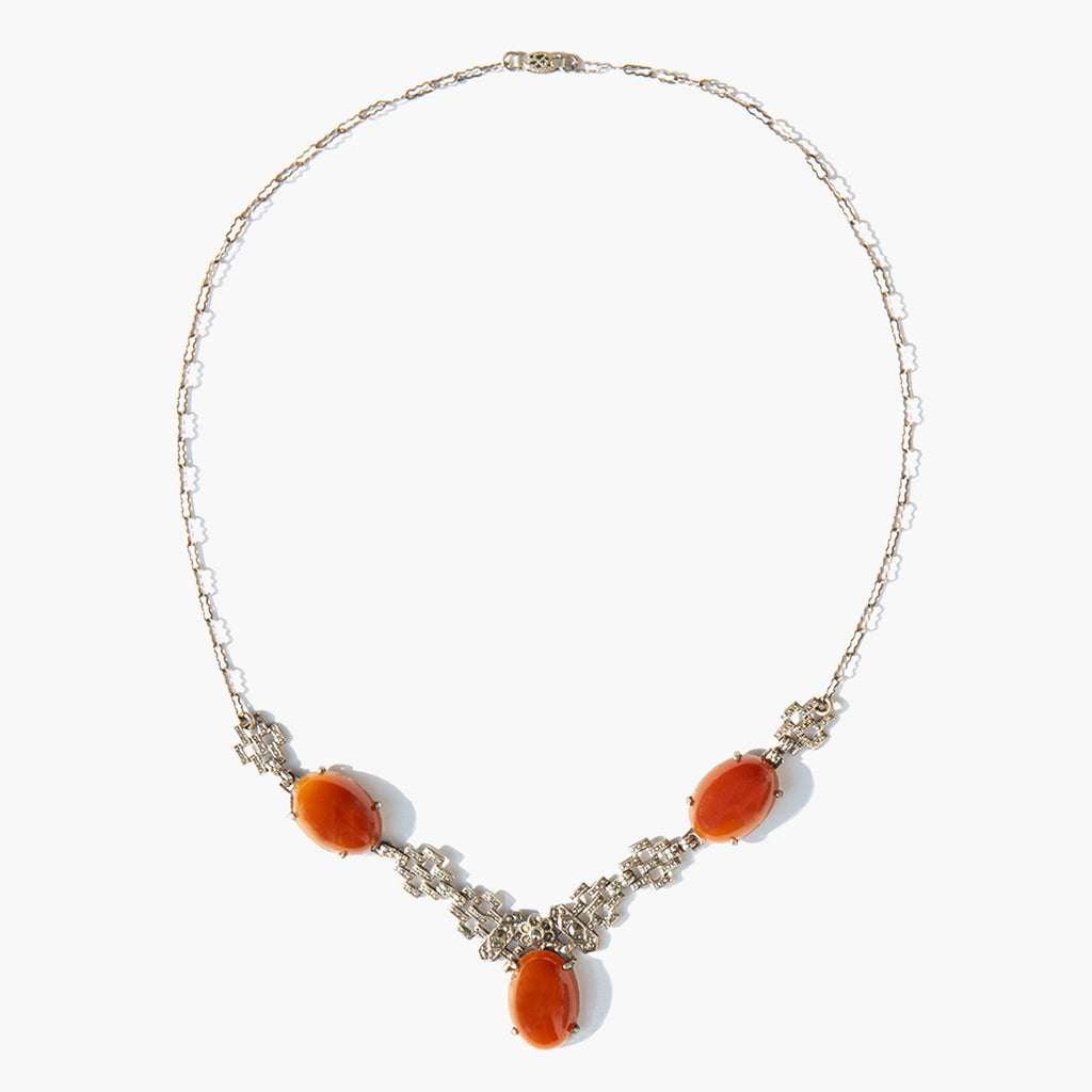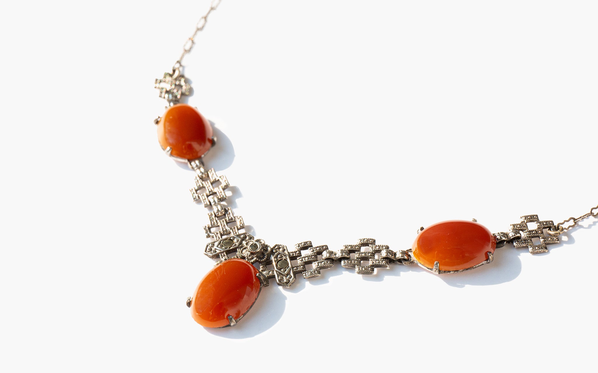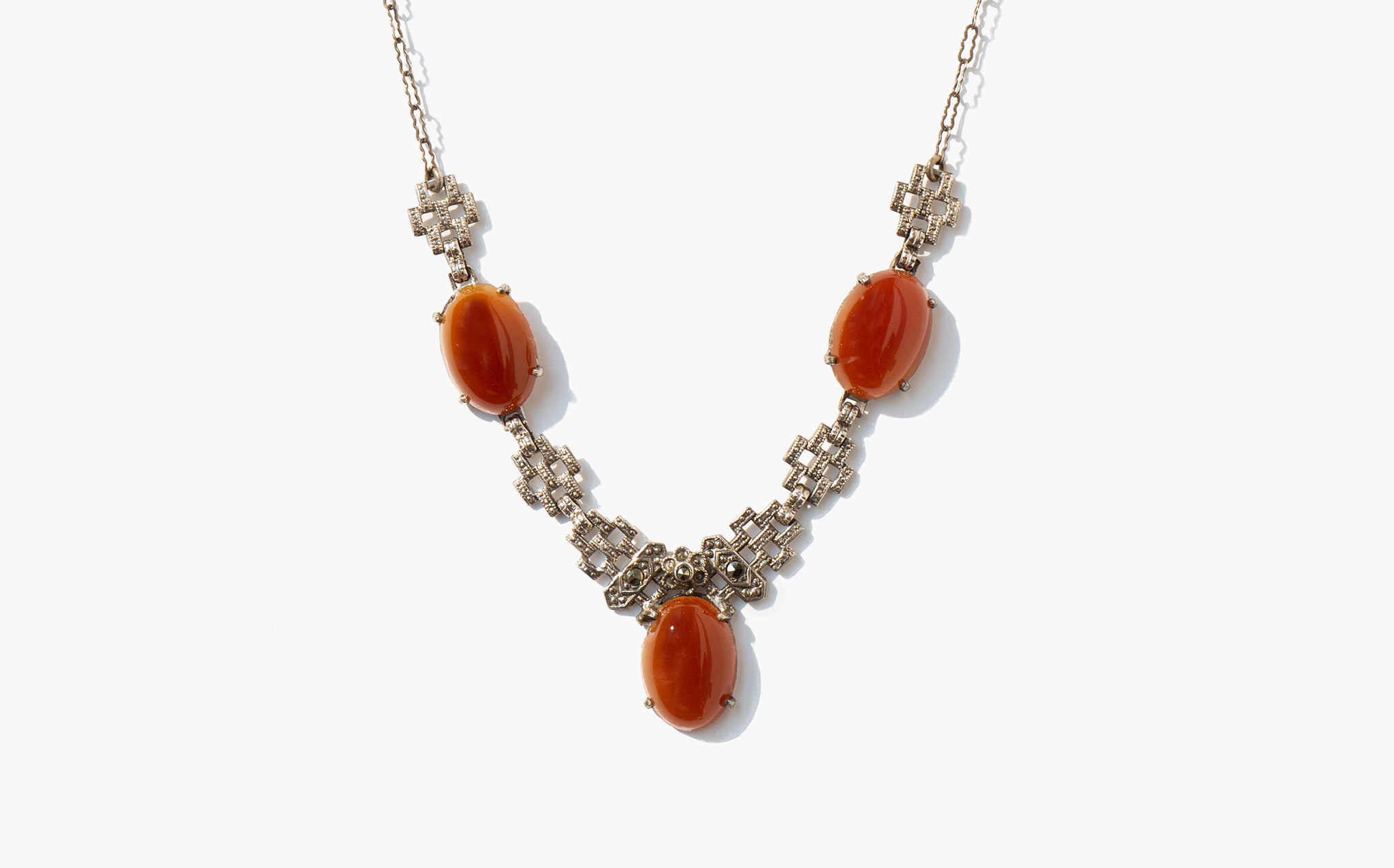 Intricate sterling silver necklace with marcasite accents and lovely carnelian cabochons. The name of this lustrous, red-orange stone comes from the Latin word meaning “flesh.” Associated with energy, warmth, joy and stimulation, it has been used for thousands of years as an adornment acclaimed for its invigorating properties. With its sensual hues and glistening surfaces, carnelian is also believed to intensify love, passion, and desire.