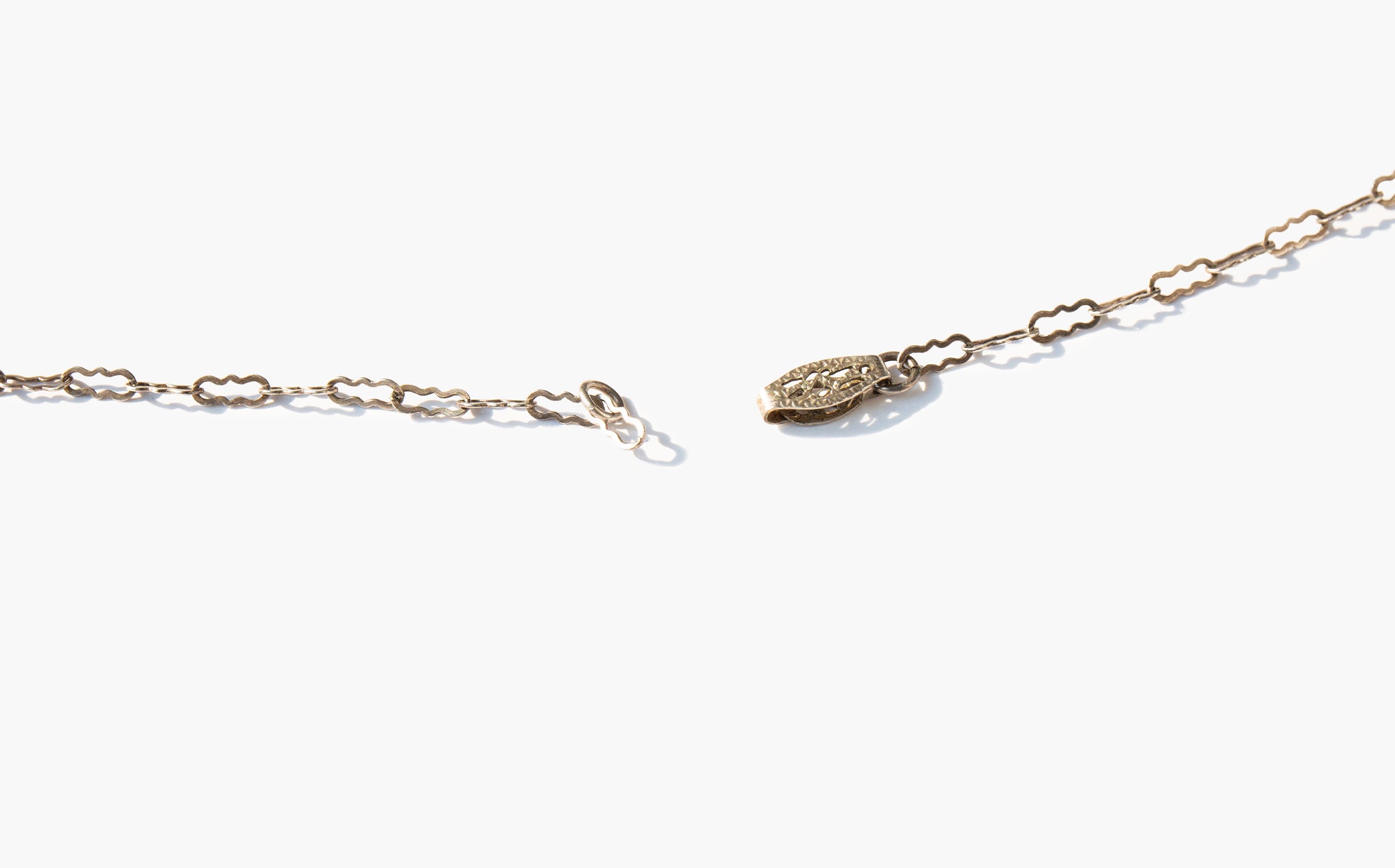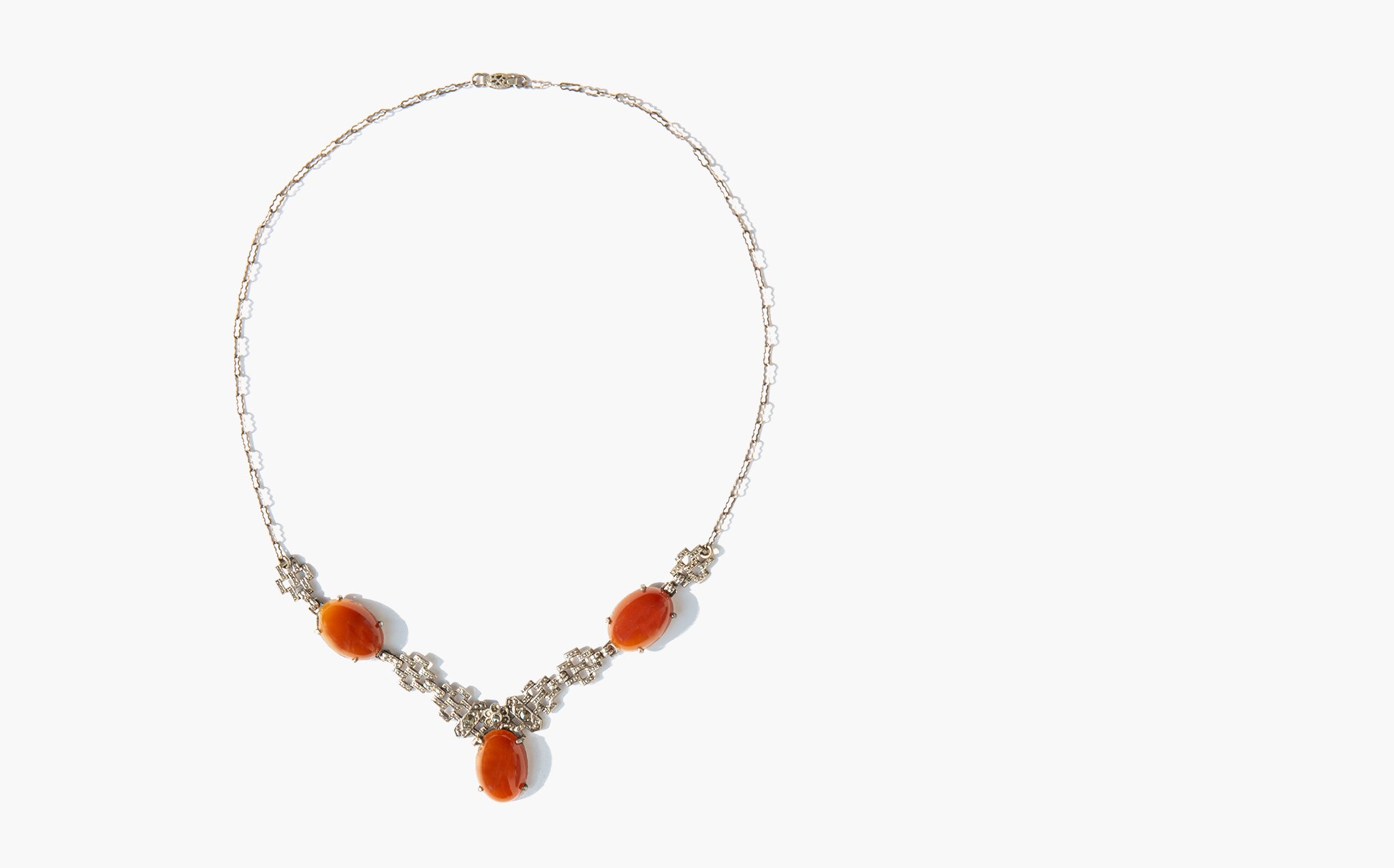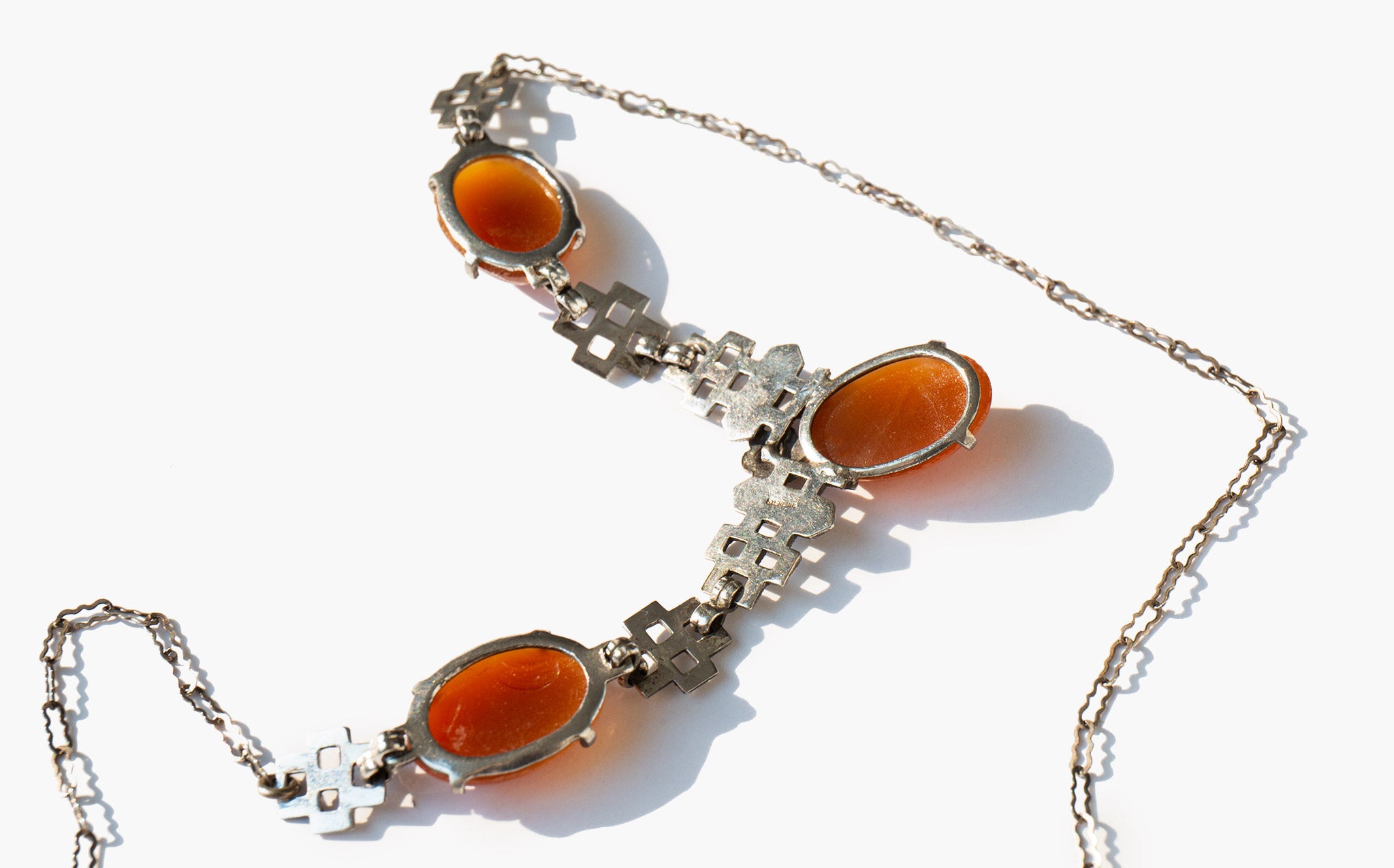 Intricate sterling silver necklace with marcasite accents and lovely carnelian cabochons. The name of this lustrous, red-orange stone comes from the Latin word meaning “flesh.” Associated with energy, warmth, joy and stimulation, it has been used for thousands of years as an adornment acclaimed for its invigorating properties. With its sensual hues and glistening surfaces, carnelian is also believed to intensify love, passion, and desire.