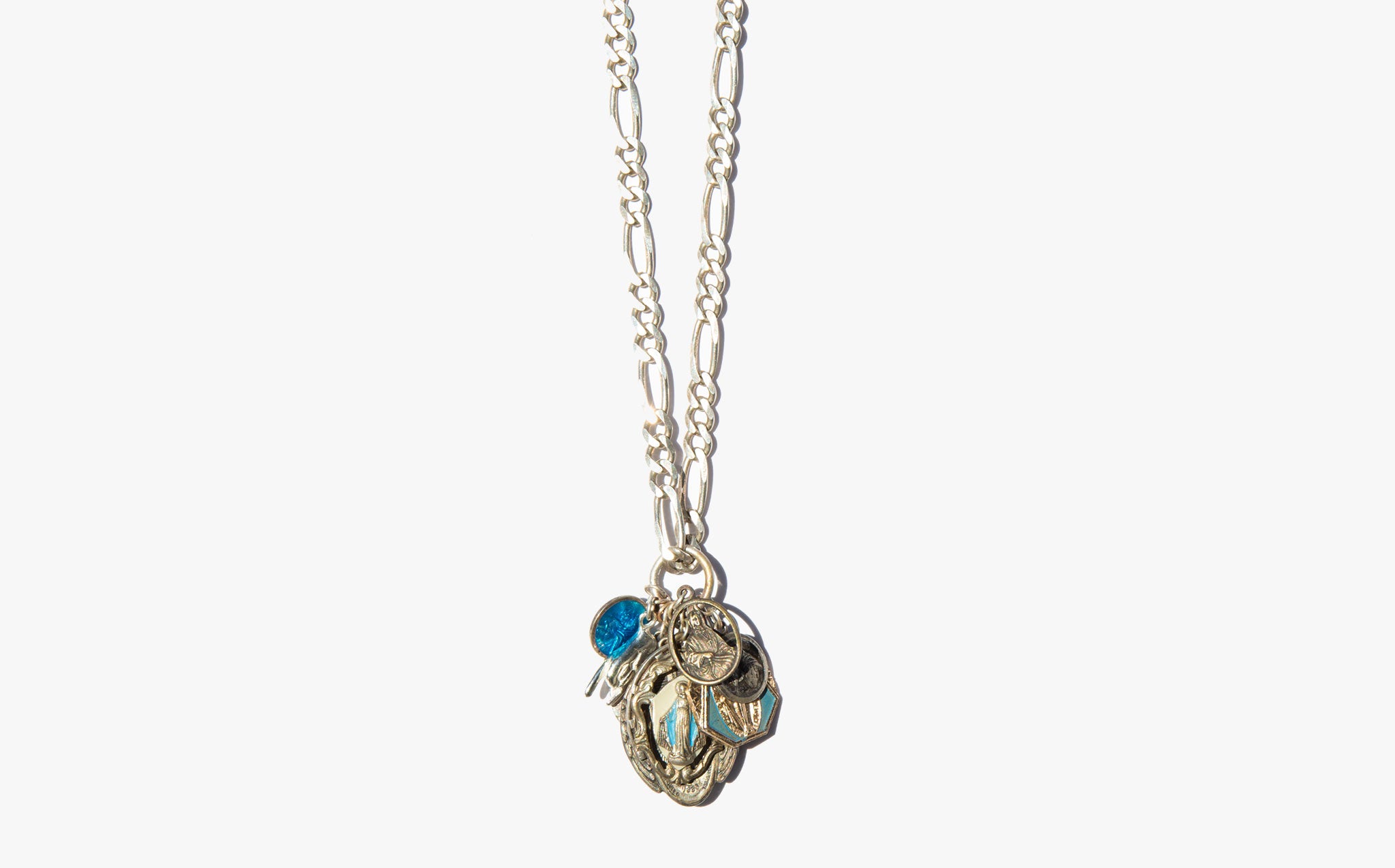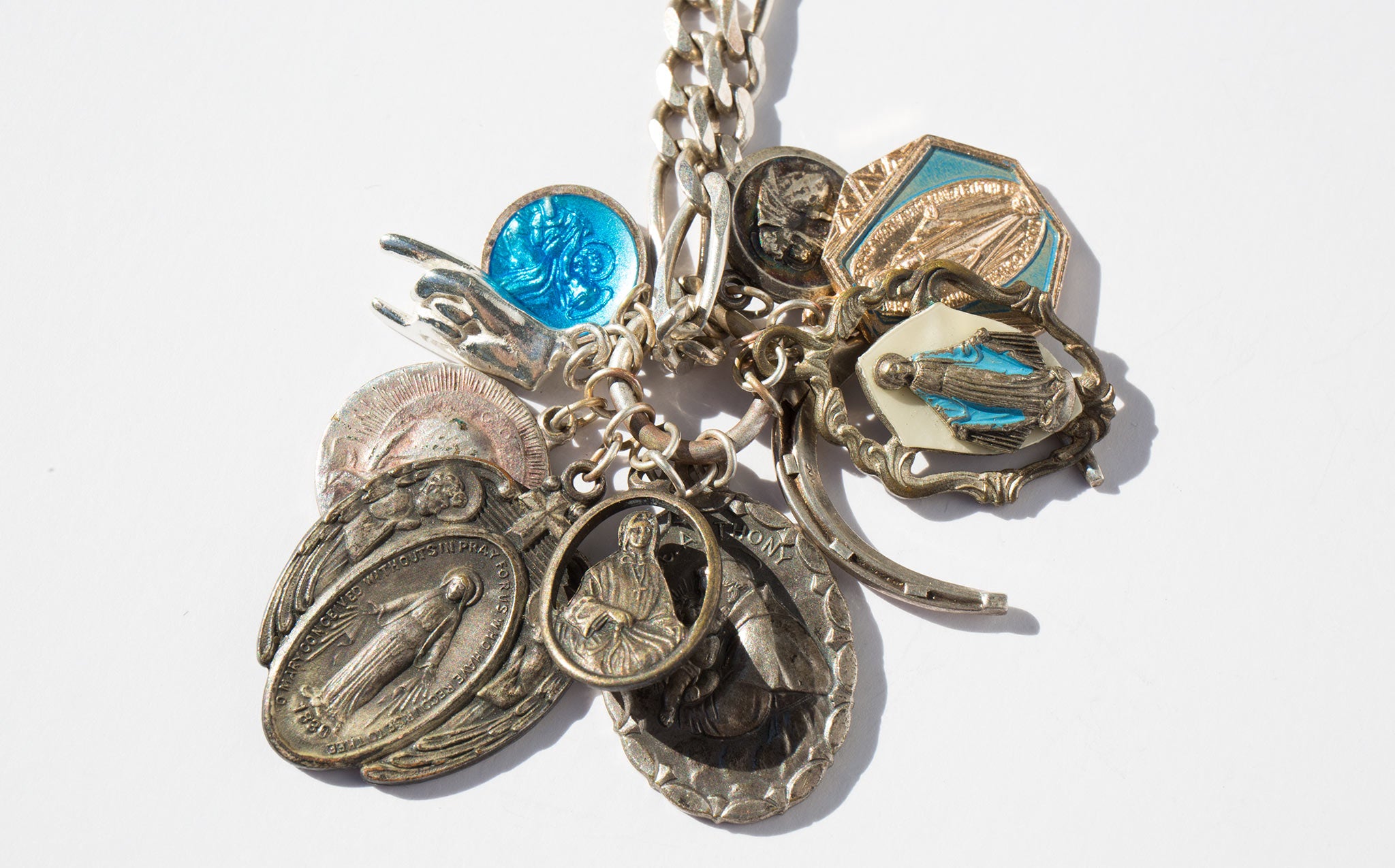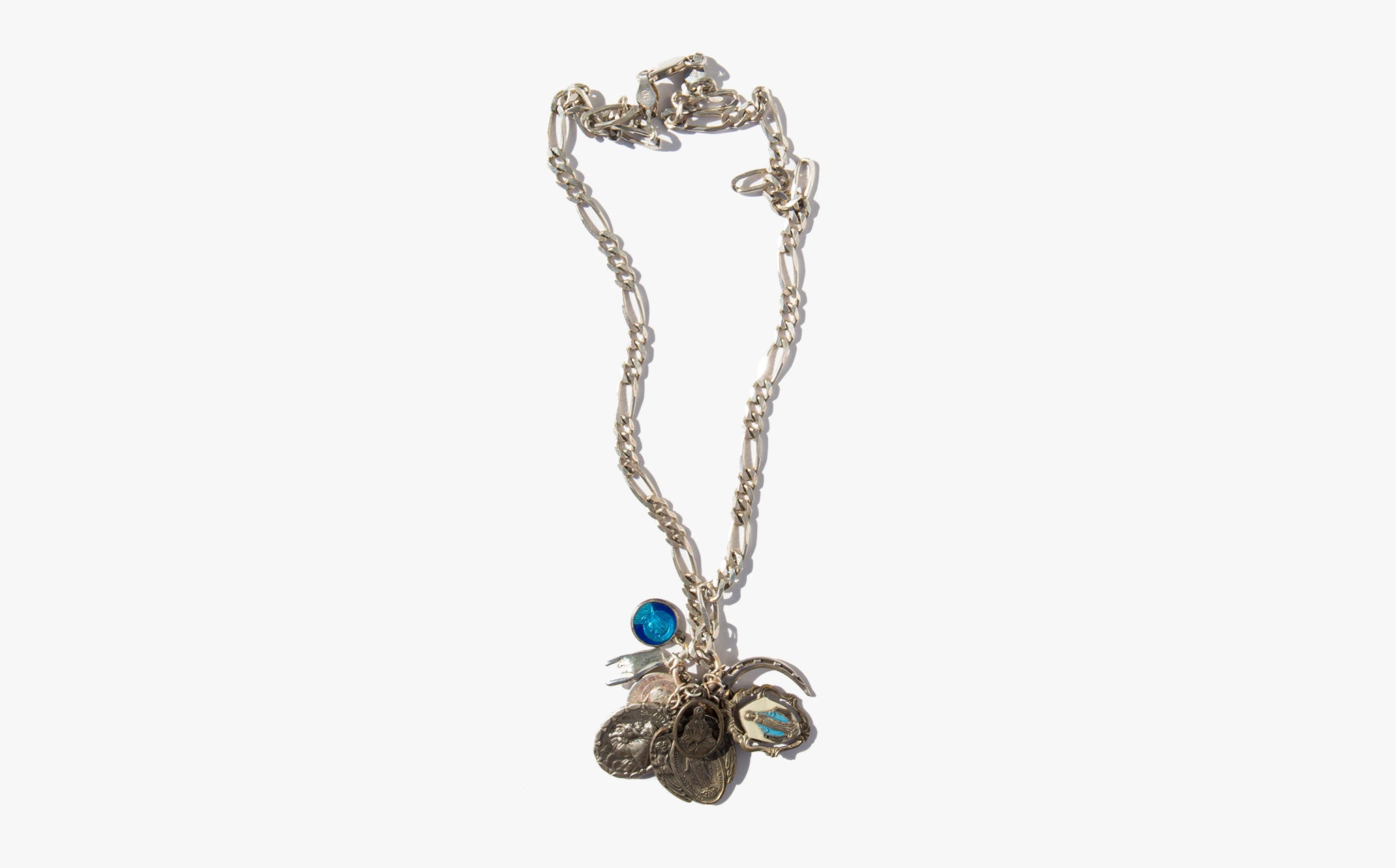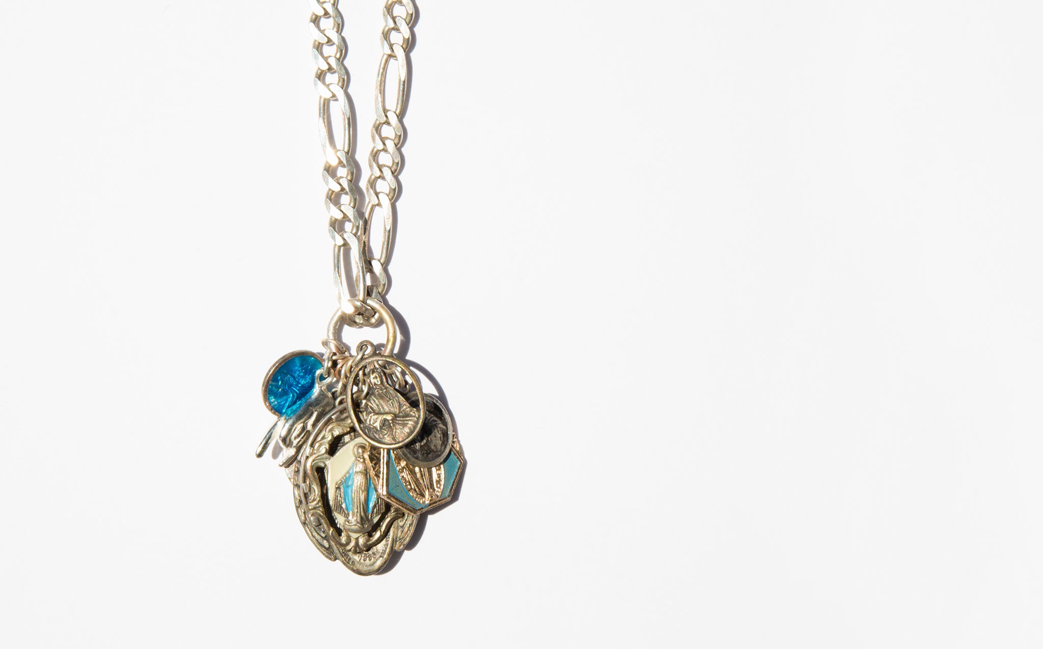 A favorite piece of the season – sterling silver link chain with a cluster of antique and vintage religious charms and relics of protection, an old silver horseshoe for luck, and a silver corna charm, a hand gesture given to ward off bad luck and the evil eye.