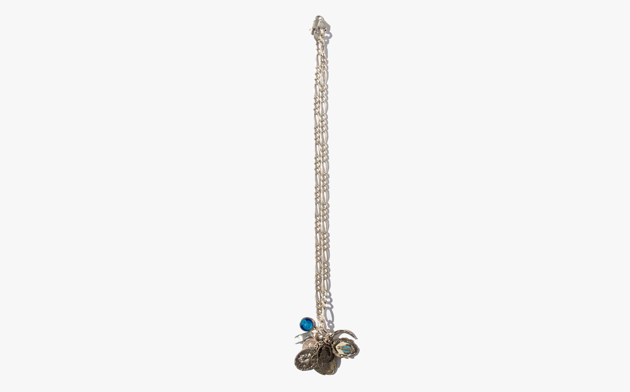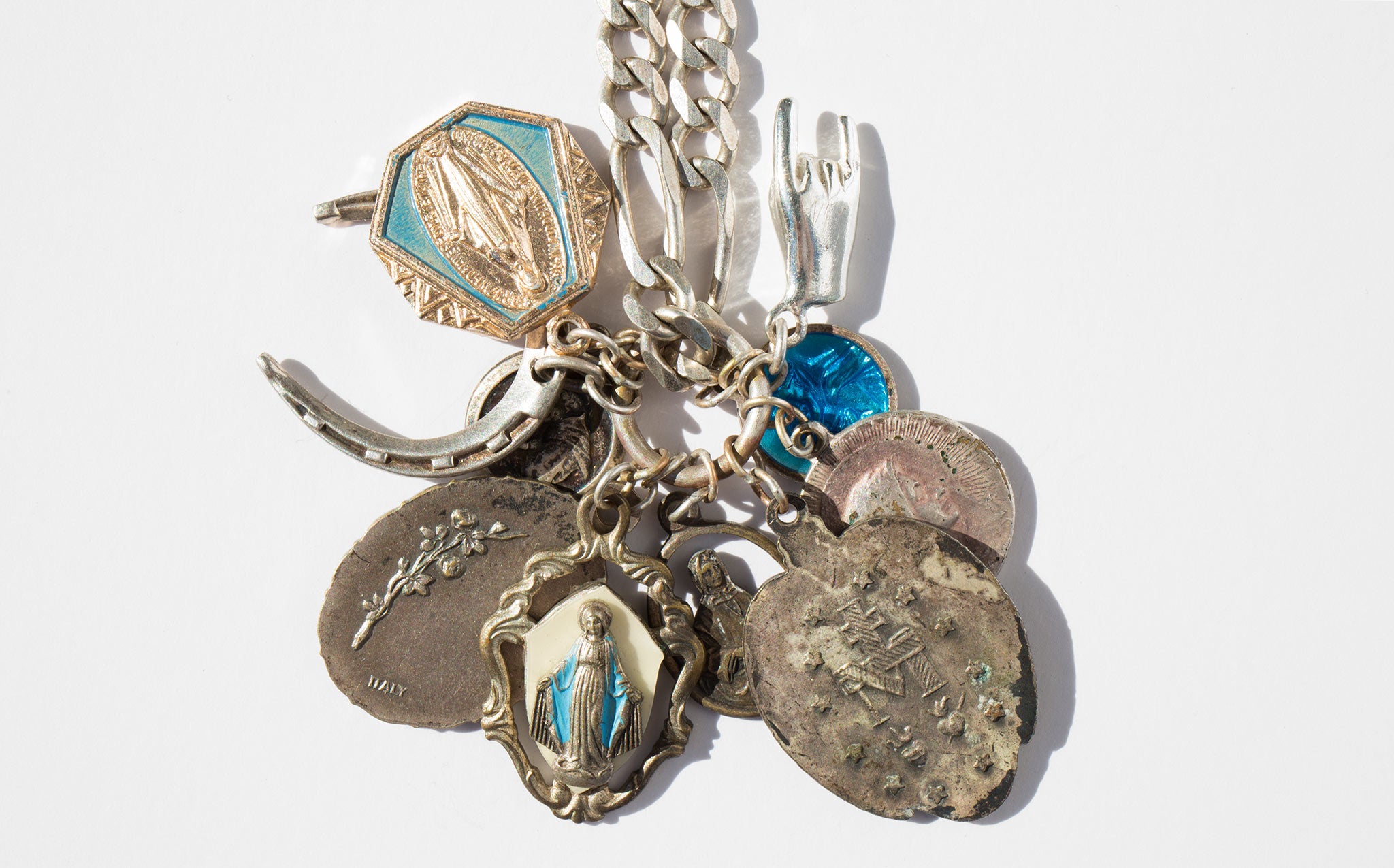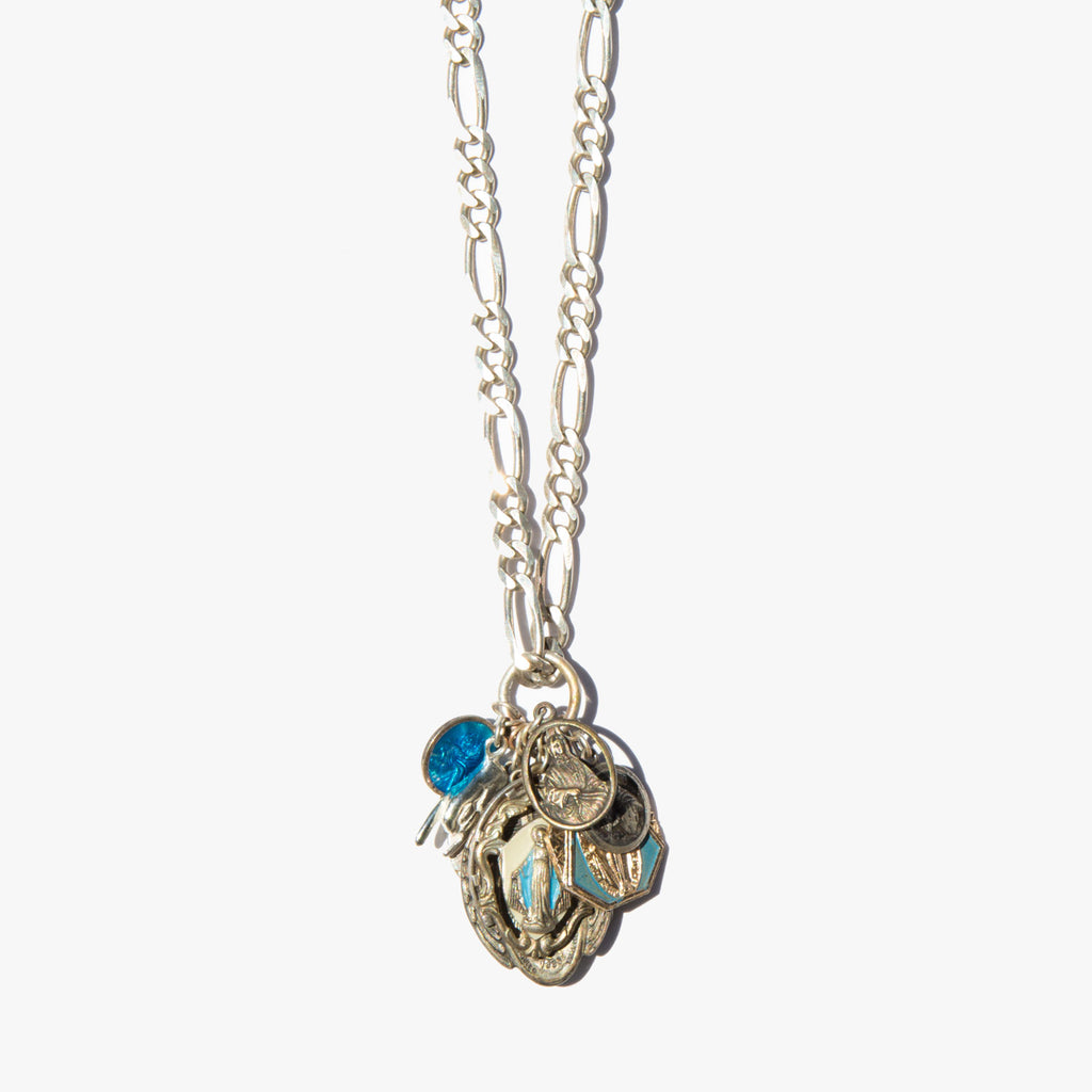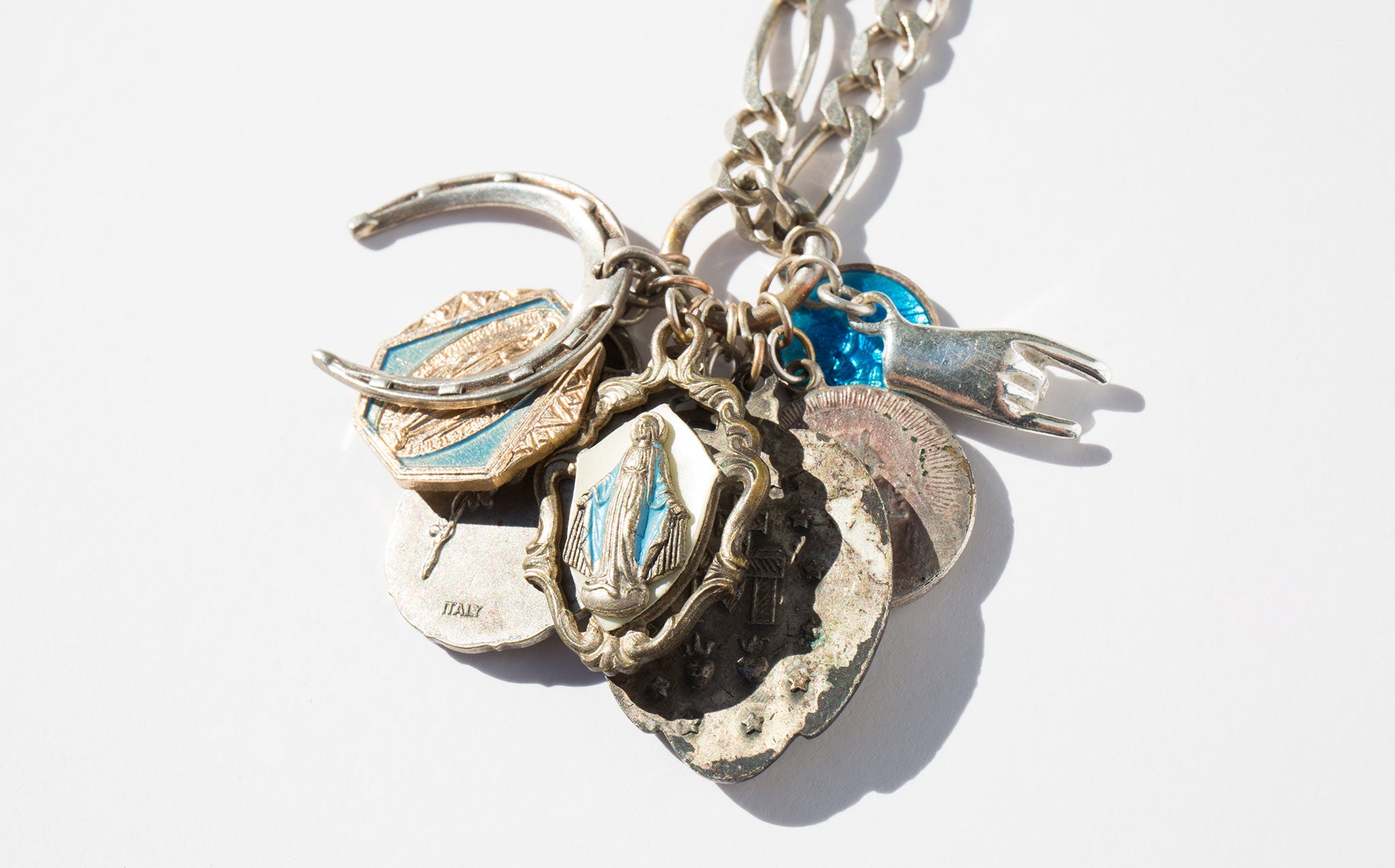 A favorite piece of the season – sterling silver link chain with a cluster of antique and vintage religious charms and relics of protection, an old silver horseshoe for luck, and a silver corna charm, a hand gesture given to ward off bad luck and the evil eye.