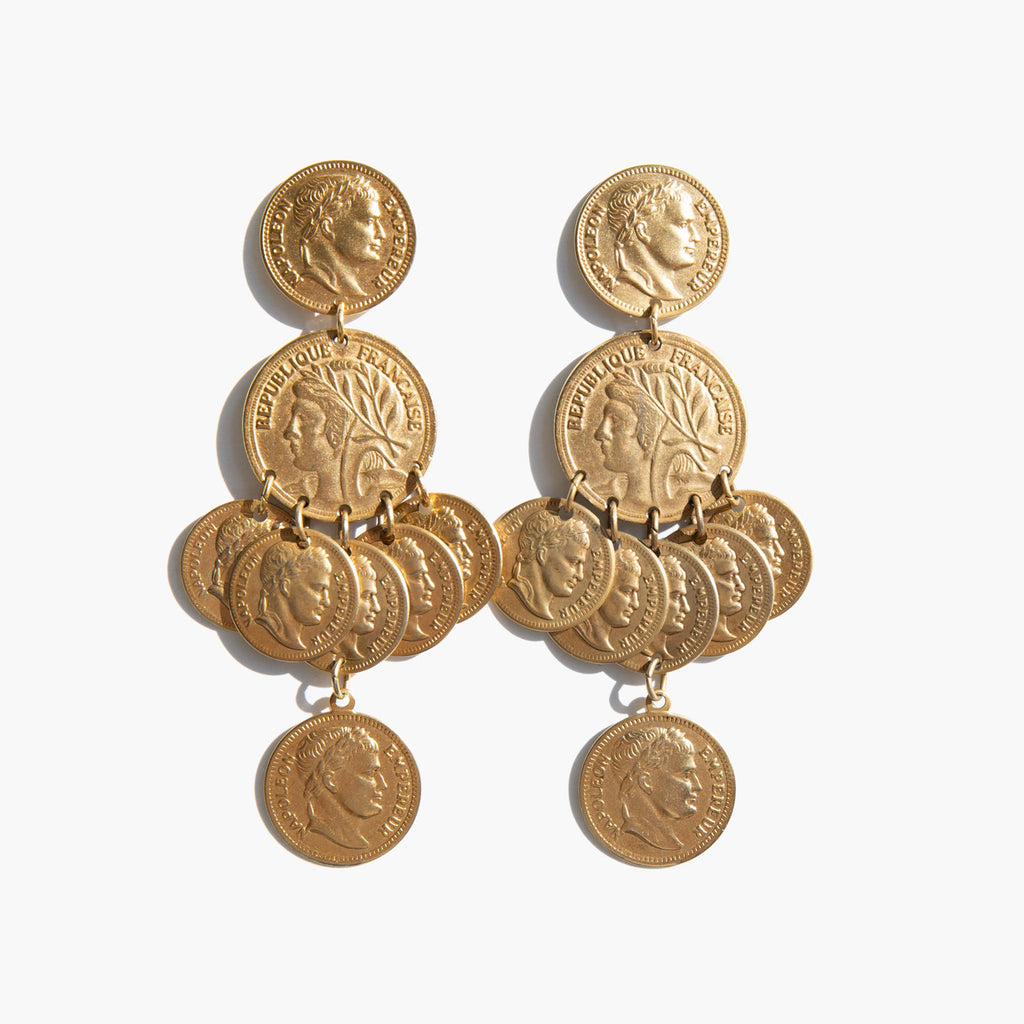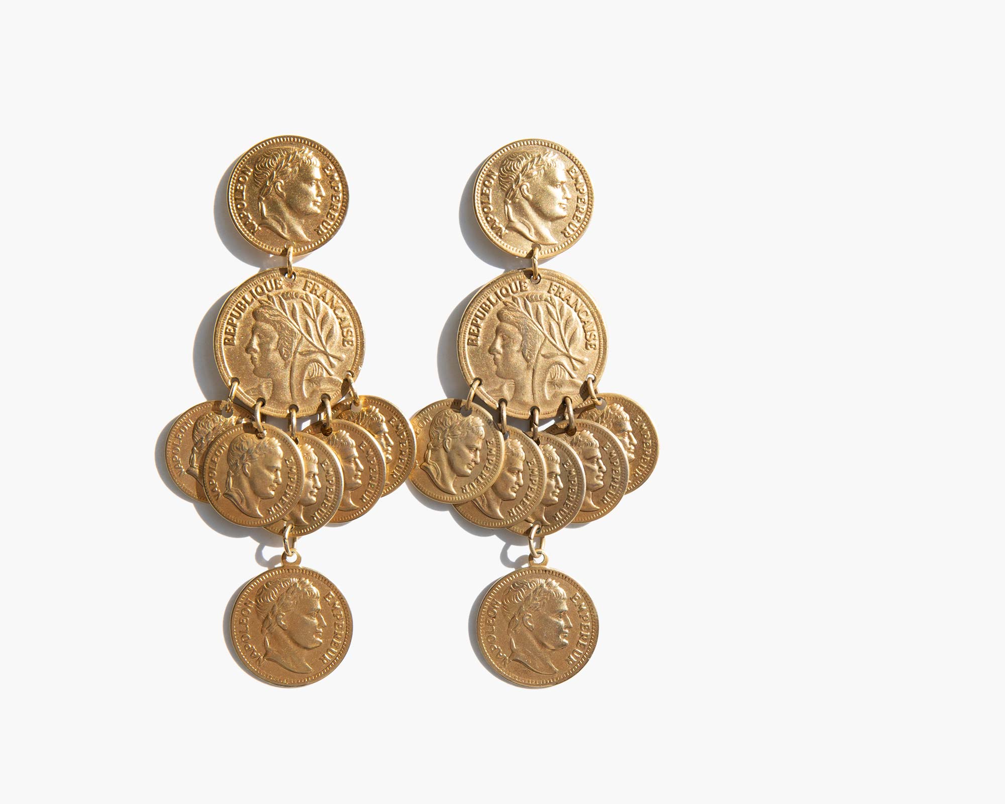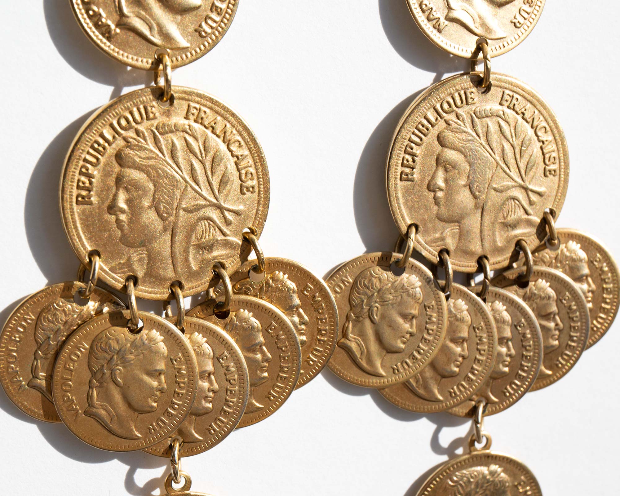 Costume chandelier earrings made with cascading reproduction French coins. Backs are 14k gold.