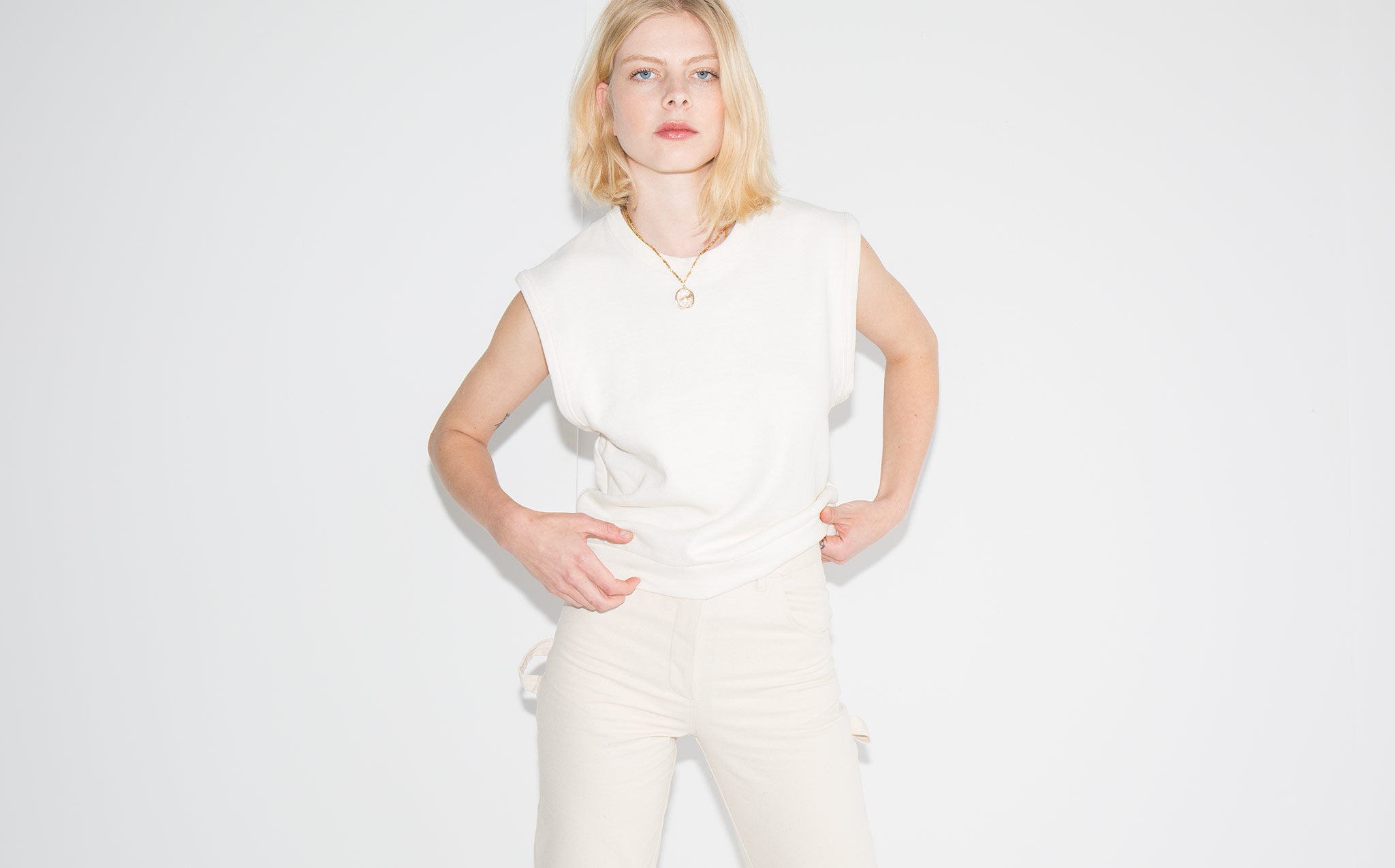 A 90s inspired sleeveless and cropped, crew neck, lightweight fleece.