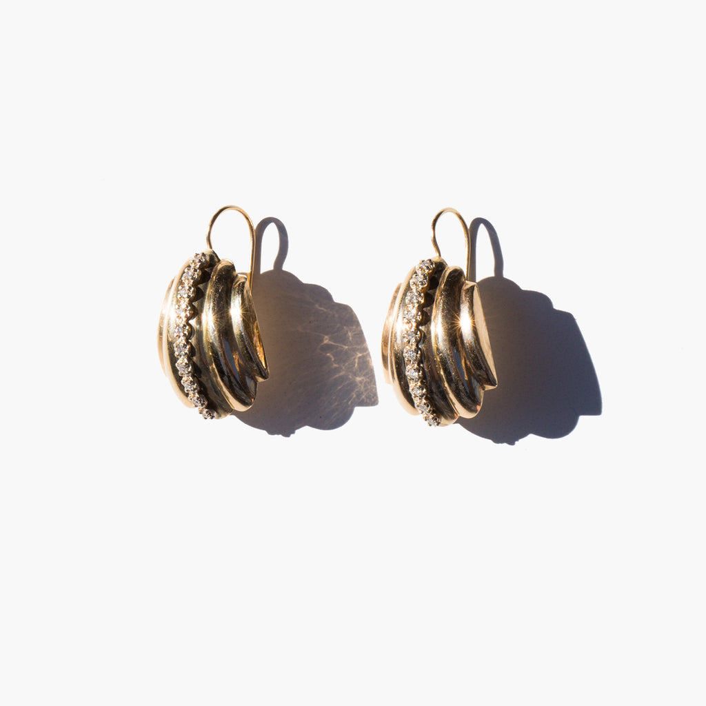 Deco style 14k gold earrings with diamond accents.