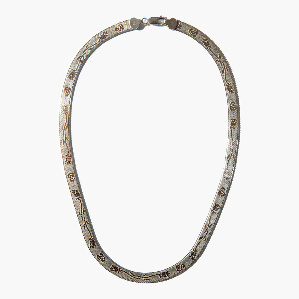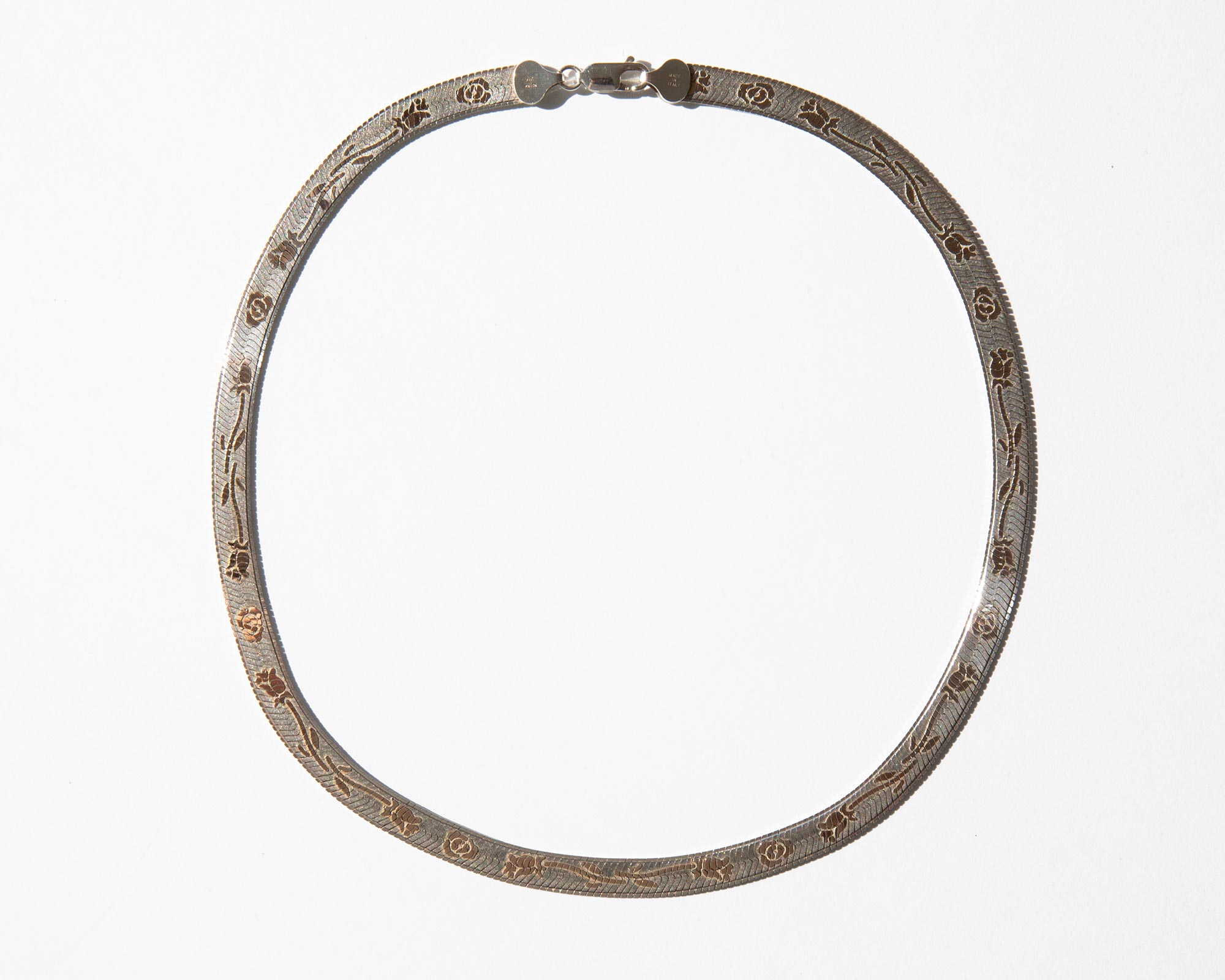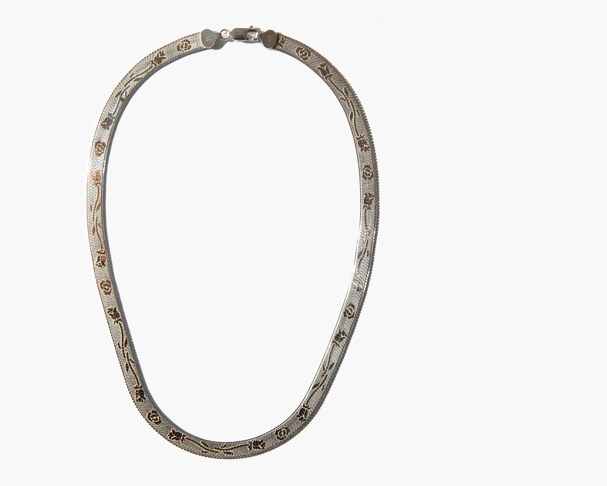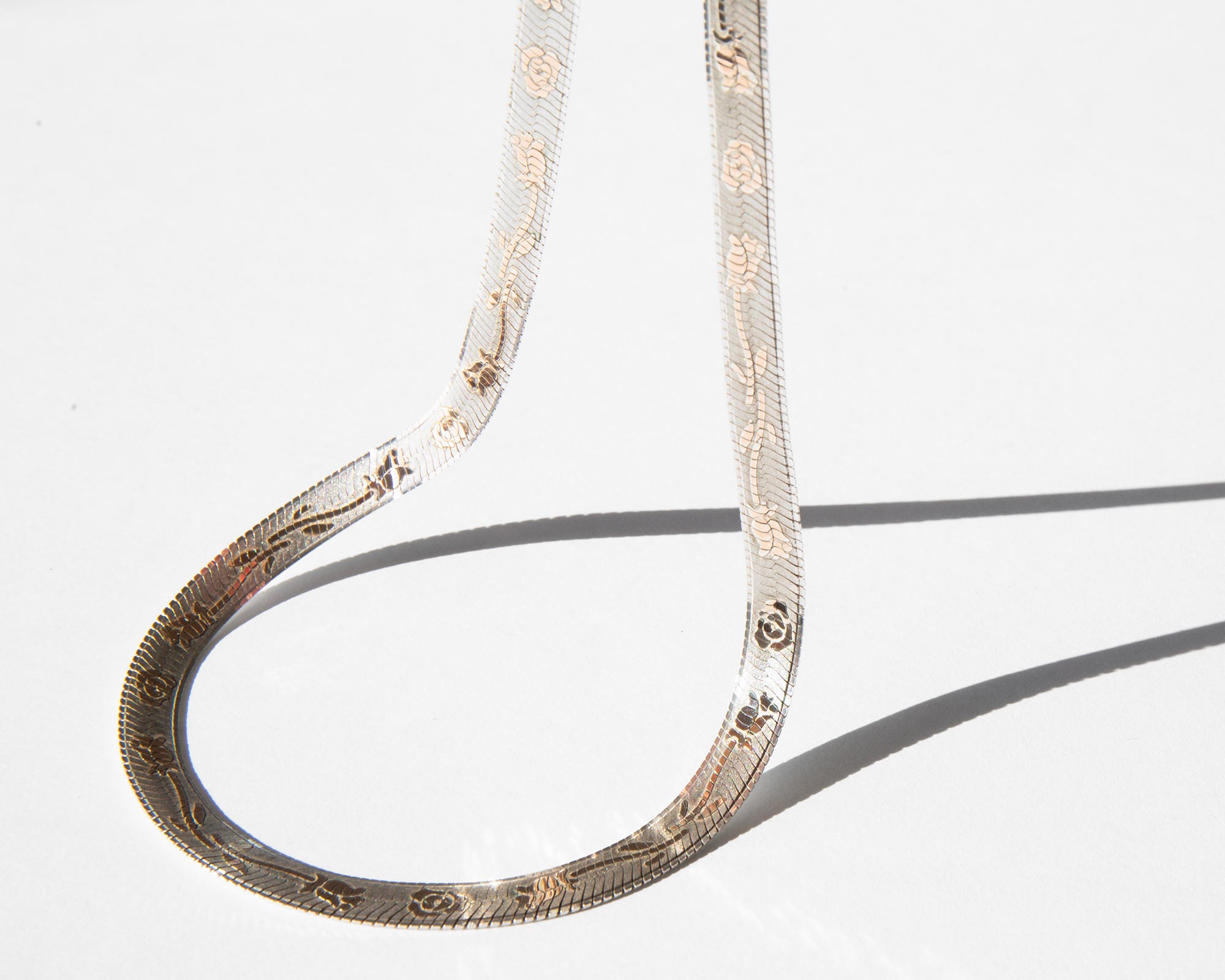 Italian two-tone sterling silver herringbone chain with gold wash roses.