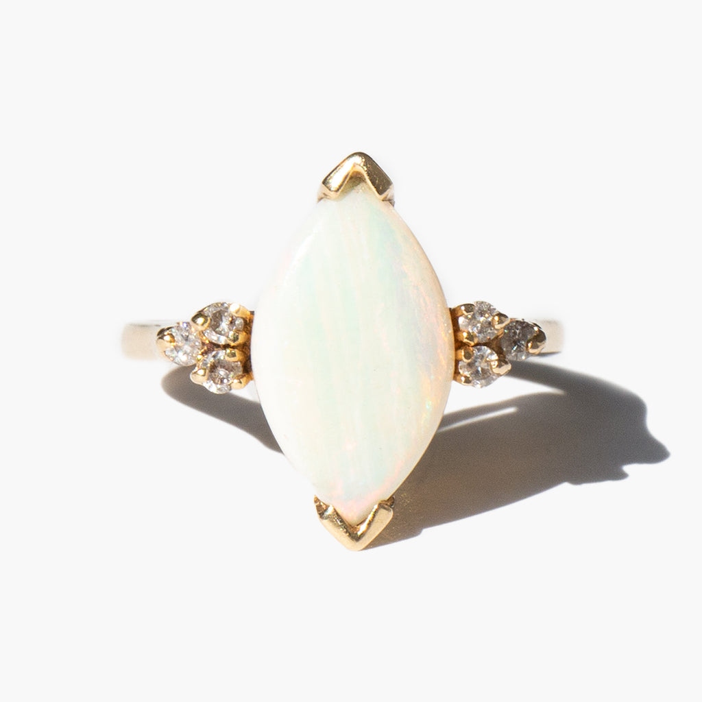Simple 14k gold ring with a radiant, sherbet toned marquis cut opal stone accented with small diamonds.