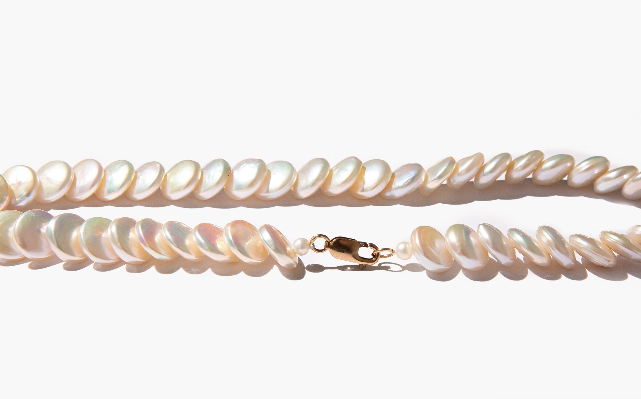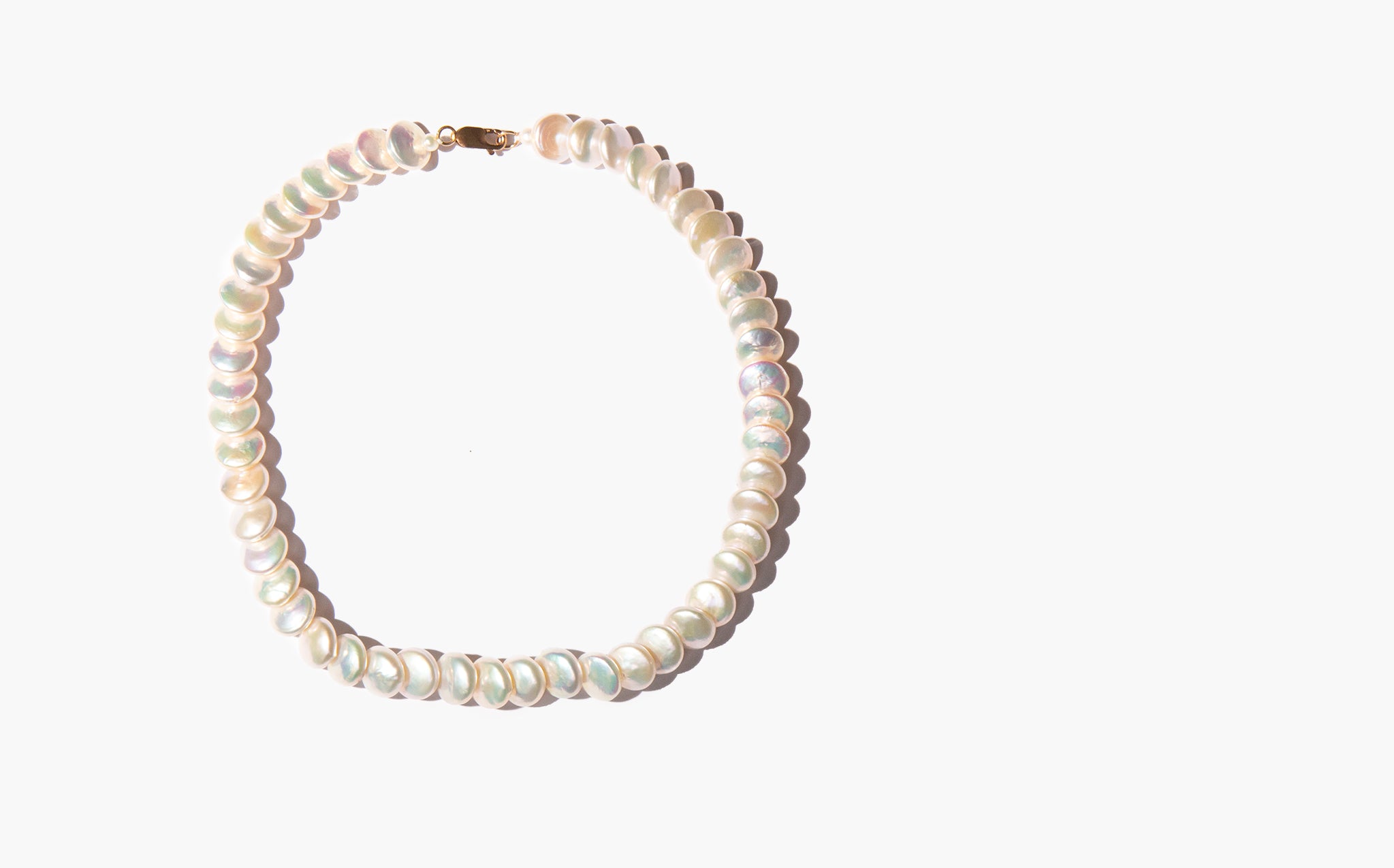 Pretty strand of freshwater pearls with ethereal iridescence, and a gold-filled catch. Chic and simple alone and an amazing layering piece with gold chains.