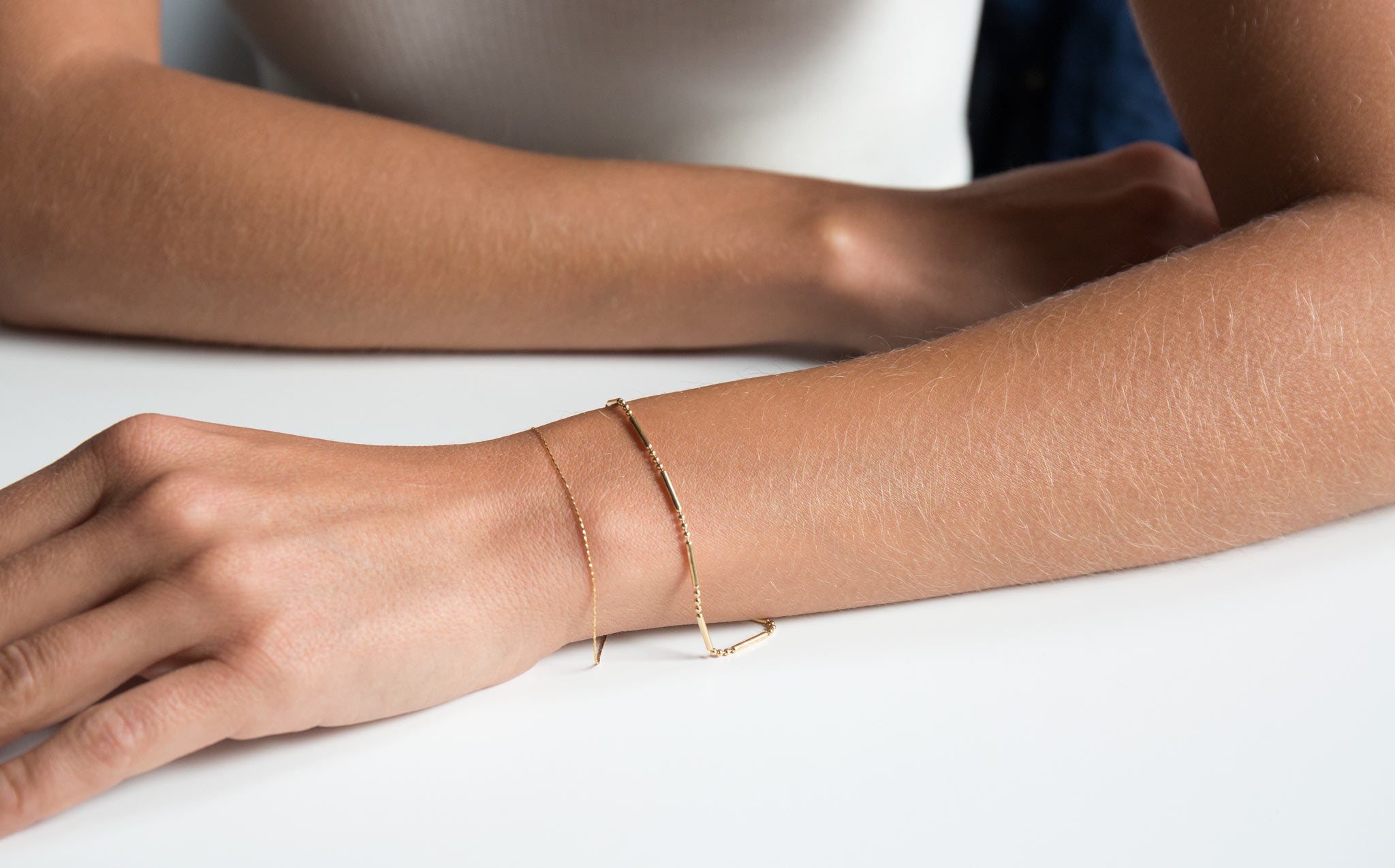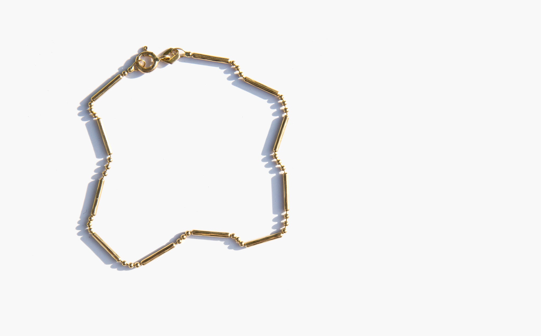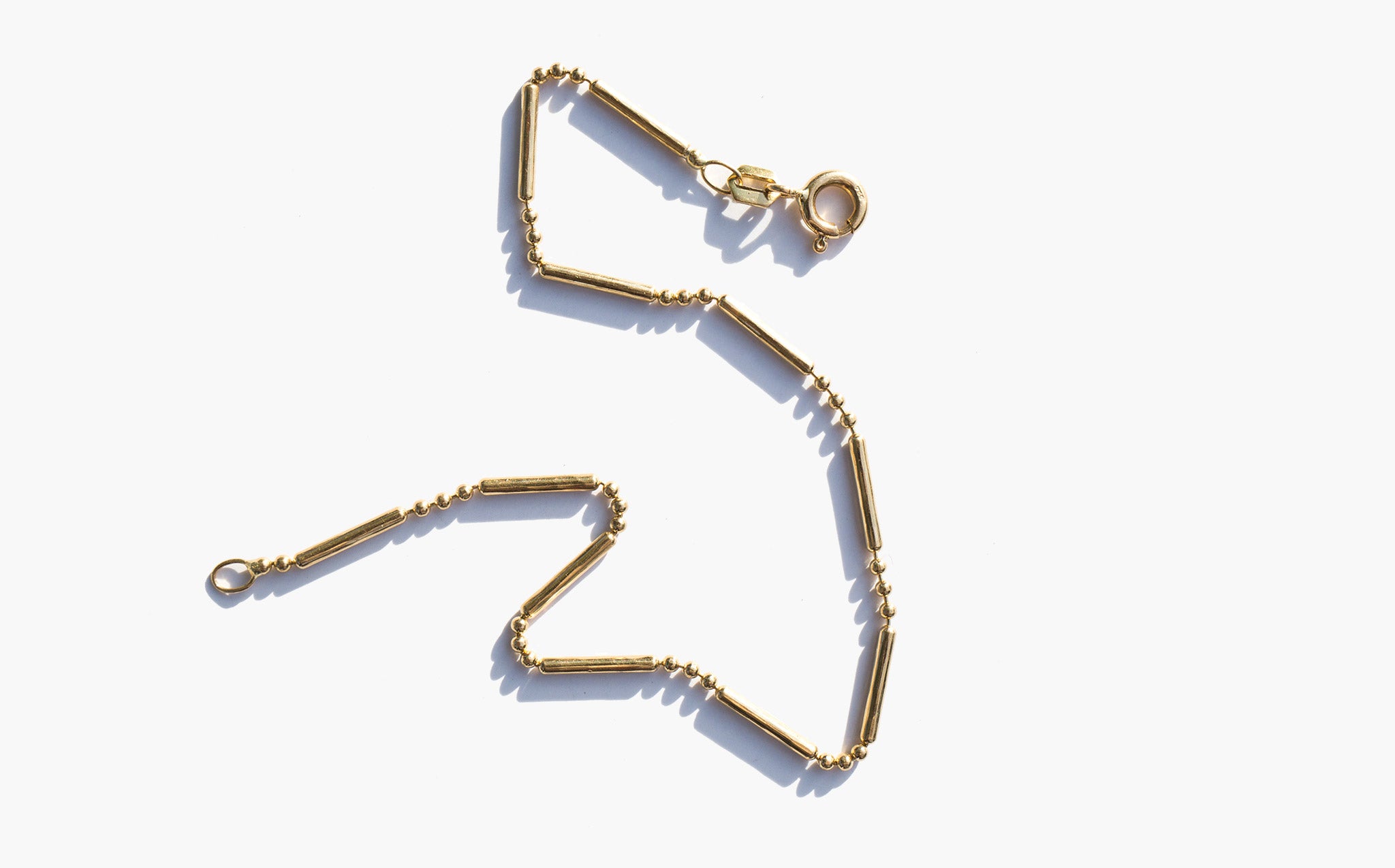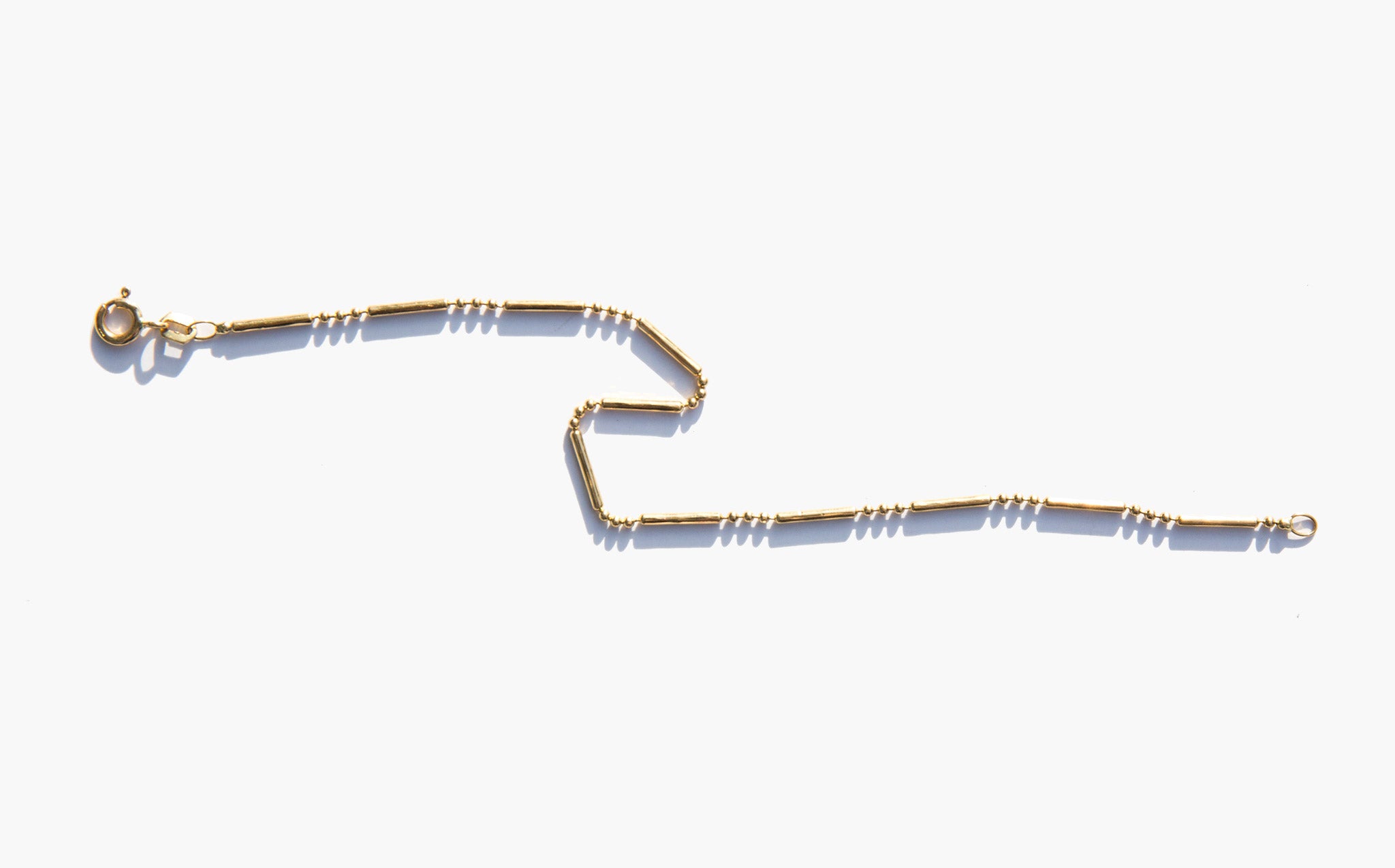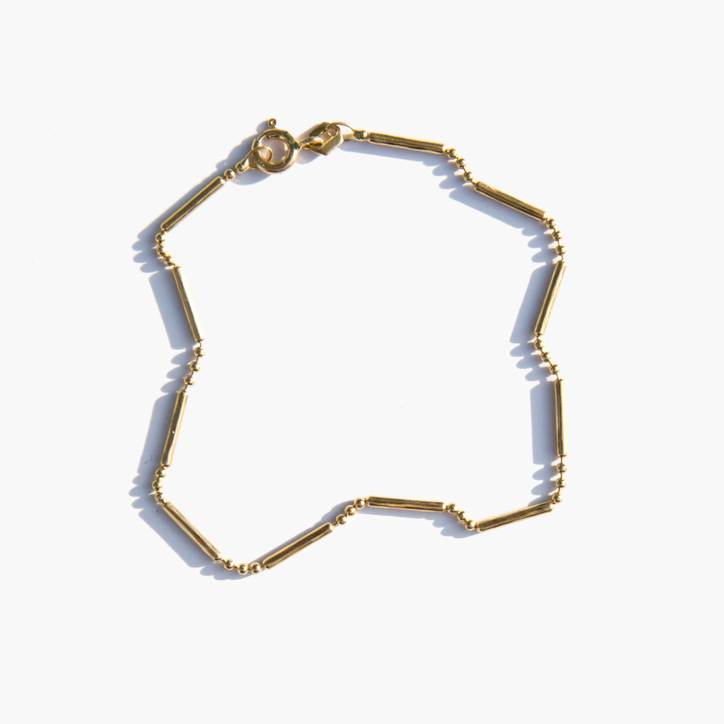 Delicate 14k gold chain bracelet with an interesting link of beads and bars.
