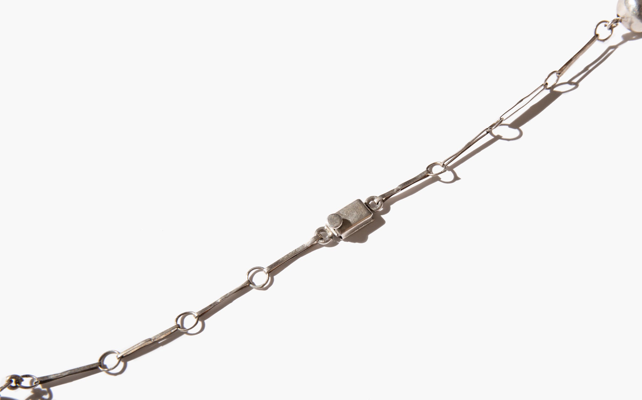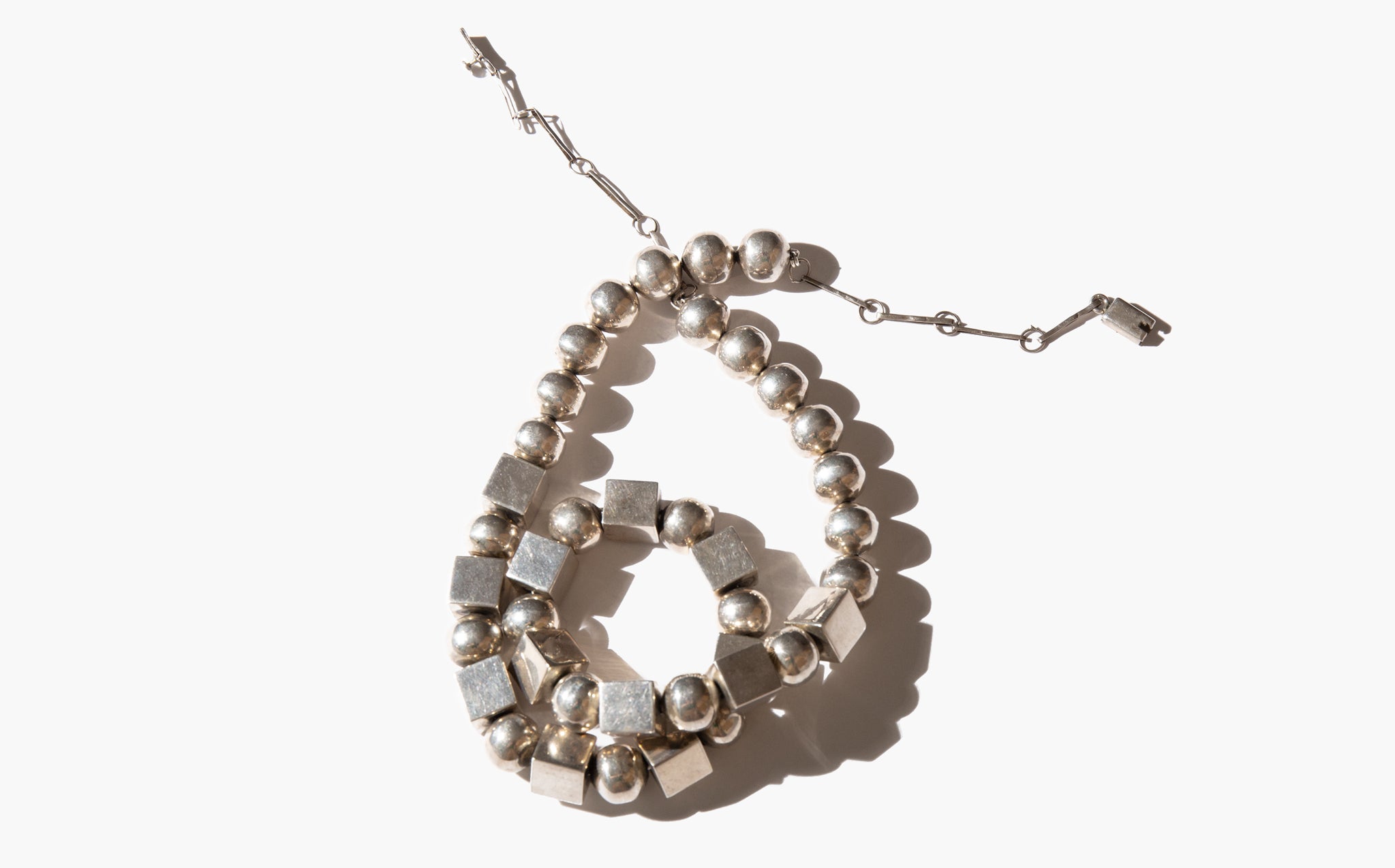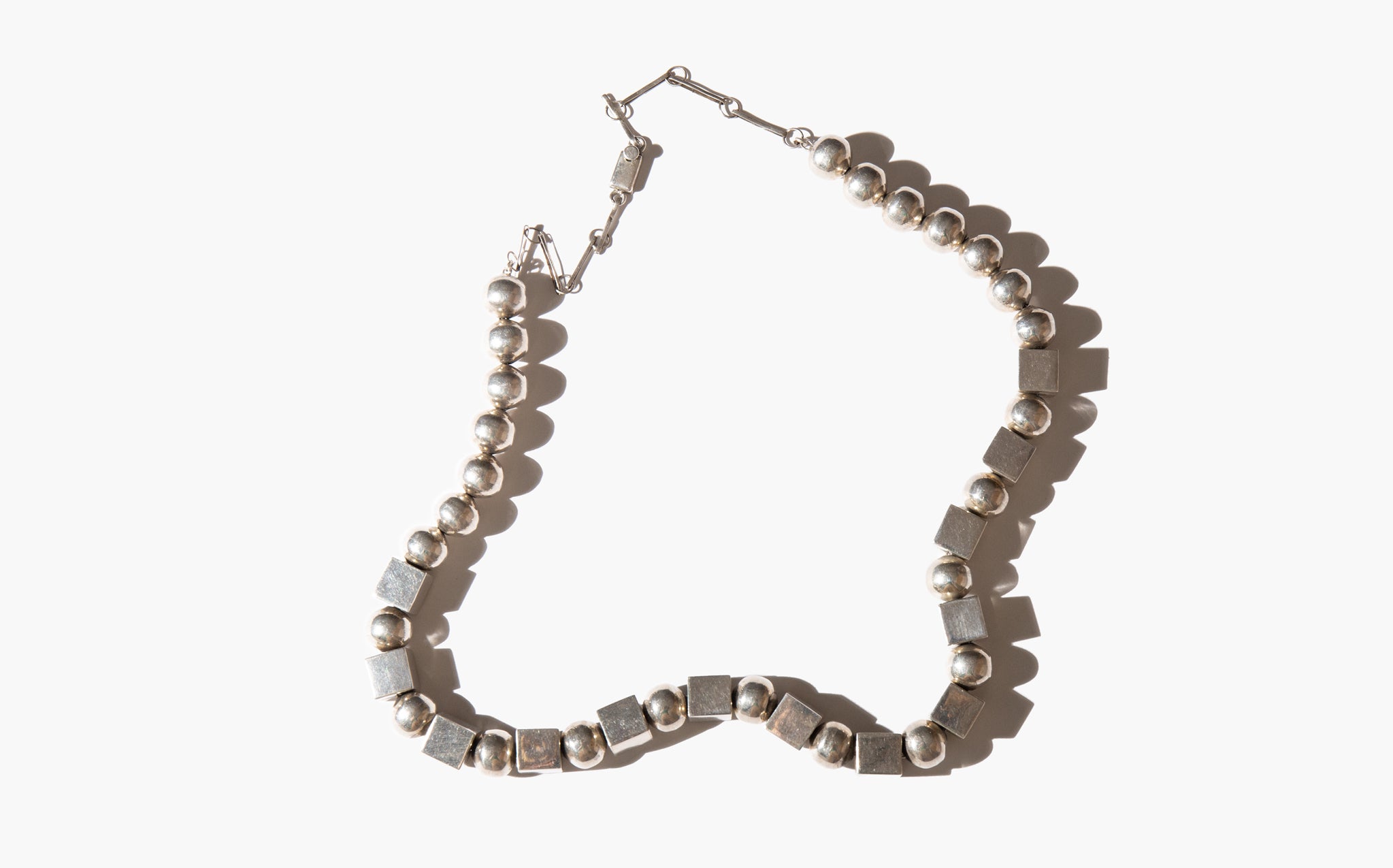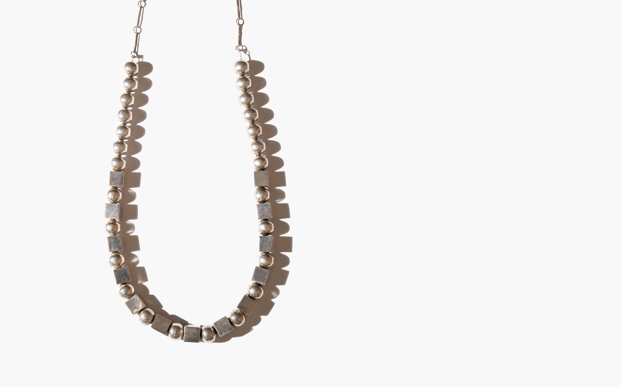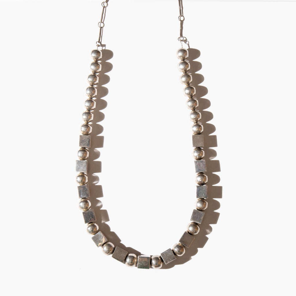 Sculptural handmade Mexican sterling silver necklace of spheres and cubes harmoniously suspended from a sterling silver link chain.