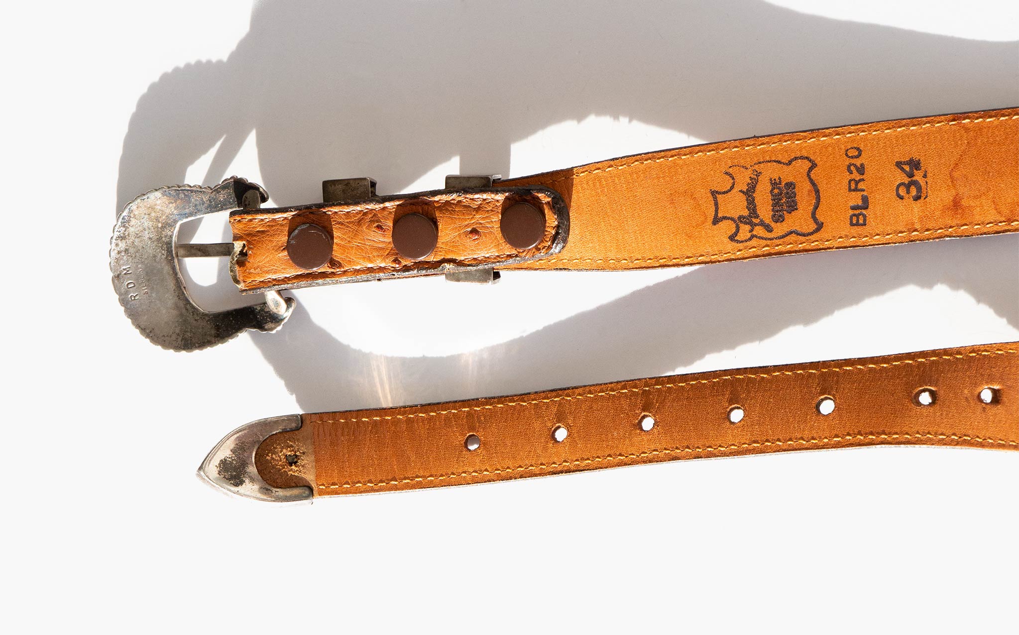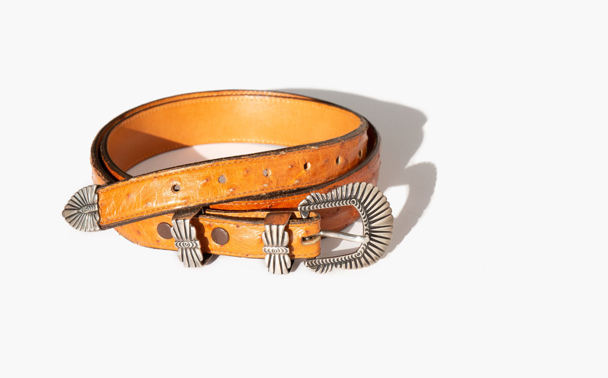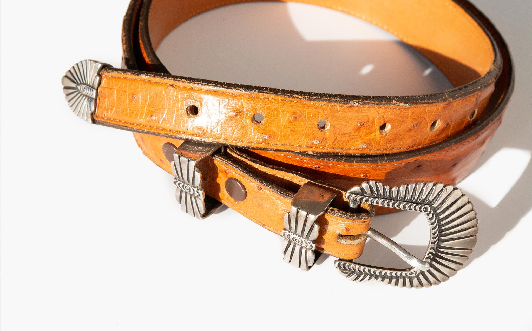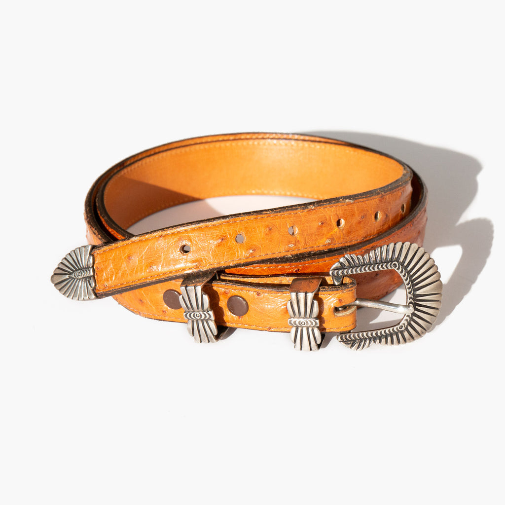 Vintage Lucchese ostrich leather belt with a solid sterling silver heirloom quality Randall D. Moore buckle and tip made in Taos, New Mexico.