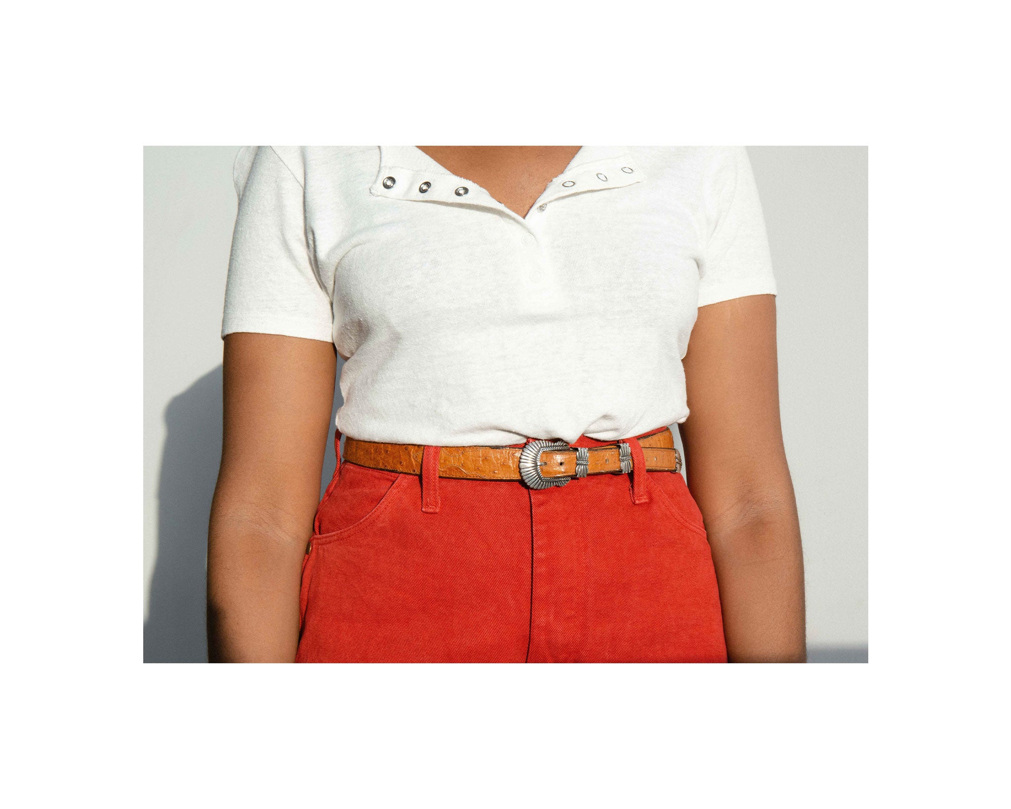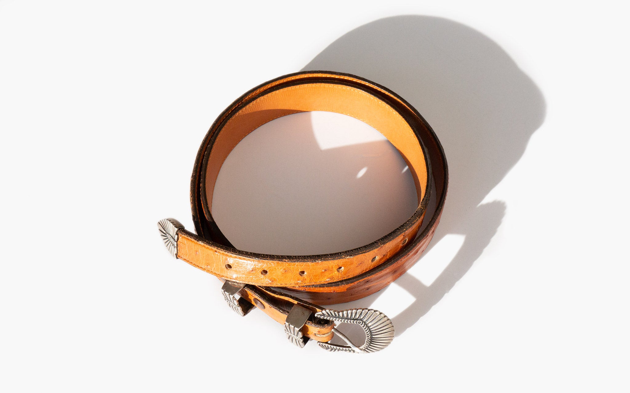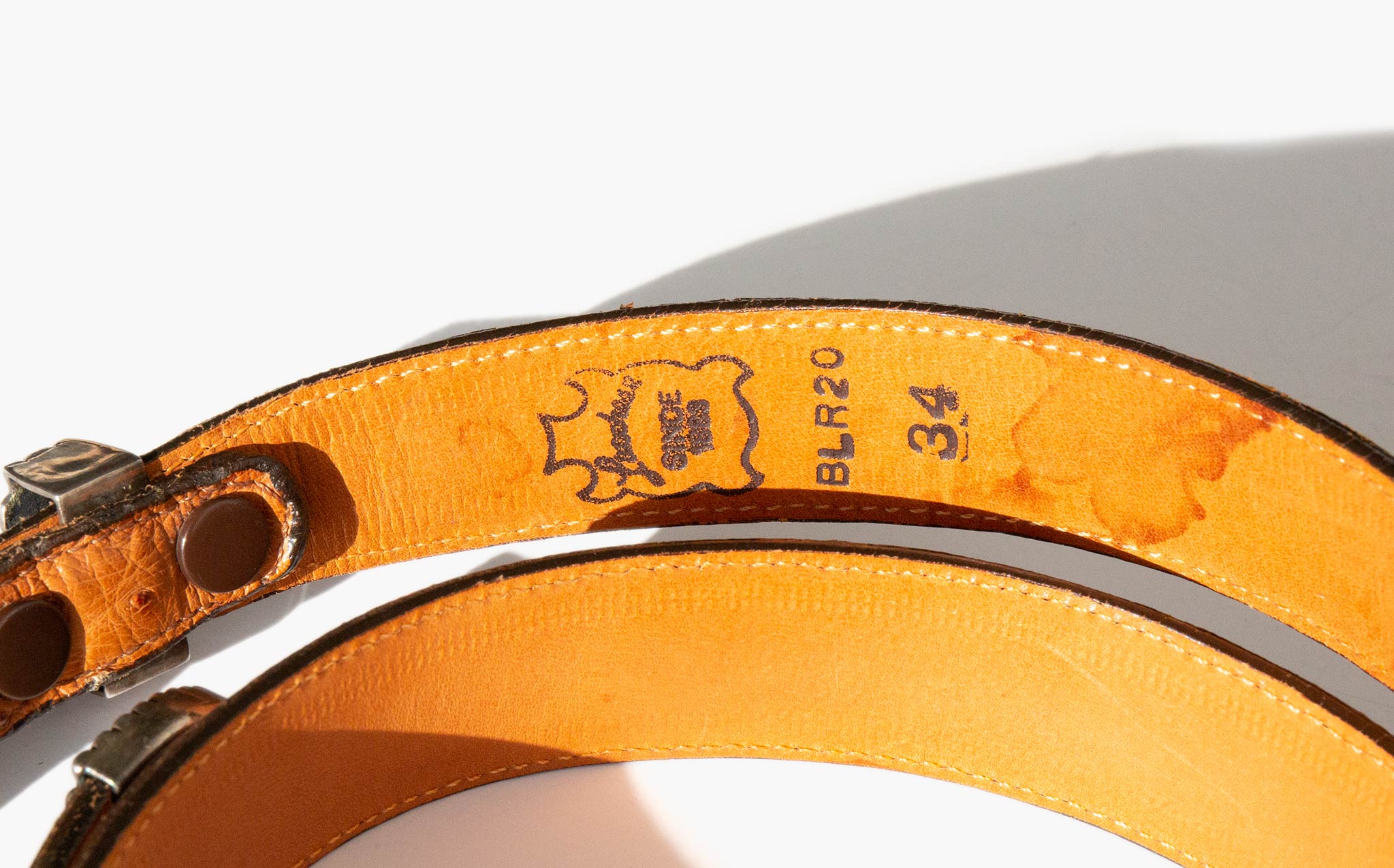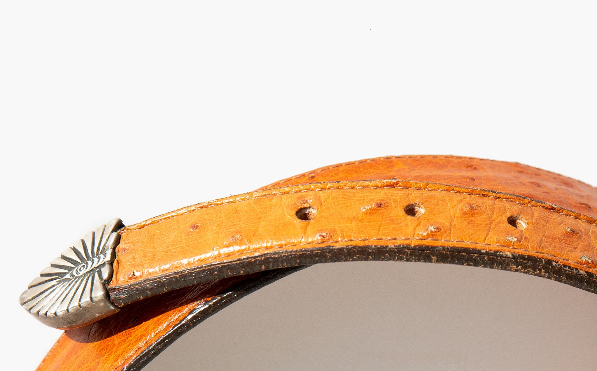 Vintage Lucchese ostrich leather belt with a solid sterling silver heirloom quality Randall D. Moore buckle and tip made in Taos, New Mexico.