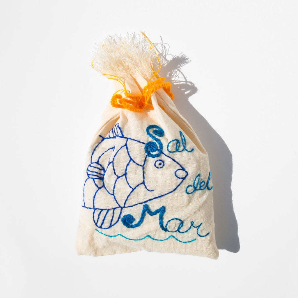 The embroidered natural muslin bags are made by hand in a small village called Sabinito, in Sonora, Mexico. The women of Sabinito are known for their skillful embroidery and Sal del Mar creates opportunities for them to earn money, while still being able to stay home and care for their children. Each bag has personal artistic embellishments from the artisan embroiderer who made it.